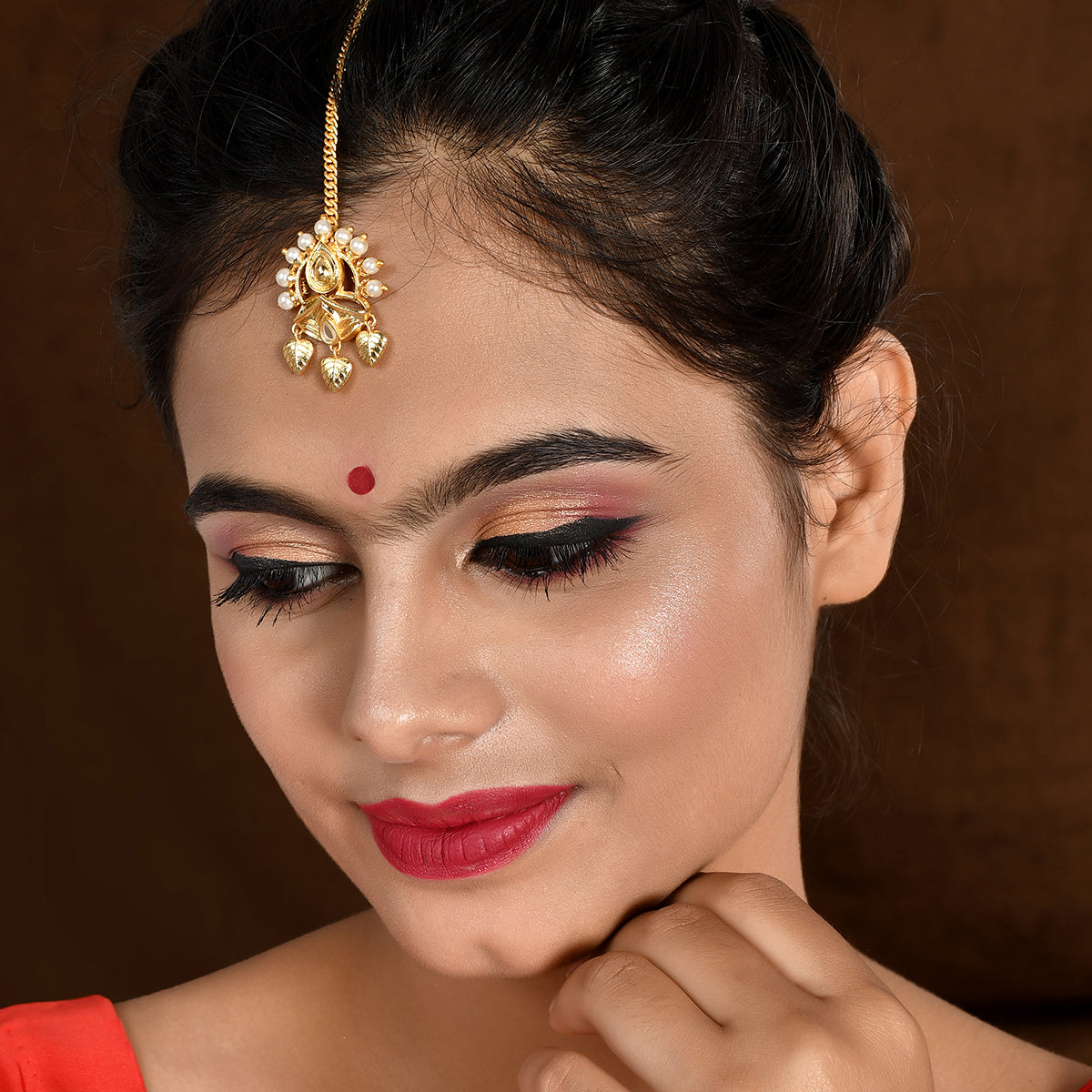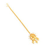 The beauty and essence of devotional Indian festivals have inspired this traditional Maangtikka, which has been fashioned out of brass. The Maangtikka have been embellished with white pearls and red stones. Yellow gold plated and a good match for ethnic...