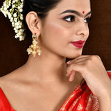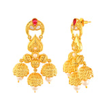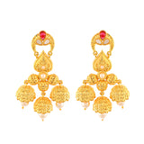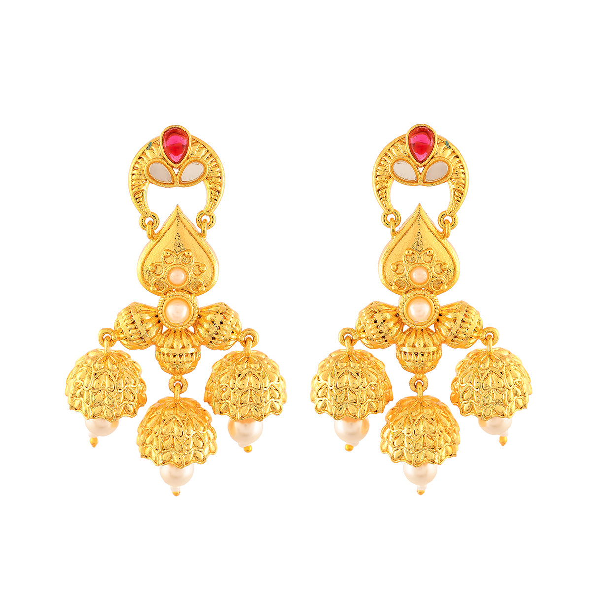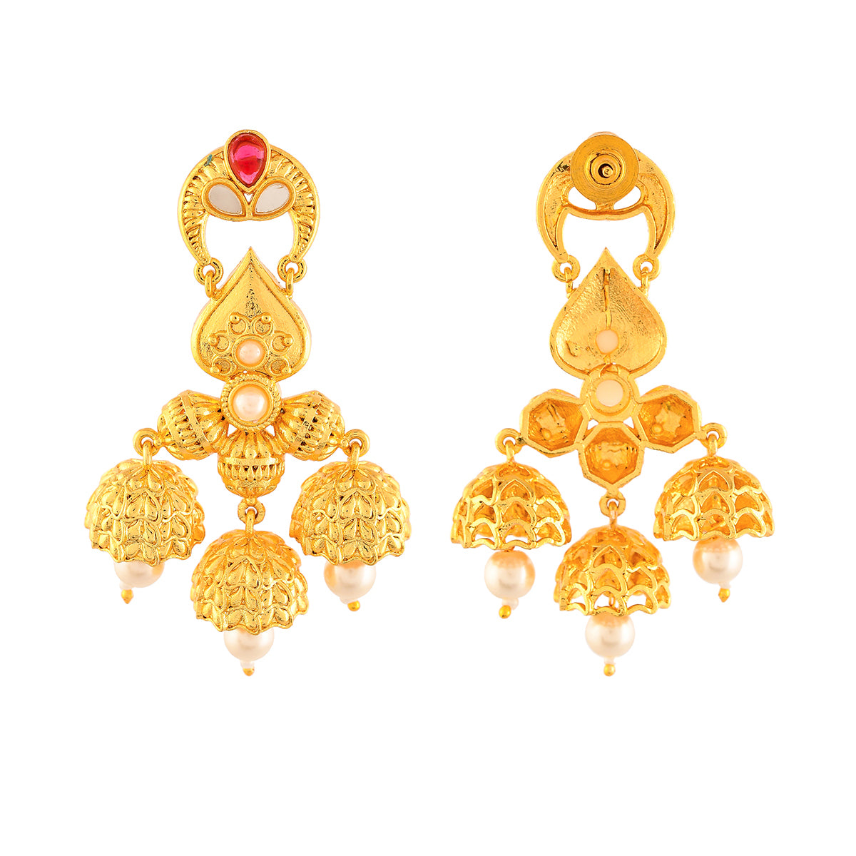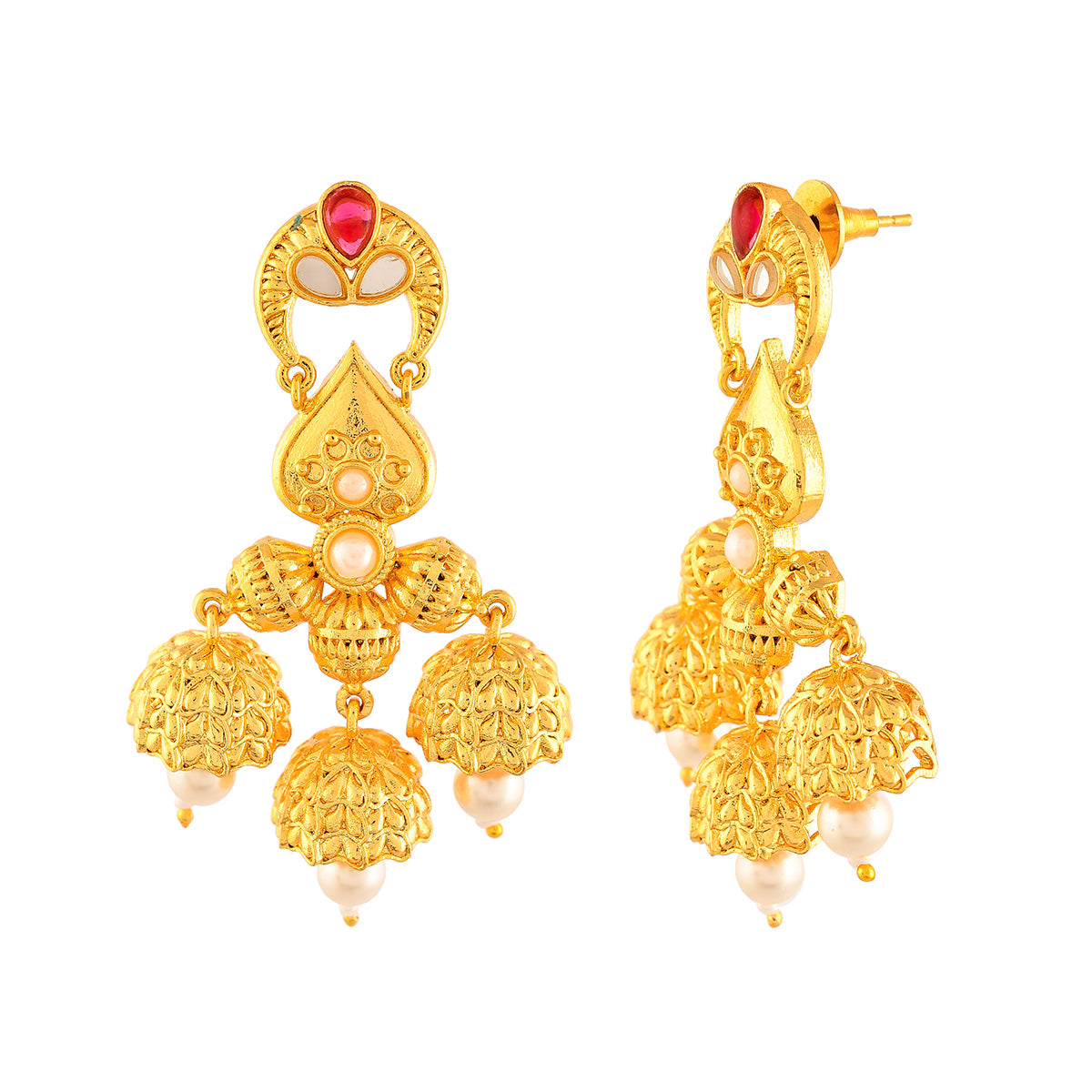 Inspired by the beauty and essence of devotional Indian festivals, this opulent ethnic earrings have been fashioned out of brass. Embellished with white pearls and red stones, the yellow gold plated earrings are comfortable and versatile.
