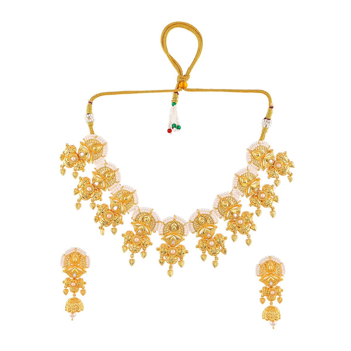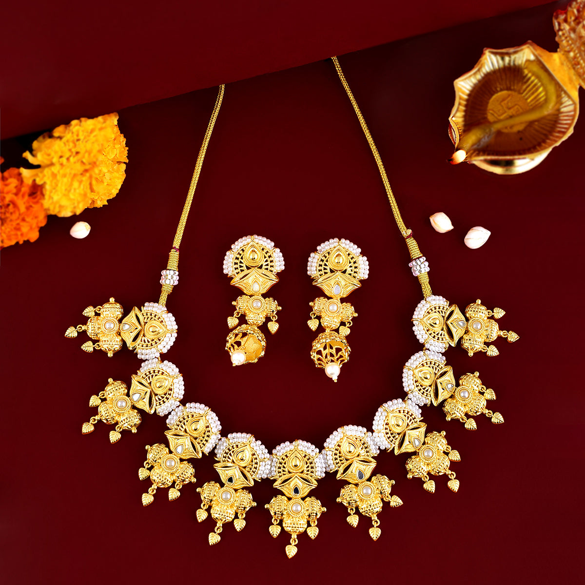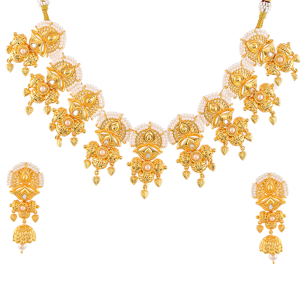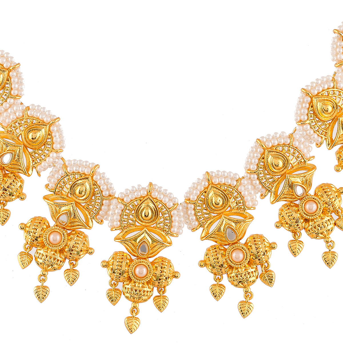 The beauty and essence of devotional Indian festivals have inspired this traditional jewellery set, which has been heavily embellished with white pearls. Made from brass and yellow gold plated, the necklace and drop earrings can be paired with a wide range of Indian and Indo-Western looks.