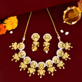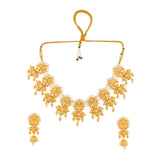 The beauty and essence of devotional Indian festivals have inspired this opulent jewellery set, which has been given a lovely cutwork design. Made from brass and yellow gold plated, the necklace and stud earrings can be paired with a wide...
