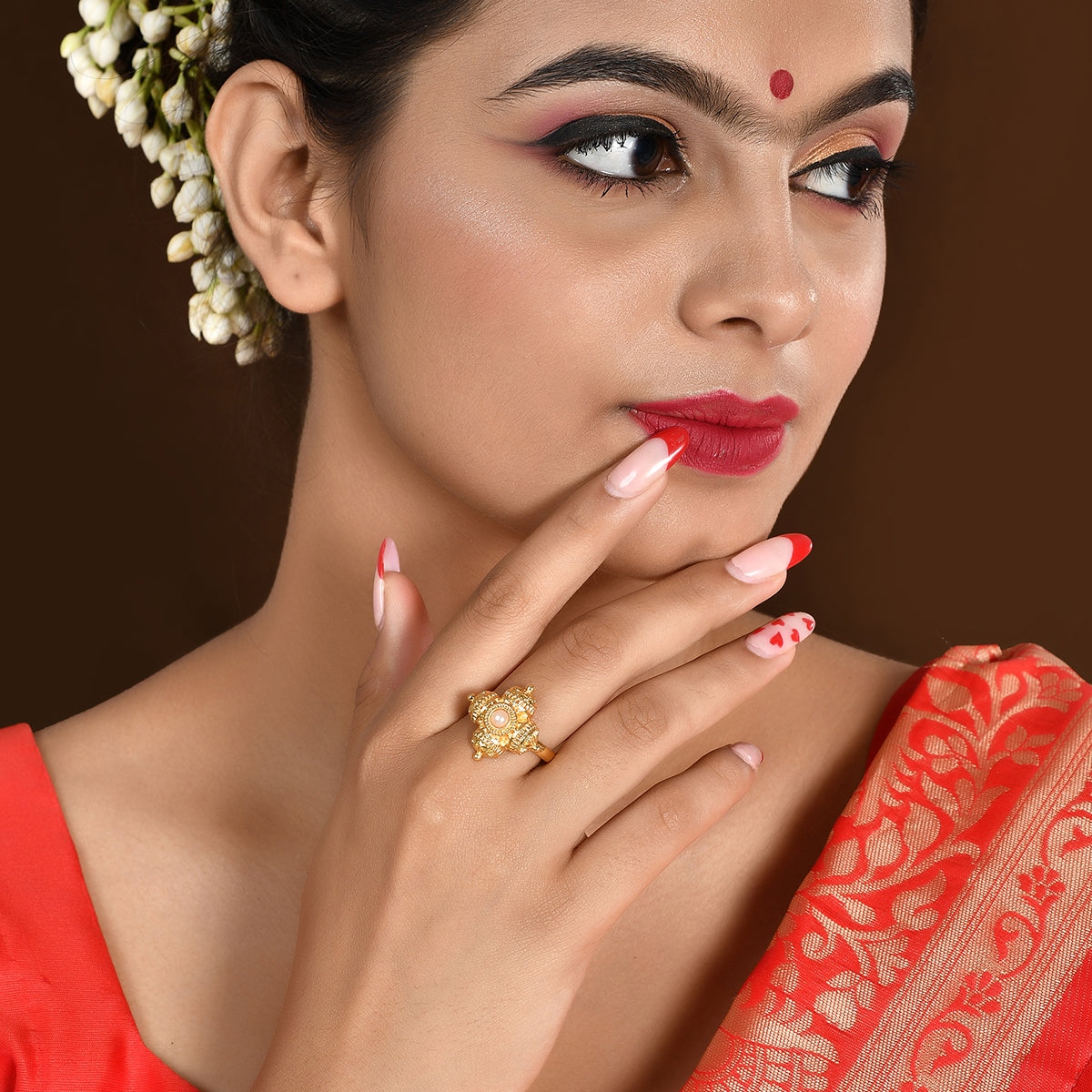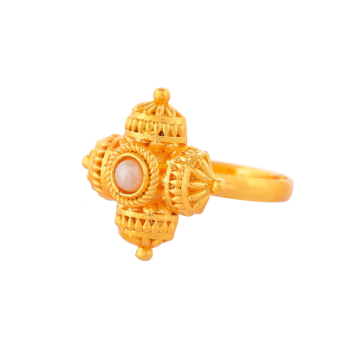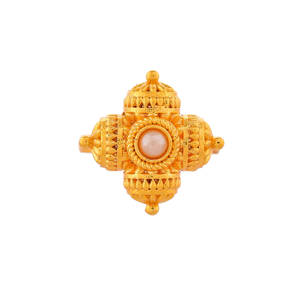An old-school yellow gold plated ring in a classic traditional design, inspired by the essence of Indian festivals. Embellished with a single white pearl and made from brass. A good match for ethnic looks.