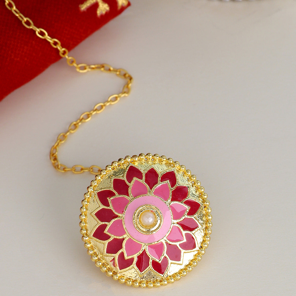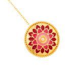 Embossed with an enameled floral motif, this maang tika has ben fashioned out of brass. Yellow gold plated and good for ethnic looks. This piece of jewelry comes with the Voylla assurance of quality and durability.