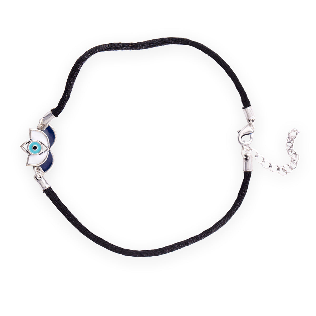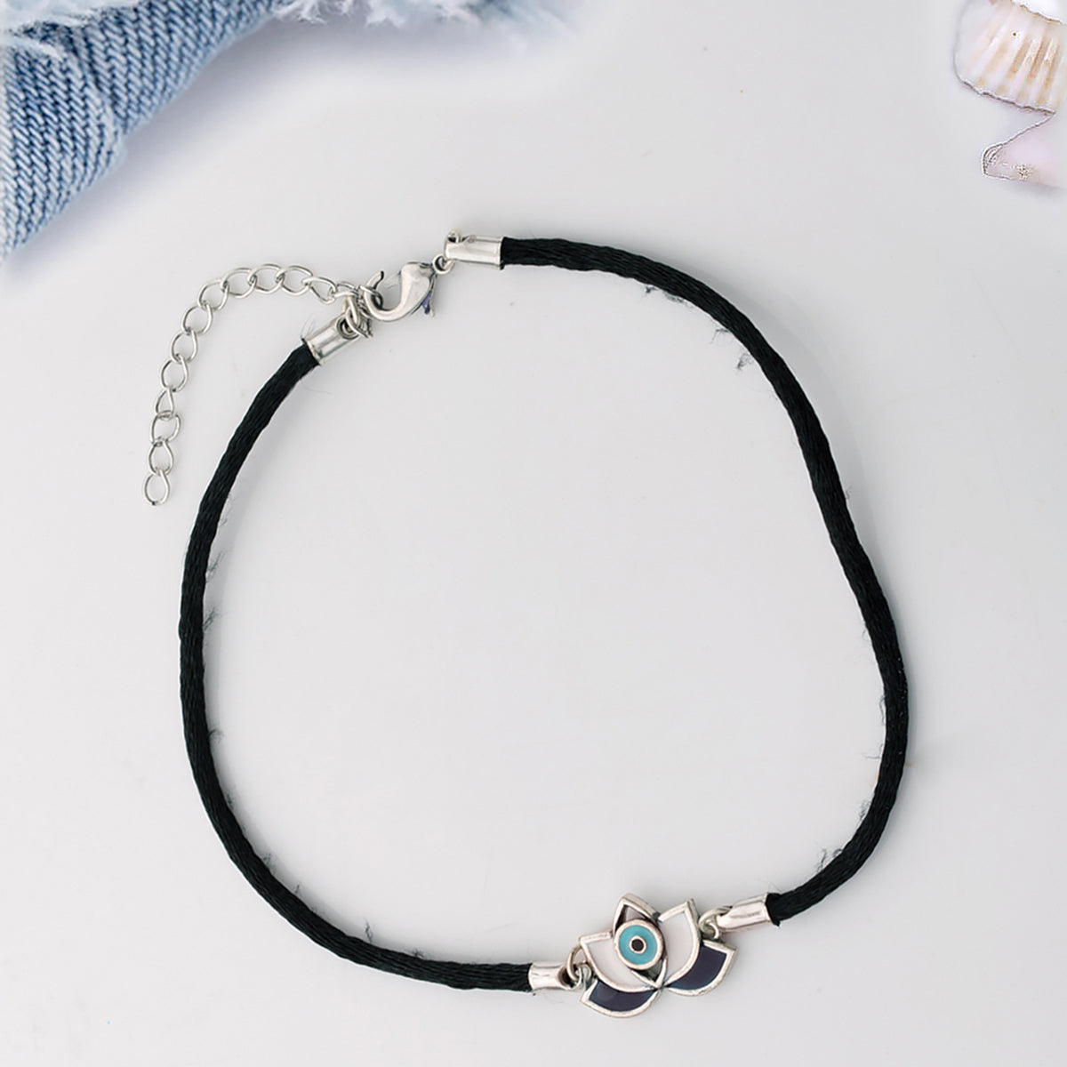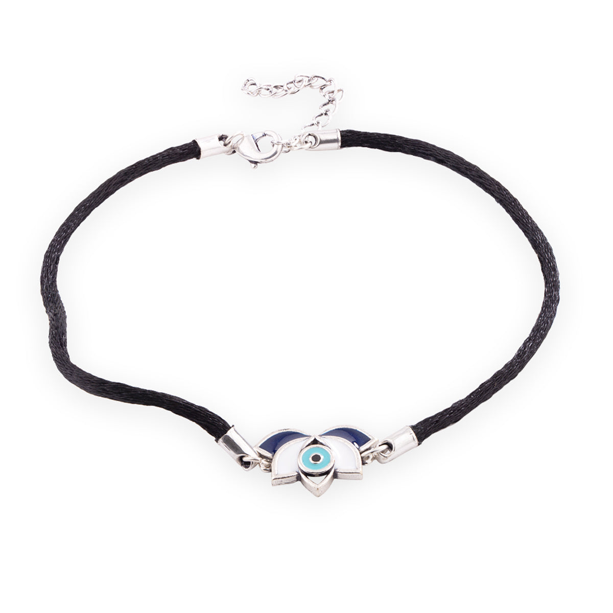 Enamelled eye motif anklet, fashioned out of brass and oxidised plated. Lightly embellished, the anklet can be paired with Indo-Western and Bohemian looks.Weight (Gms): 6.6Size (LxW)(Inch): 13*0.5Material: BrassPlating: Oxidized SilverColor: SilverSales Package: 1 AnkletsProduct Code: 8905124129588