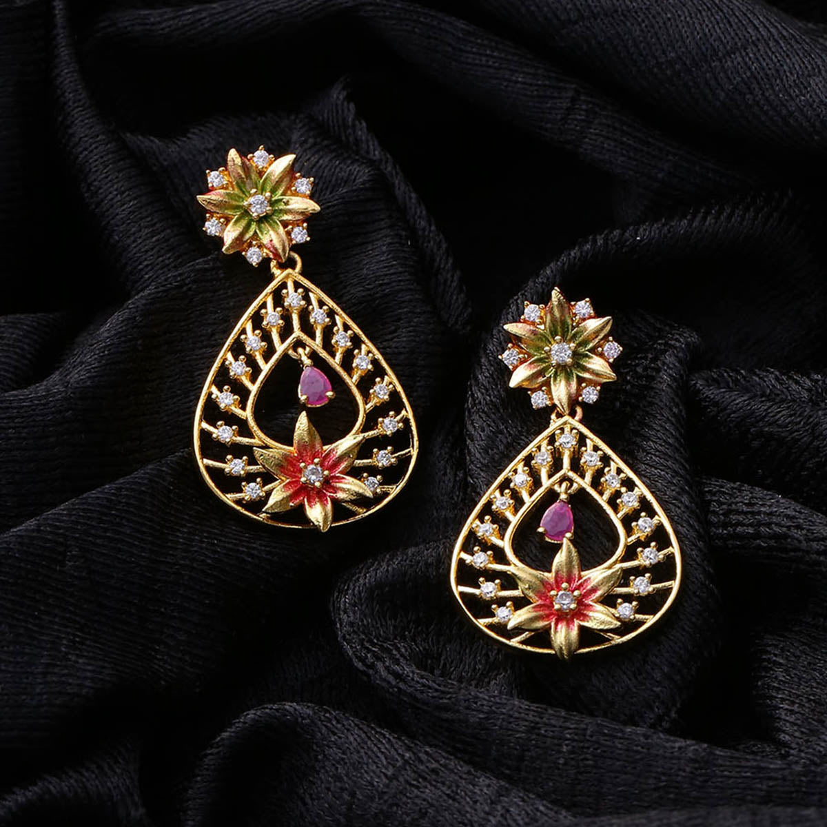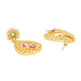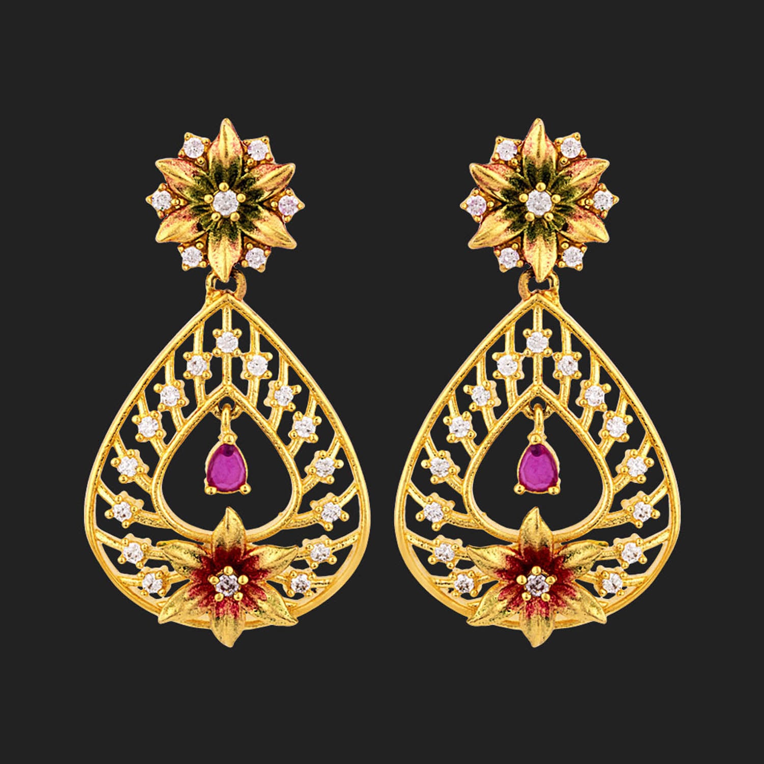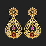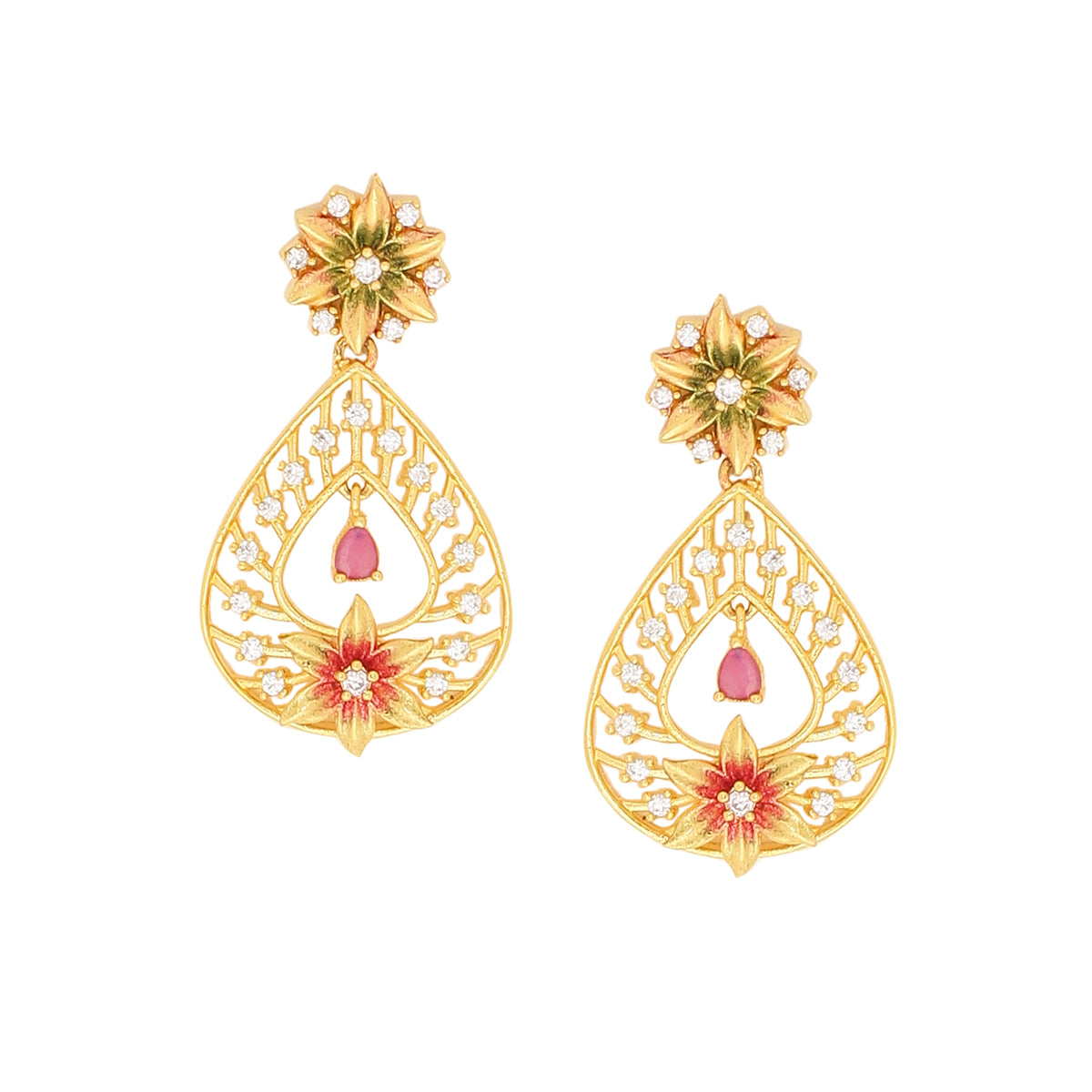 Hoop drop earring made from brass and embellished with gems, inspired by flowers. Yellow gold plated and good for formal wear.
