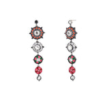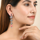 The grace, colours and quirky elegance of Rajasthan's traditional Bhavai folk dance has inspired these circles long drop earrings. Made from brass, the coloured enamel earrings have been given a silver plating that adds to their charm. Pair with Indian, Indo-Western or Bohemian attire.