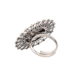 Inspired by the Bhavai dance and its colours and quirky elegance, this cocktail ring has been fashioned out of brass. Silver plating and colourful enamel add to the charm of this adjustable piece, which is lightweight and comfortable. Versatile enough to be paired with just about everything.
