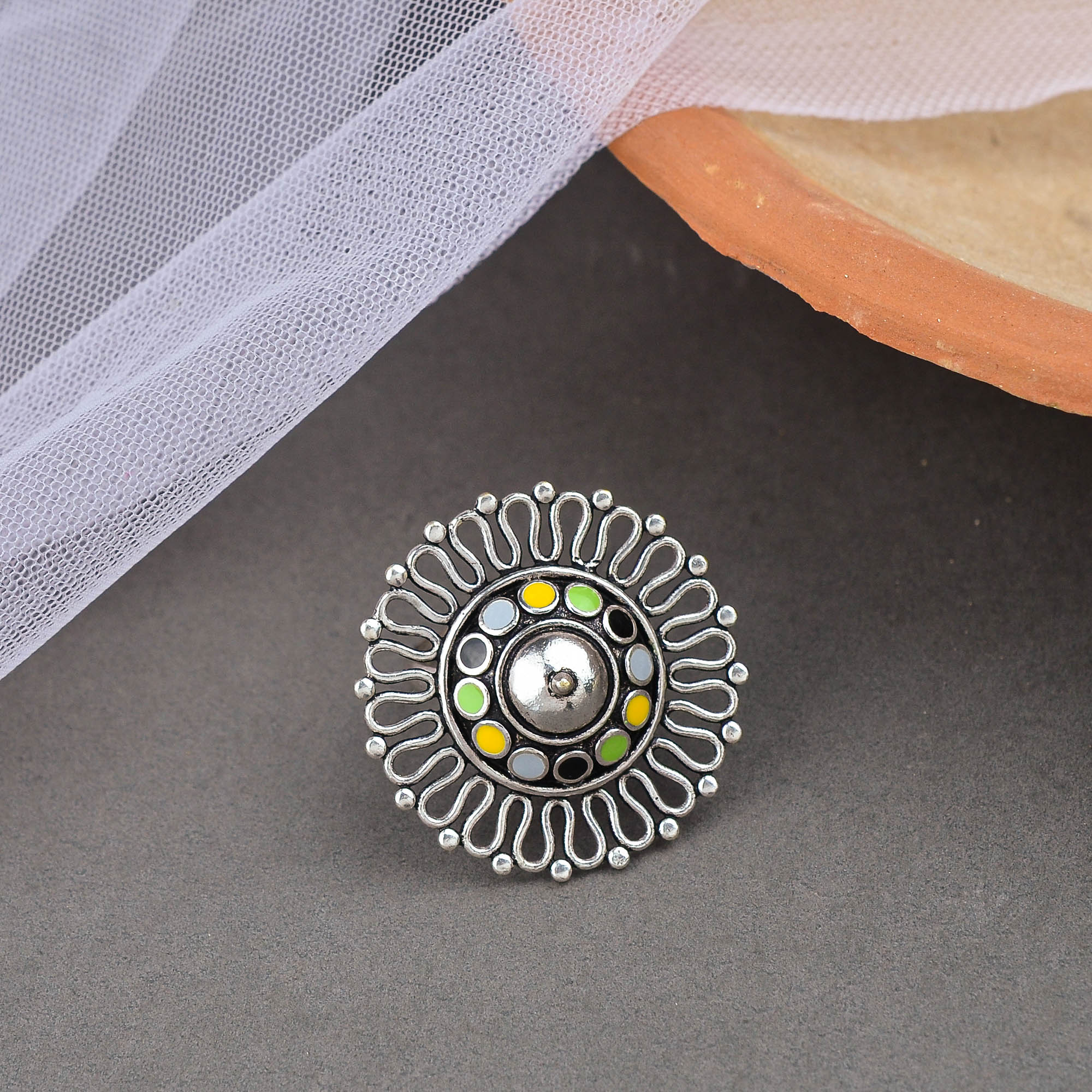 Traditional Mandala design ring with colourful enamel details. Made from brass and silver plated, the edgy Bohemian style ring is versatile and lightweight.Caring for your fashion jewelry: We, at Voylla, take care of every piece of jewelry so that you...