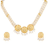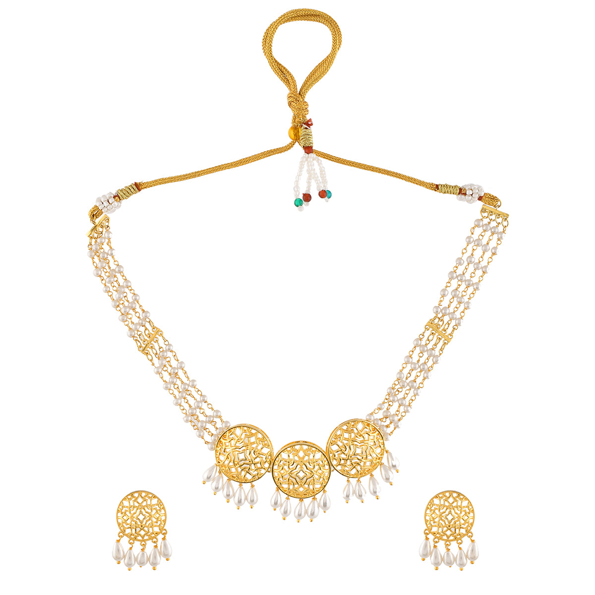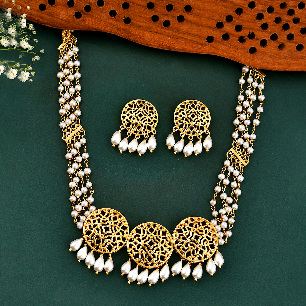 Inspired from the intricate allure of Arabesque architectural embellishments,This set features a stunning design composed of round cutwork motifs, lavishly gold-plated and adorned with lustrous pearls, creating a jewelry piece that exudes sophistication and grace.This set features a stunning design...