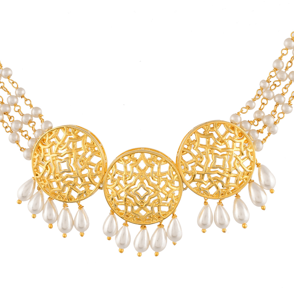 Filigree patterns inspired by classic Arabesque designs adorn this beautiful and dainty necklace set, which has been fashioned out of brass. Embellished with shell pearls and crafted for style and comfort, the necklace and matching drop earrings have been given...