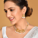 The Zara Choker Set An Architectural Masterpiece of Opulence and Elegance features a striking design, boasting a sizable round cutwork statement motif, lavishly gold-plated and paired with exquisite round studs earrings, creating a jewelry piece that radiates opulence and charm....