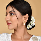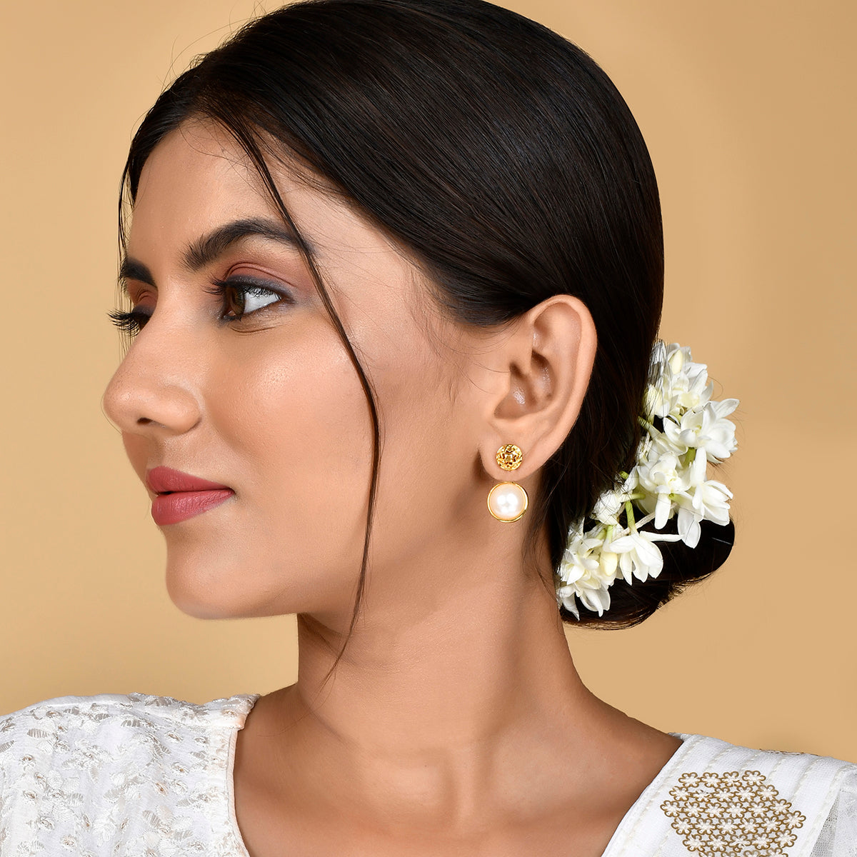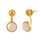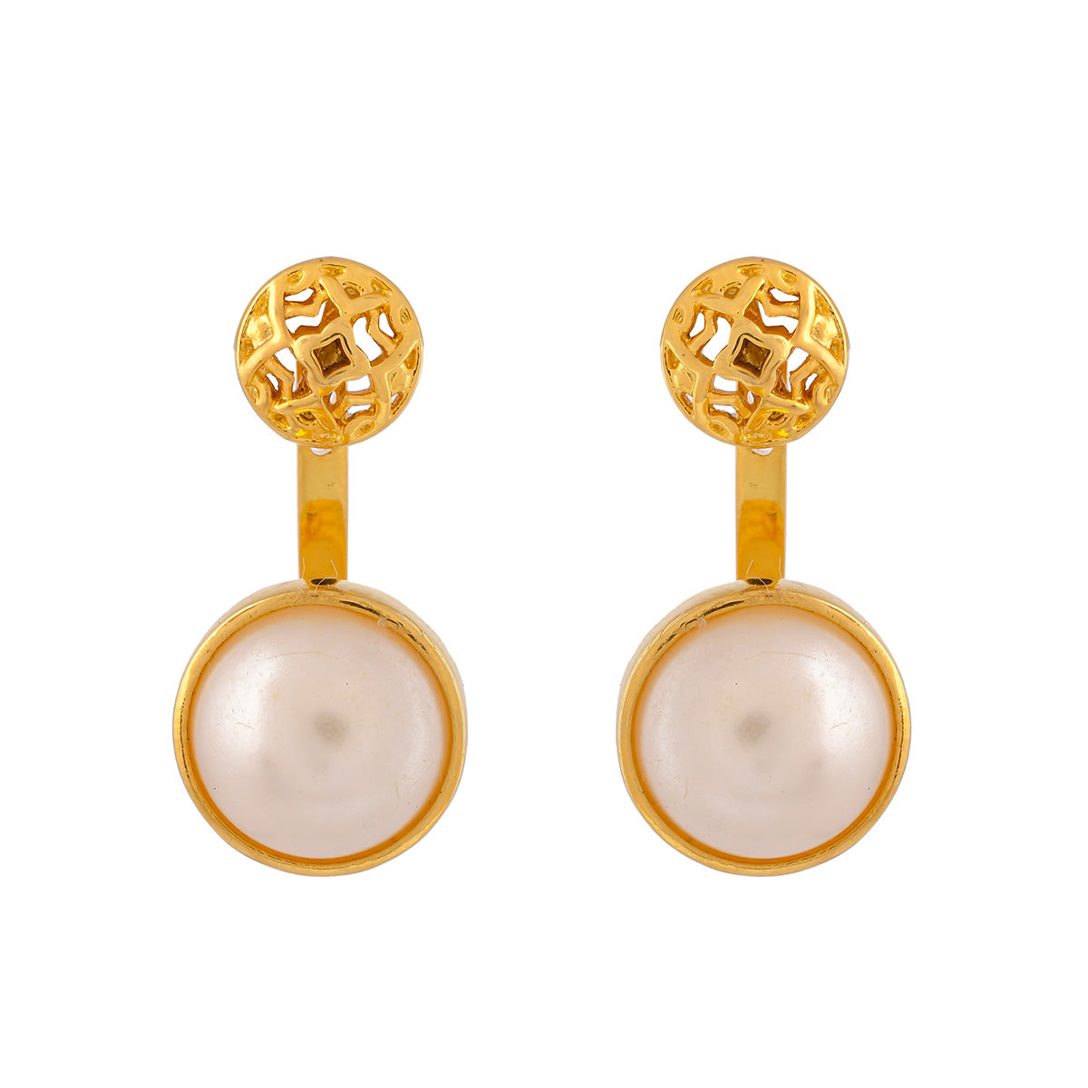 Inspired by classic Arabesque designs, these dainty yet eye-catching jacket earrings are the perfect accessory to add an unmistakable sparkle to all kinds of Indian, Indo-Western and even Western looks. Fashioned out of brass and adorned with white shell pearls, the filigree pattern earrings have been given a yellow gold plating and promise to be a comfortable wear at all times.