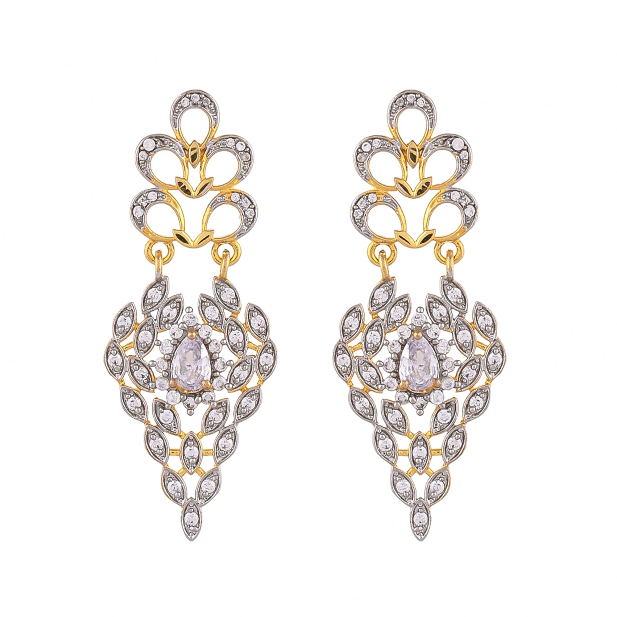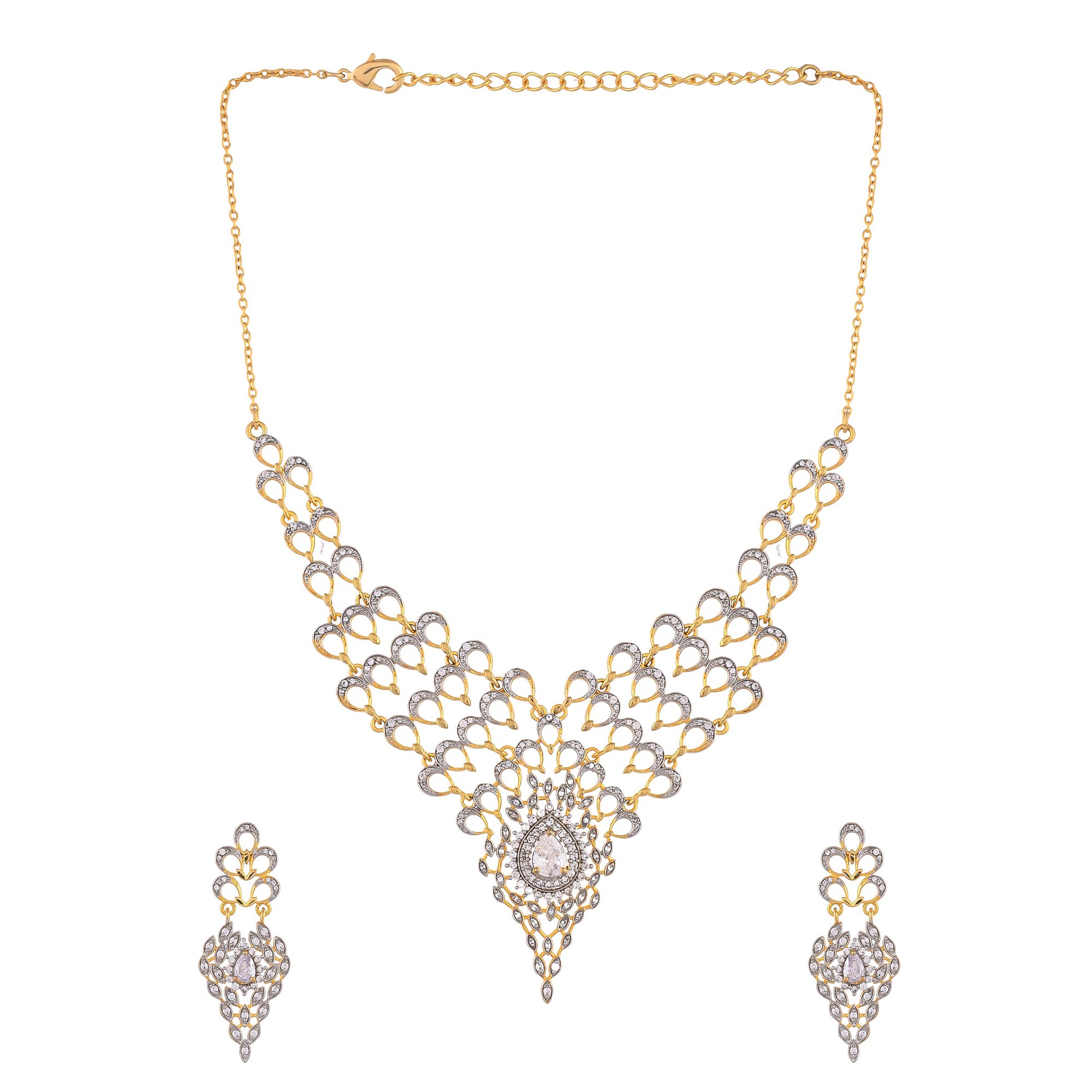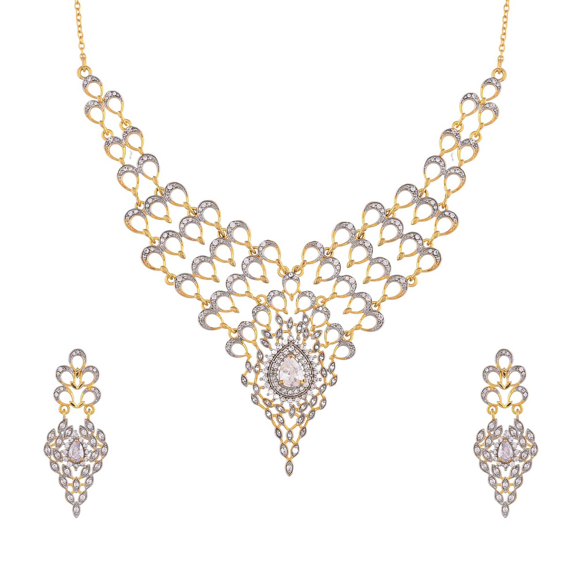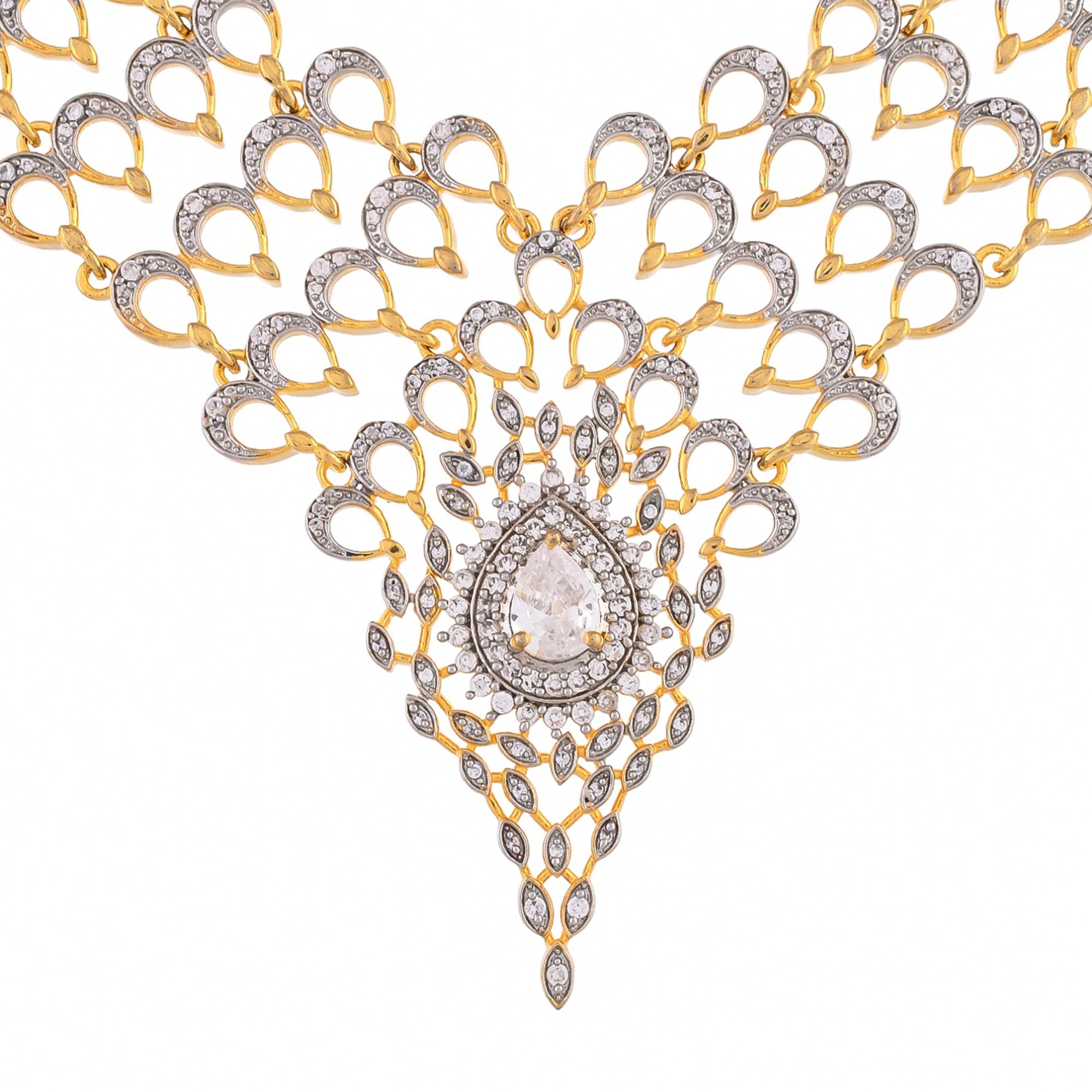 This Regal Peacock Necklace Set, a symbol of opulence and timeless beauty. At the heart of the necklace lies a big white CZ stone, commanding attention with its brilliance. Surrounding it are intricately arranged small CZ stones in the shape of graceful peacock feathers, creating a harmonious display of elegance. The matching earrings mirror this regal design, completing the set with a touch of sophistication.
