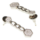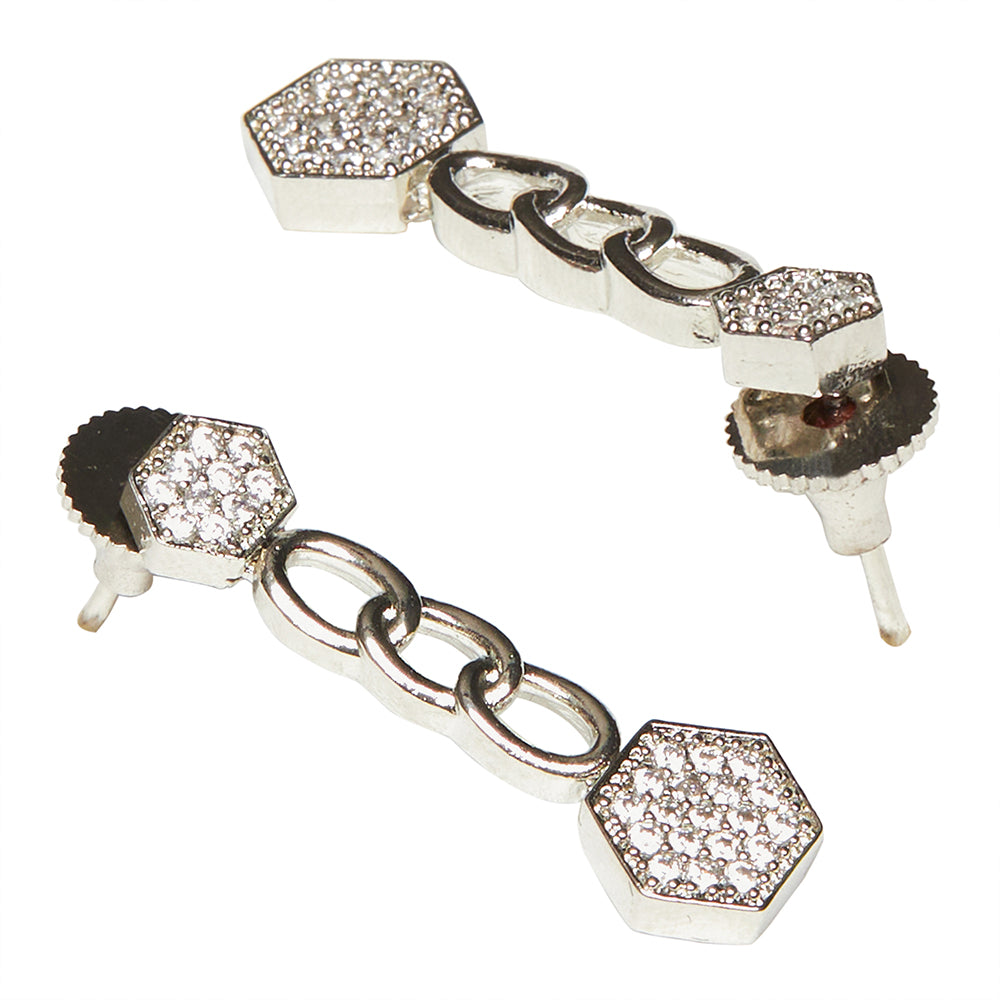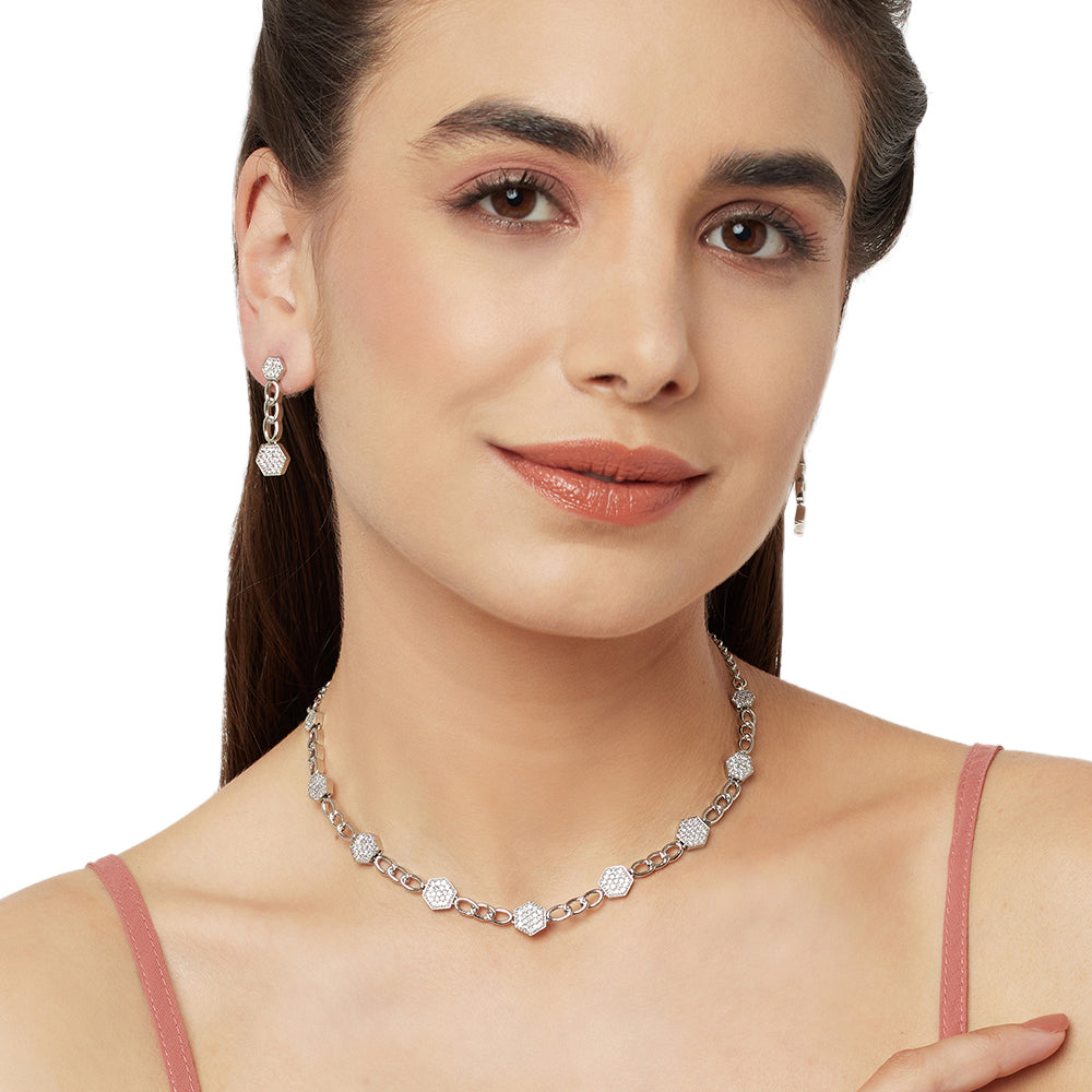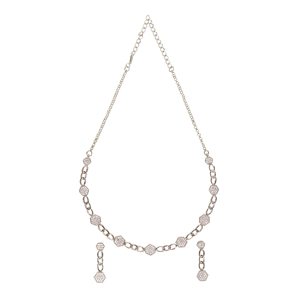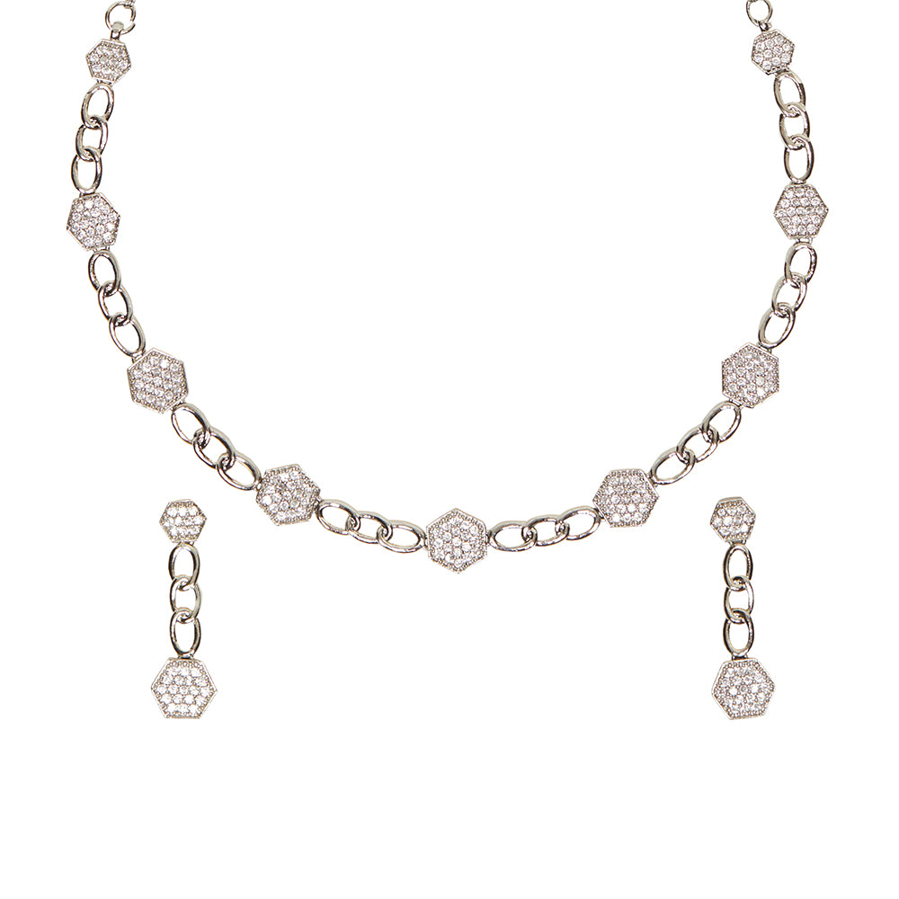 Brass jewellery set fashioned into a classic yet edgy link design. Silver plated for added glam, the drop earrings and necklace have been embellished with cubic zirconia gemstones. A good match for formal outfits of all kinds,