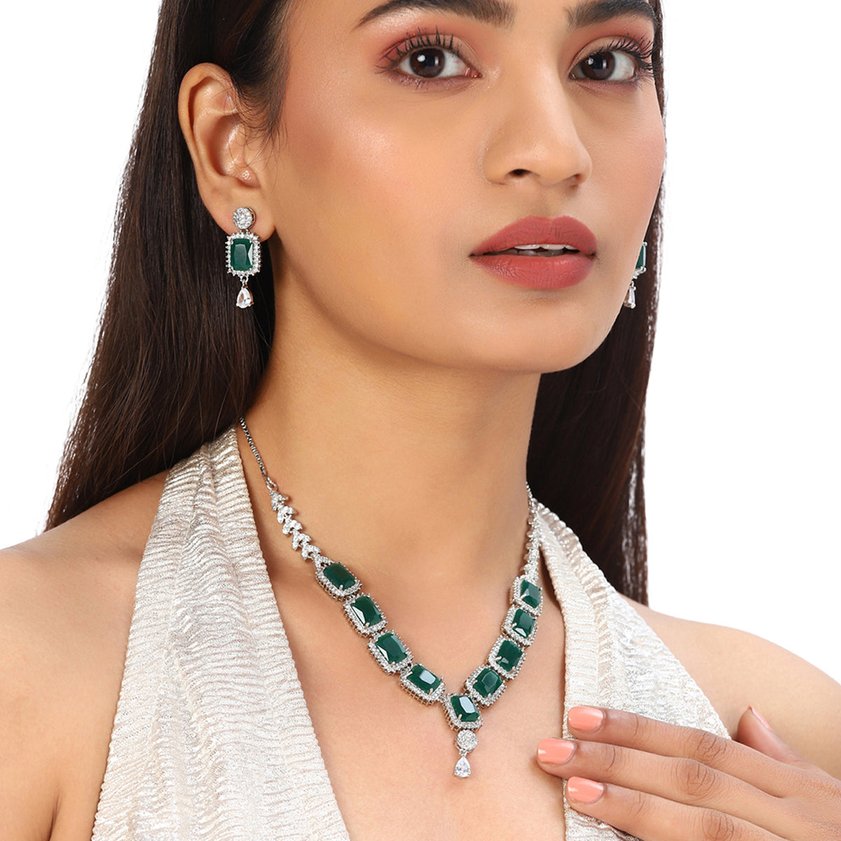 Brass jewellery set with a lovely silver plating. Embellished with green and white cubic zirconia gemstones in oval and emerald cuts. Pair the set with a cocktail gown or designer saree.Caring for your fashion jewelry: We, at Voylla, take care...