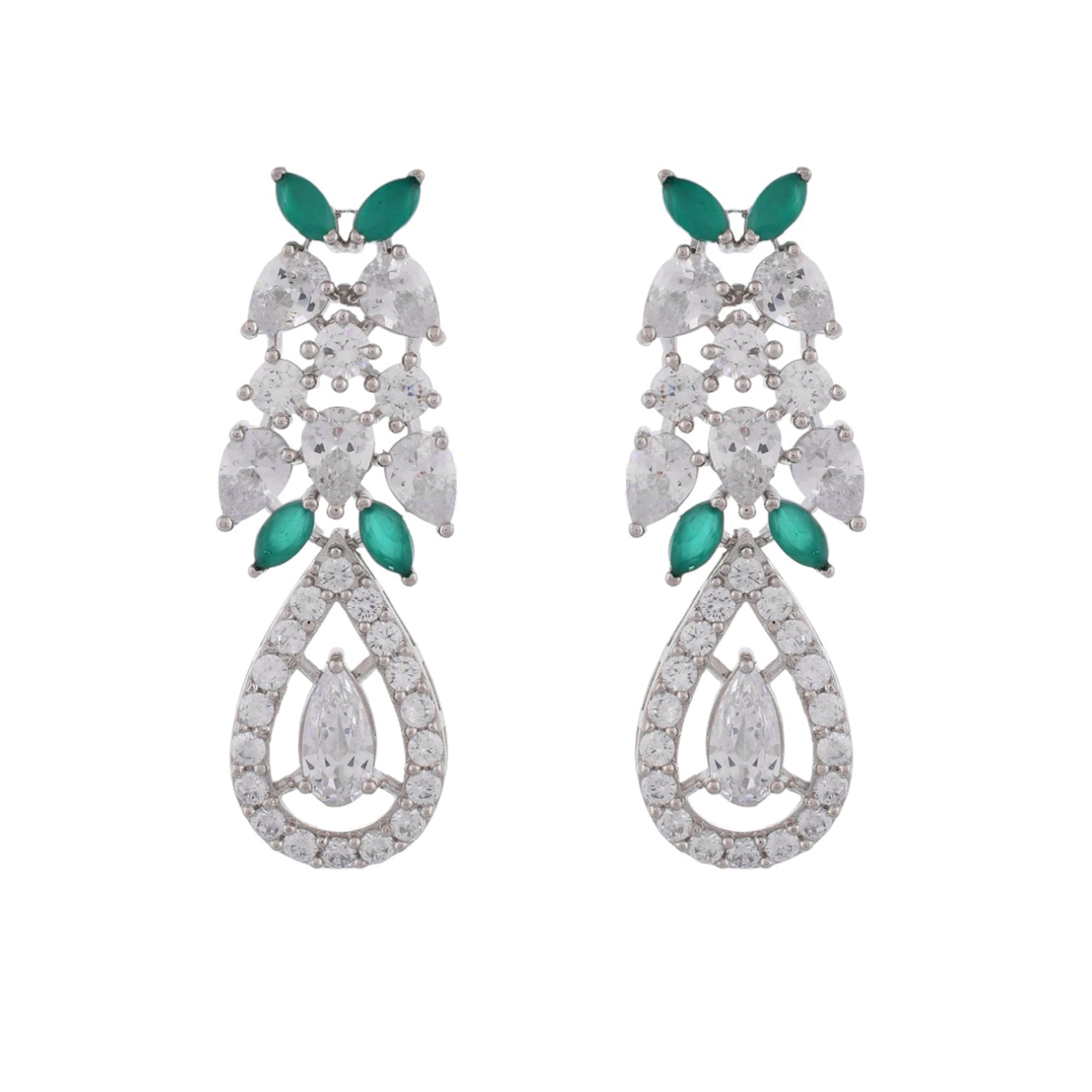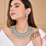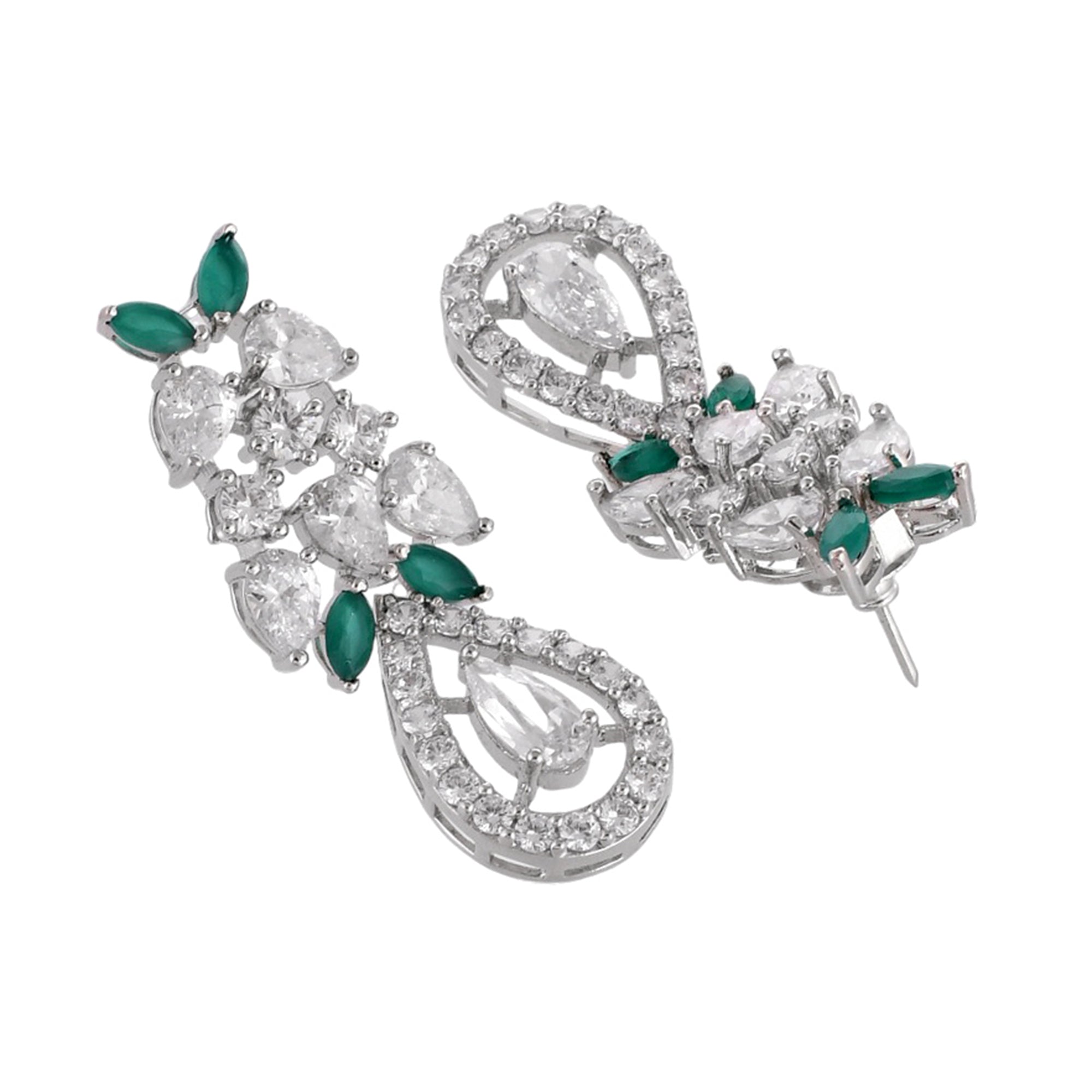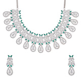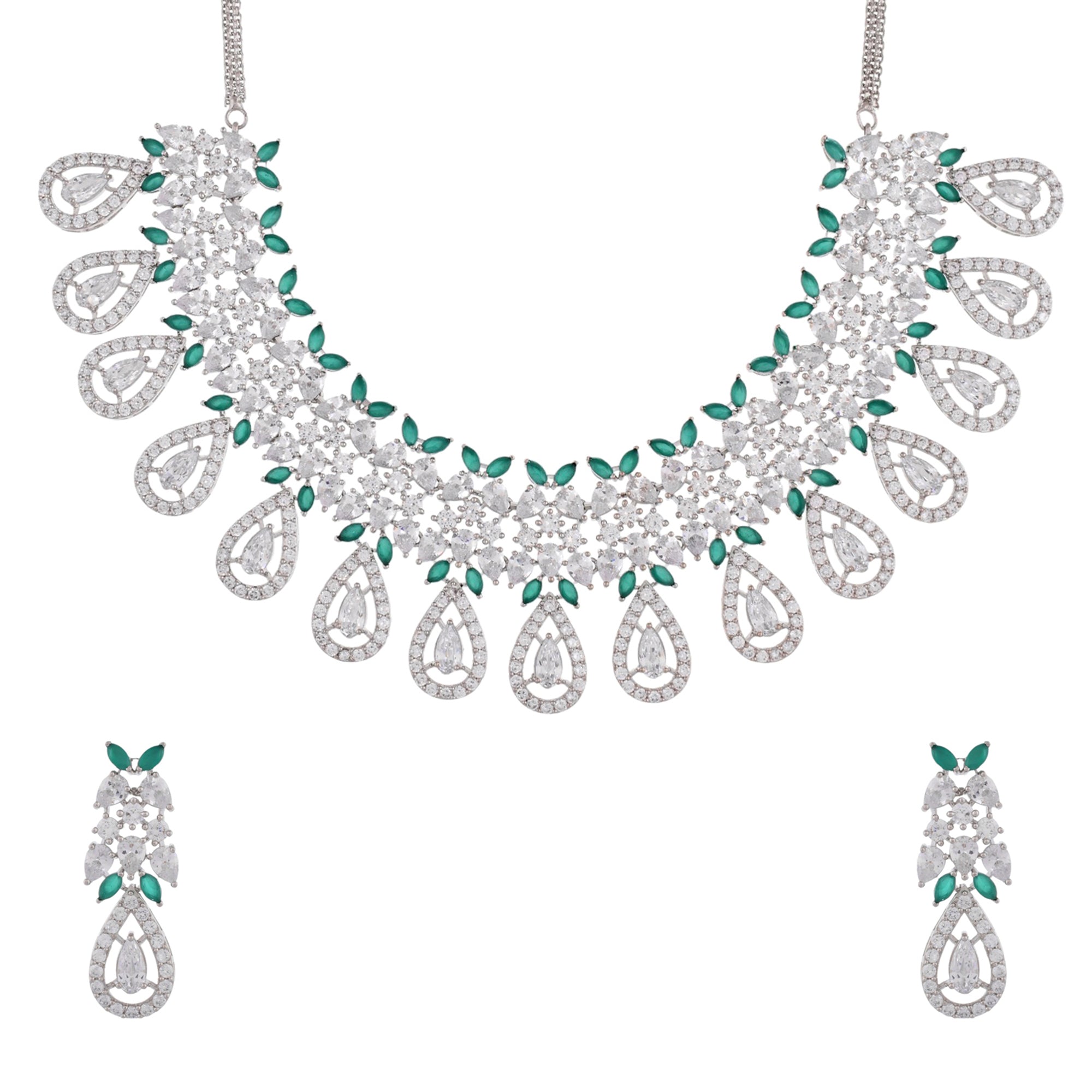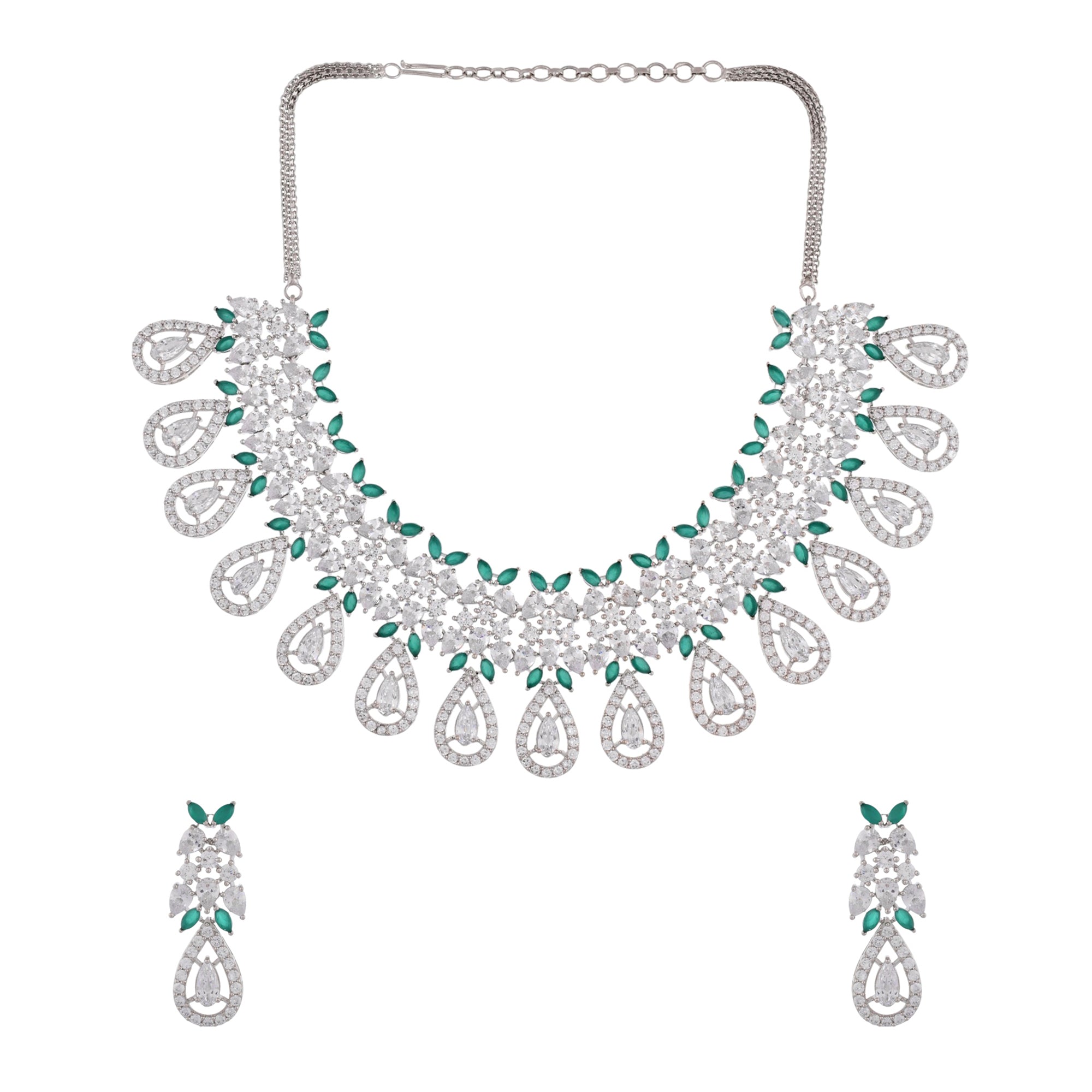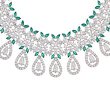 A gorgeous necklace set, designed to be charming and opulent. Embellished with green and white teardrop cut CZ gems, the brass set has been given a sparkling white rhodium plating. Pair with gowns and cocktail dresses.