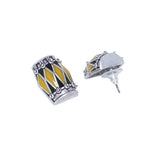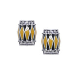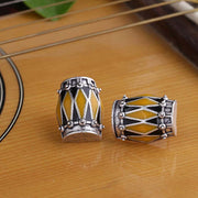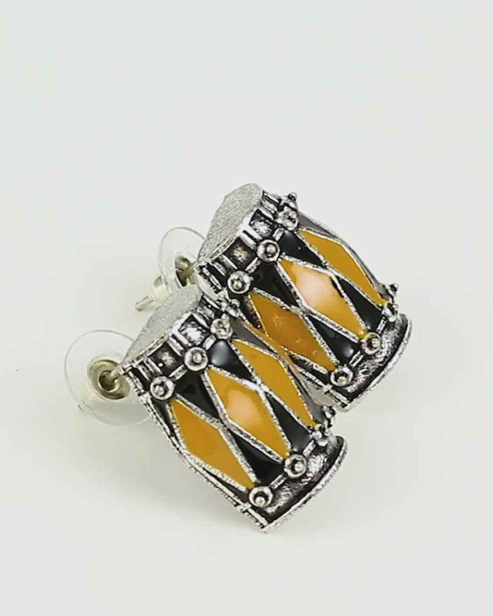 Inspired by classical Indian music and musical instruments, these brass studs have been crafted into a dholki motif. Oxidized silver plated and enameled, the studs are a perfect match for casual ethnic looks.