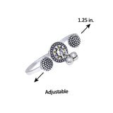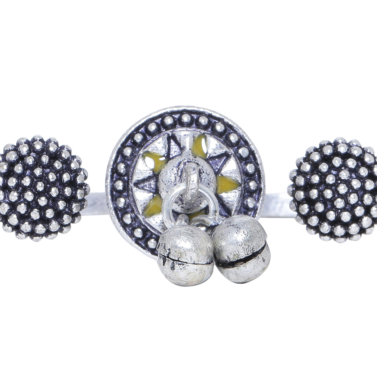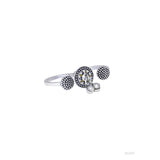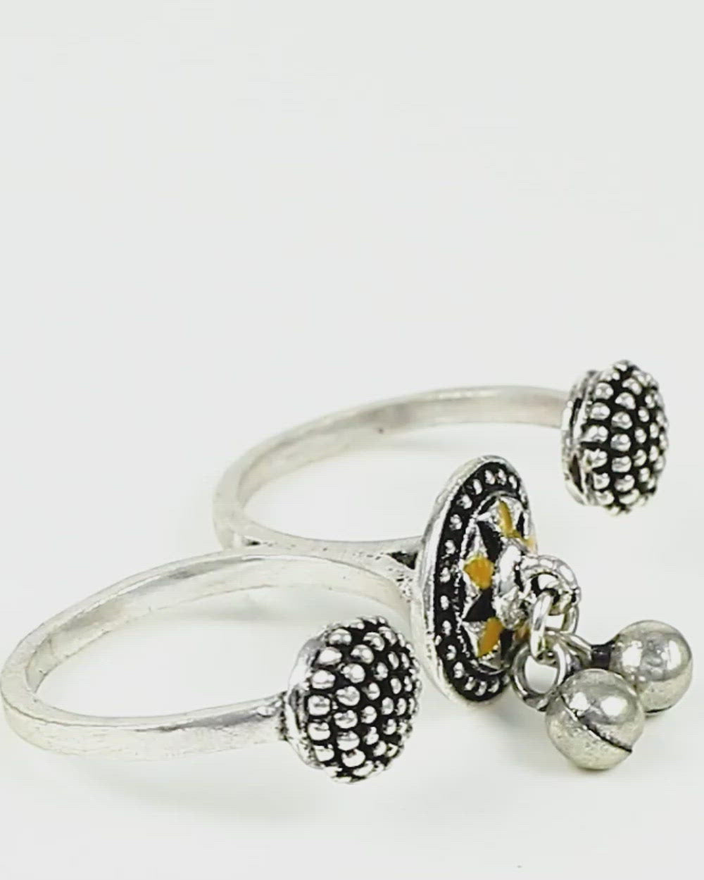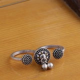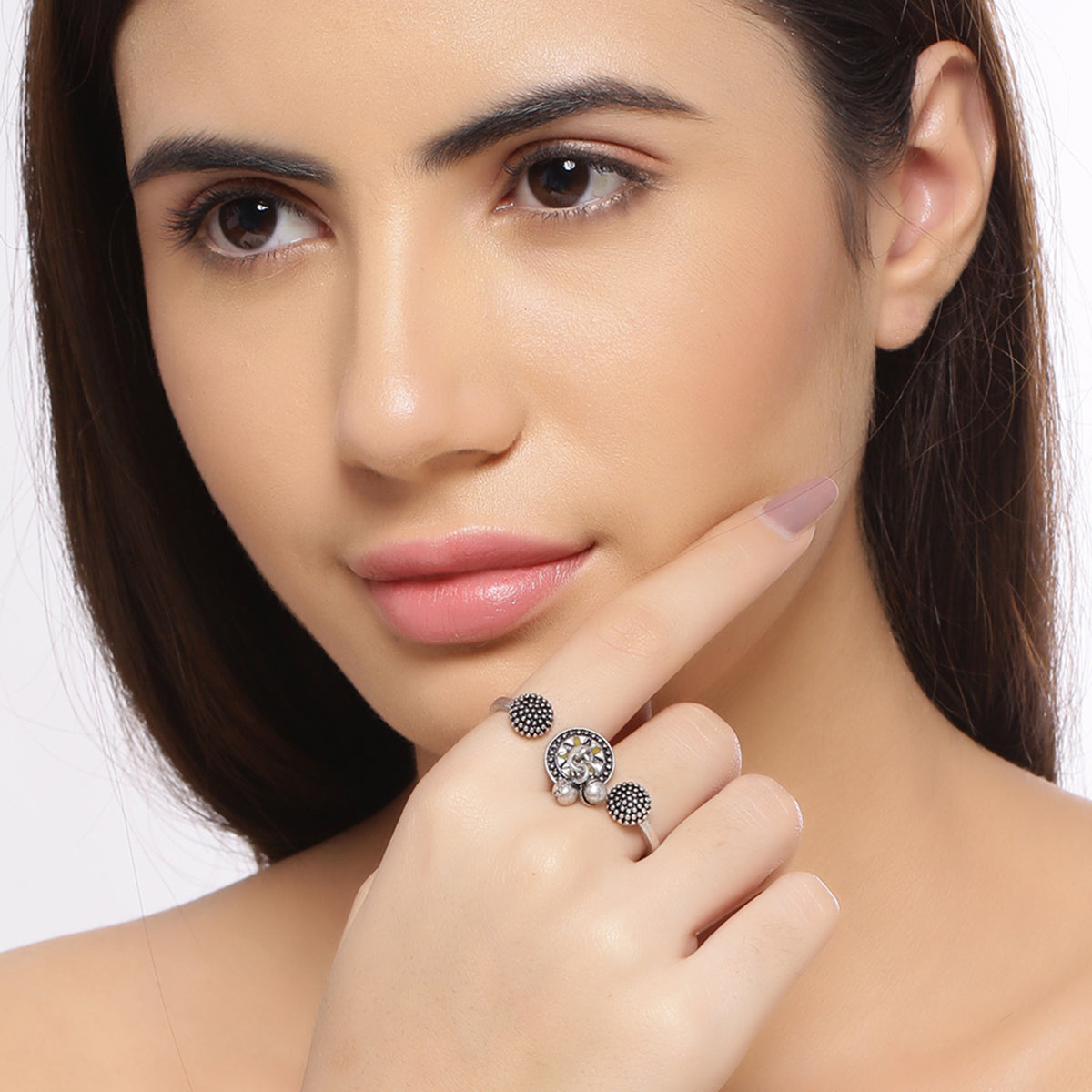 Dual-fingers statement ring made from brass and inspired by the soulful and melodious Indian music and musical instruments. Textured and lightly embellished, the oxidized silver plated ring will look splendid when paired with a traditional silk saree.