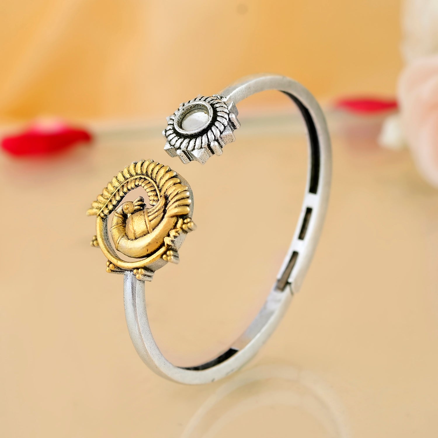 Embrace your cultural heritage with this exquisite Oxidised Cuff Bracelet for Women, featuring a timeless peacock motif at its heart. Crafted with care to reflect the ancient artistry of Indian textiles, this bracelet blends silver and gold plating to create an antique oxidized look that captivates and enchants. Perfect as a Gift for Women on occasions like Rakshabandhan, Diwali, or everyday wear, this piece is more than just jewelry—it’s a wearable connection to your roots. Whether you’re dressing up for pooja or adorning your office attire, let this Oxidised Bracelet be a testament to your unbreakable bond with tradition—wear your heritage proudly. Ideal as a Gift for Sister, Wife, Girlfriend, Mother, Friend, or even for yourself, this bracelet is a versatile addition to any jewelry collection.