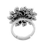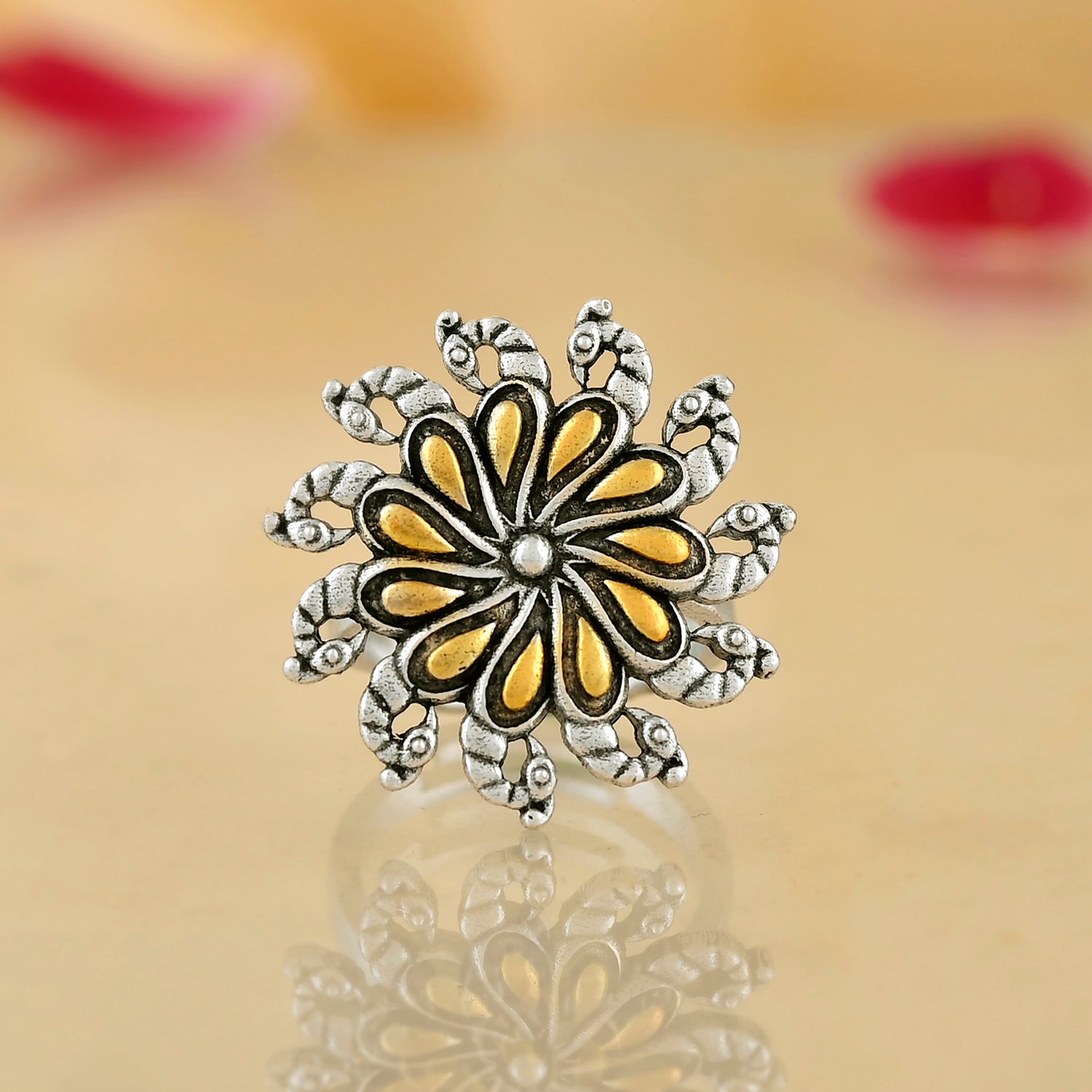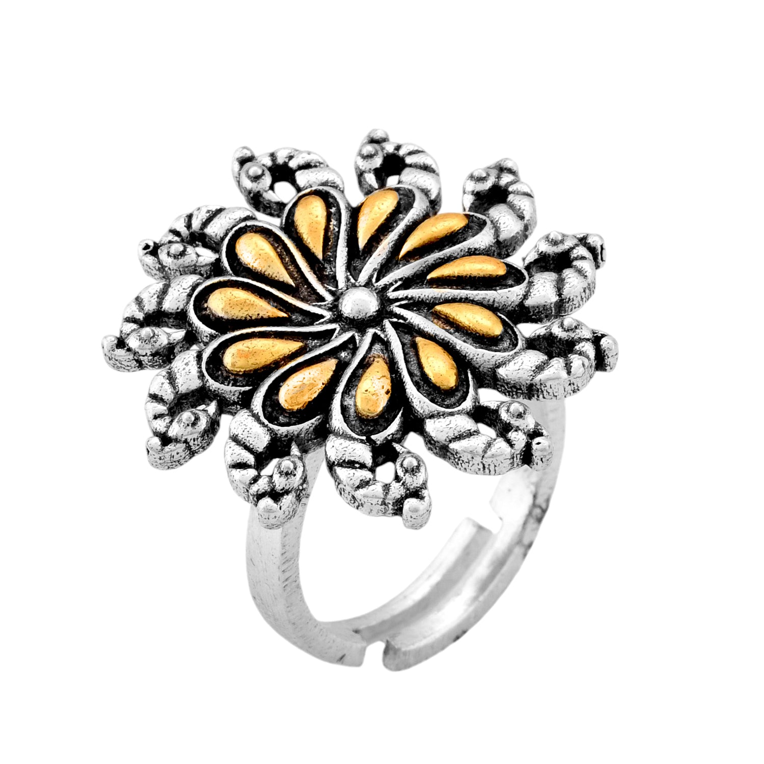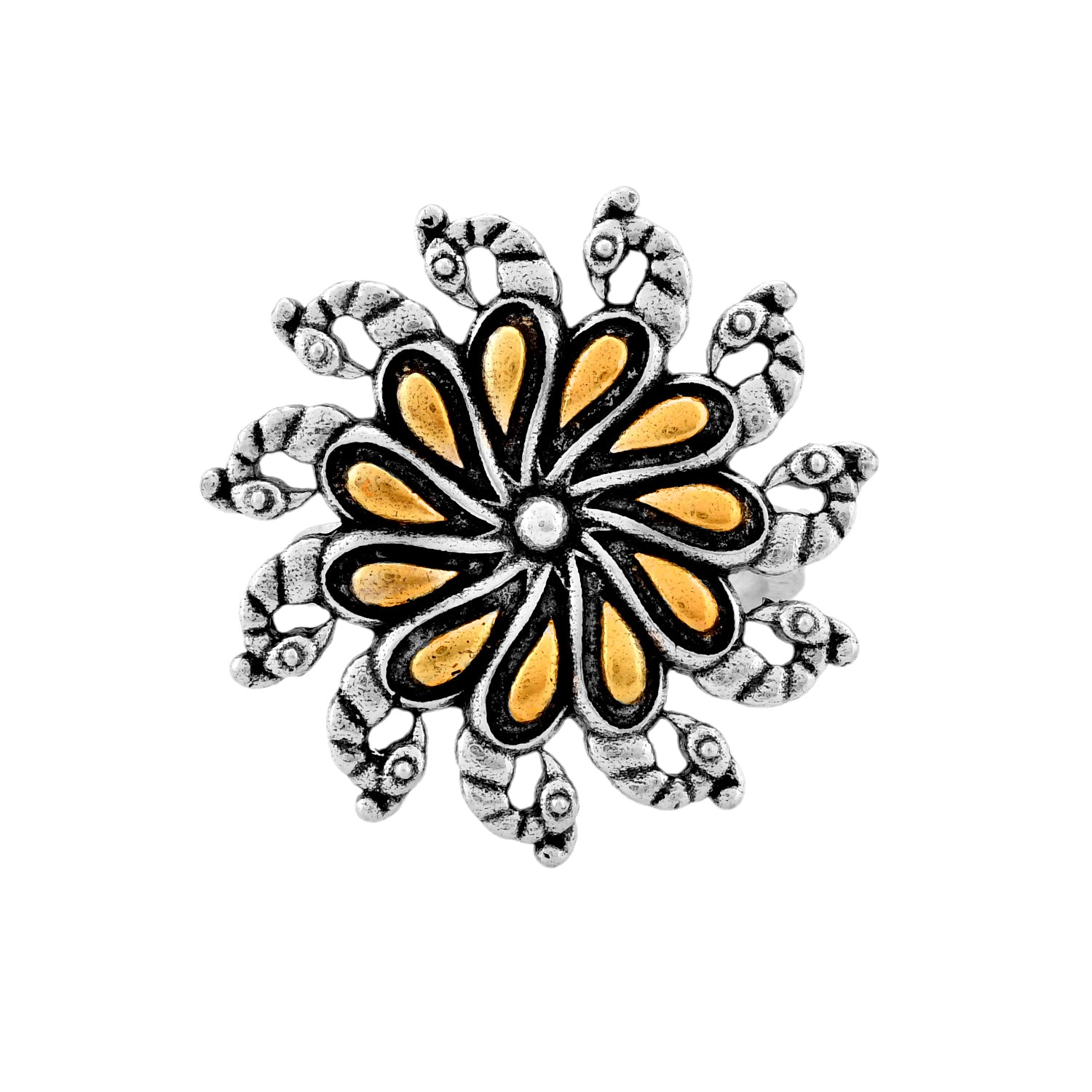 Embrace your heritage with this exquisitely crafted Oxidized Floral Motif Ring. Drawing inspiration from India’s rich tradition of textile artistry, this ring features sacred motifs rendered in stunning detail. The central flower, symbolizing growth and purity, is highlighted with gold mixed plating against an antique oxidized silver backdrop. Perfect for women who carry their culture in their hearts and on their hands, this ring is ideal for pooja ceremonies, everyday elegance, or celebrating festivals like Rakshabandhan and Diwali. A versatile addition to any outfit—be it office wear or traditional attire—it makes a thoughtful gift for sisters, wives, girlfriends, mothers, or friends who cherish their roots. Wear your heritage proudly with this beautiful representation of Indian craftsmanship.