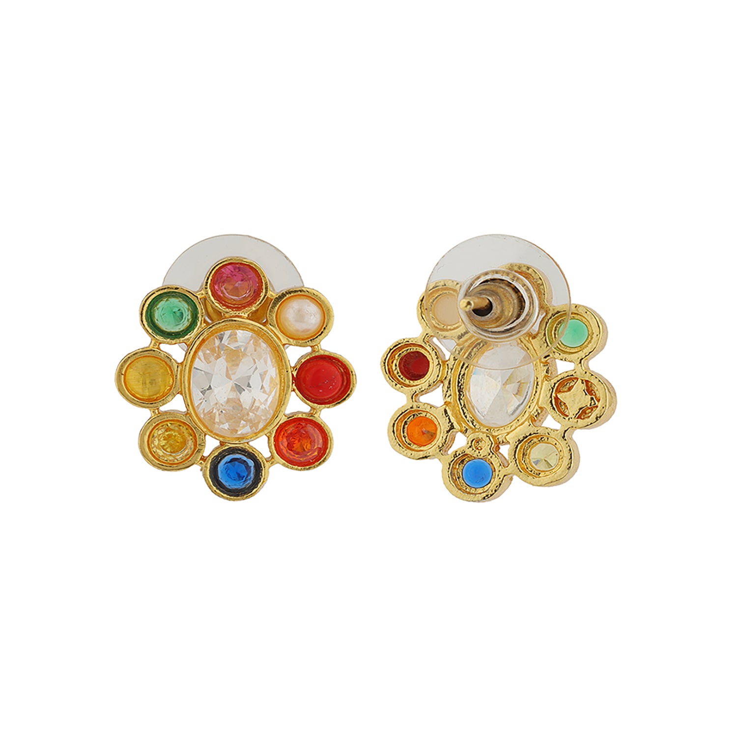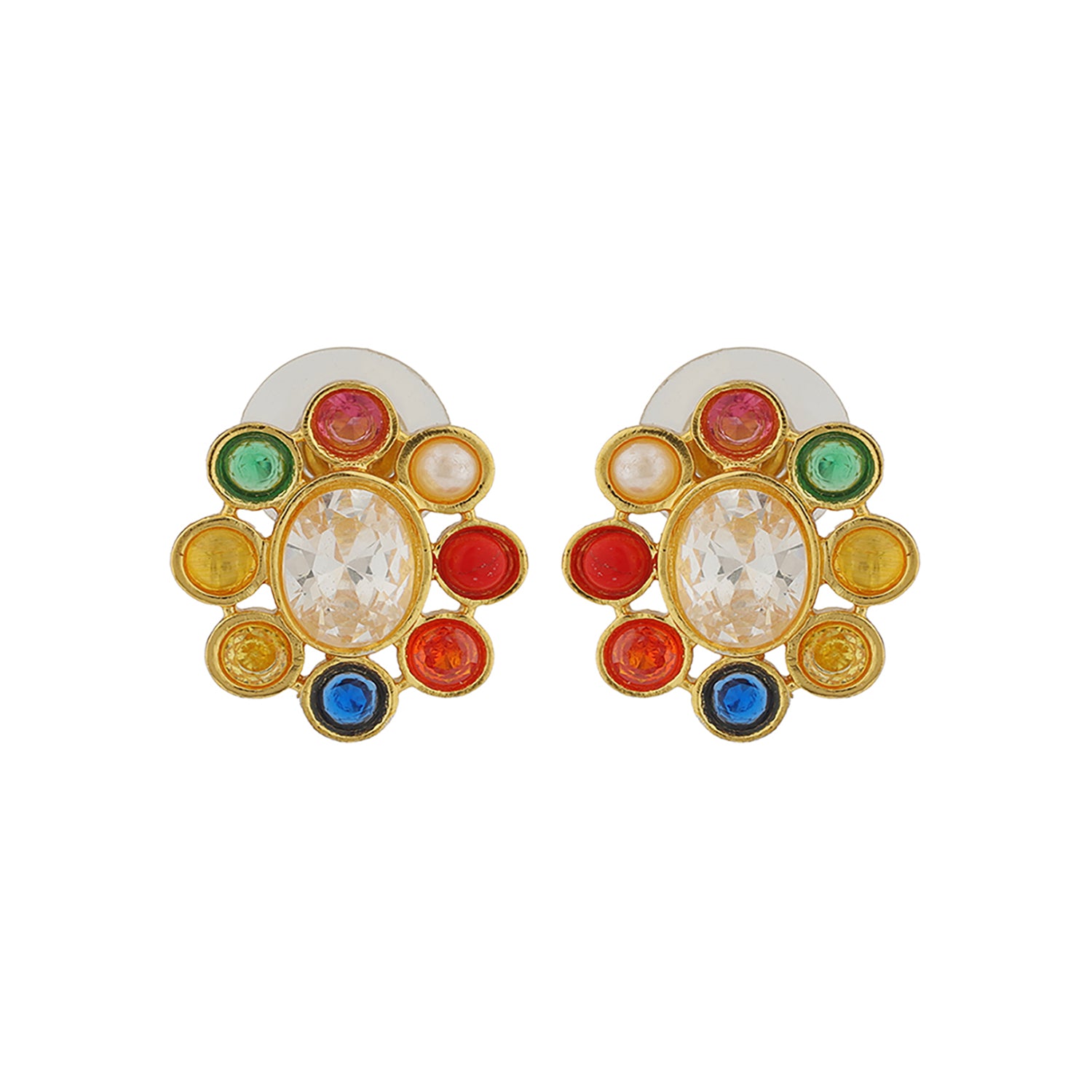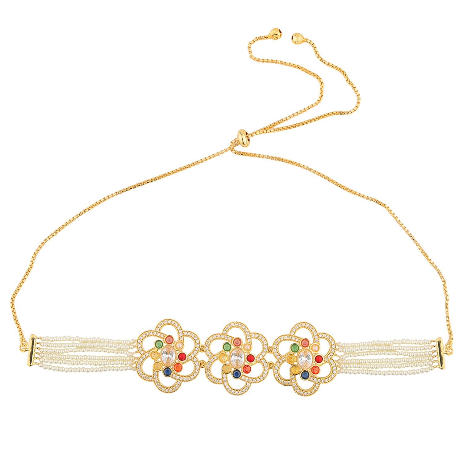 Celebrate the beauty of tradition with a touch of modern elegance through the Navratan Floral Harmony Choker Necklace Set. Part of the timeless Navratan Collection, this exquisite design brings together the auspicious energy of nine sacred gemstones, each believed to channel celestial power, prosperity, and grace. Thoughtfully crafted for today’s woman, it blends heritage detailing with a sophisticated, contemporary flair. Made in brass and finished with a glowing yellow gold plating, this designer necklace set for women features beautifully crafted floral motifs adorned with colorful Navratan stones and delicate pearls. The layered pearl strands cascade gracefully, giving it a regal yet lightweight appeal. Paired with matching floral studs, this necklace set adds a divine touch to every festive moment. Perfect for wedding wear, festive occasions, and pooja wear, this gold necklace set embodies the harmony of color, craftsmanship, and culture, making it a true treasure in every jewelry collection.