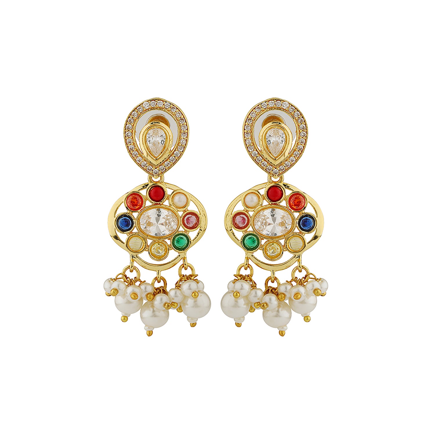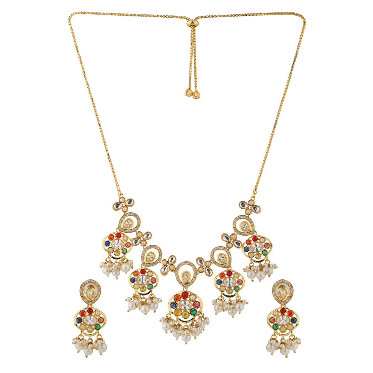Grace your neckline with timeless radiance and regal charm with the Navratan Fluid Elegance Short Necklace Set, a luxurious creation from the Navratan Collection that celebrates tradition through color, craftsmanship, and cultural symbolism. Inspired by the divine harmony of the nine planetary gemstones, this piece captures the spirit of prosperity, grace, and balance, all while exuding modern sophistication. Crafted meticulously in brass with a rich yellow gold plating, this designer necklace set for women showcases fluid, symmetrical motifs embellished with multicolored Navratan stones and cascading pearl clusters. The delicate detailing and lustrous gold finish add a royal aura, while the matching earrings complete the look with effortless refinement. Perfect for festive wear, wedding wear, or pooja wear, this gold necklace set transforms every moment into a celebration of style and tradition. Whether worn with sarees or lehengas, it promises to make you stand out with elegance and meaning.