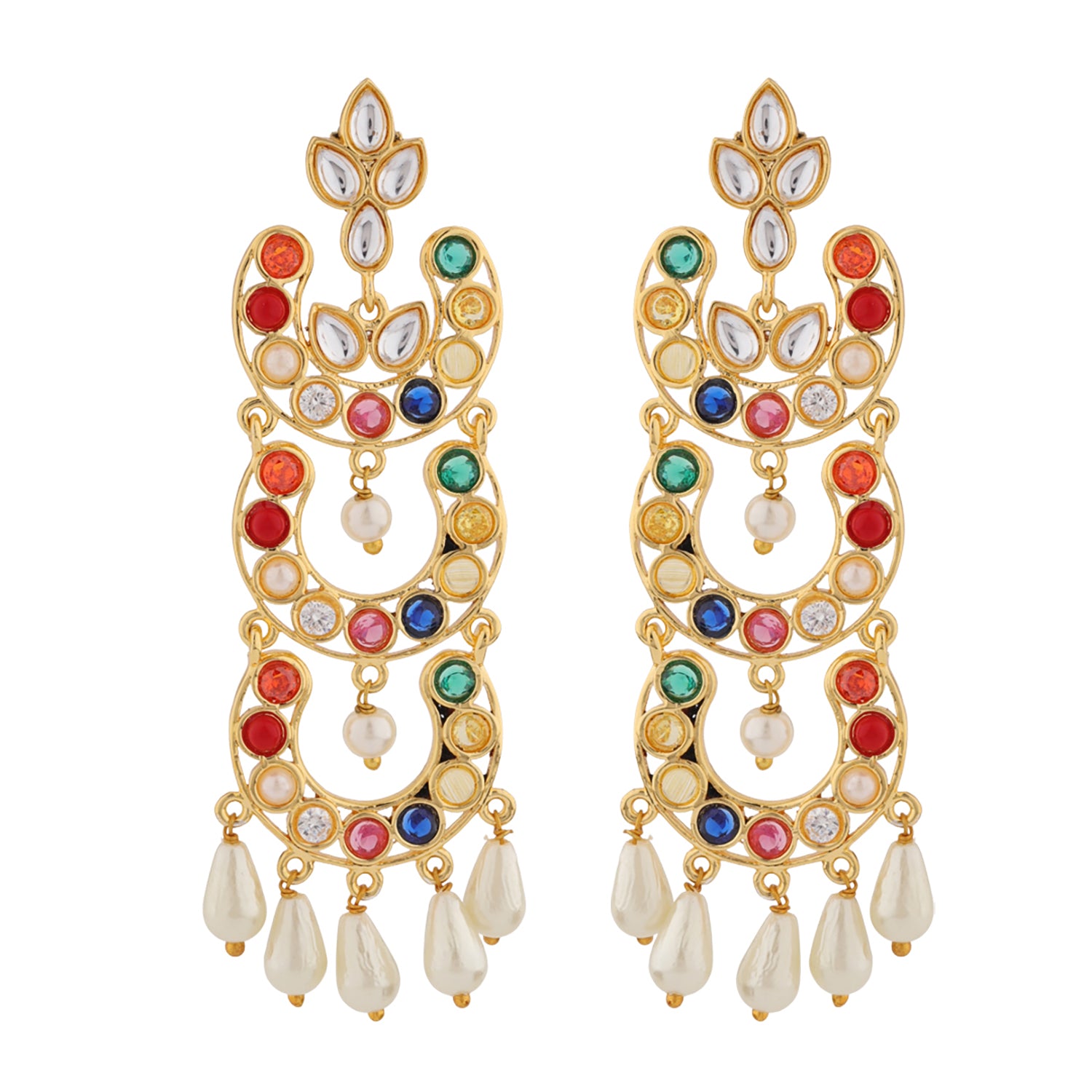 Illuminate your look with the Navratan Moonlight Dangle Earrings, a radiant expression of heritage and modern grace. Inspired by the sacred symbolism of the Navratan, the nine auspicious gemstones representing cosmic balance, protection, and prosperity, this piece from the Navratan Collection celebrates the harmony between divine energy and contemporary design. Crafted in brass and finished with a rich yellow gold plating, these designer earrings for women exude opulence and charm. The cascading crescent motif is adorned with a medley of multicolored stones - fiery reds, emerald greens, sapphire blues, and luminous whites, symbolizing the celestial glow of moonlight dancing on jewels. The delicate pearl drops at the bottom add a soft, romantic touch that enhances the earring’s regal allure. Perfect for wedding functions, festive occasions, or pooja wear, these gold earrings bring a graceful sparkle to any outfit. Lightweight yet statement-making, they are a perfect fusion of traditional elegance and modern craftsmanship. Whether you’re dressing up for a family celebration or gifting someone special, these earrings promise to be a treasured keepsake.