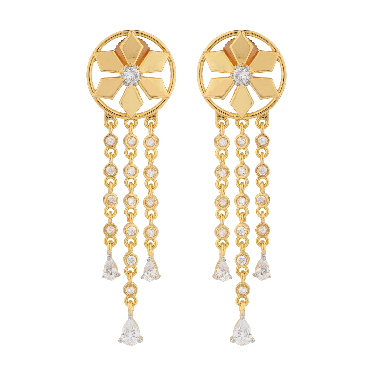 Graceful, radiant, and rich with royal charm, the Shahi Dwar Baisa Dangler Earrings are a stunning reflection of refined craftsmanship and timeless design. Inspired by the grandeur of Jaipur’s palace architecture, this design pays homage to the elegance of royal women, the Baisas known for their poise, beauty, and grace. Crafted in premium brass and plated with luxurious yellow gold, these designer earrings feature a floral medallion top inspired by royal window carvings, with three delicate chains of sparkling CZ American diamonds that cascade beautifully like drops of light. Each chain ends with a teardrop CZ stone, catching every shimmer and movement with effortless elegance. Lightweight yet full of presence, the Baisa Danglers are a versatile expression of luxury, perfect for festive occasions, wedding celebrations, or chic cocktail evenings. Whether gifted or worn, these stylish earrings embody timeless sophistication and a distinctly royal glow.