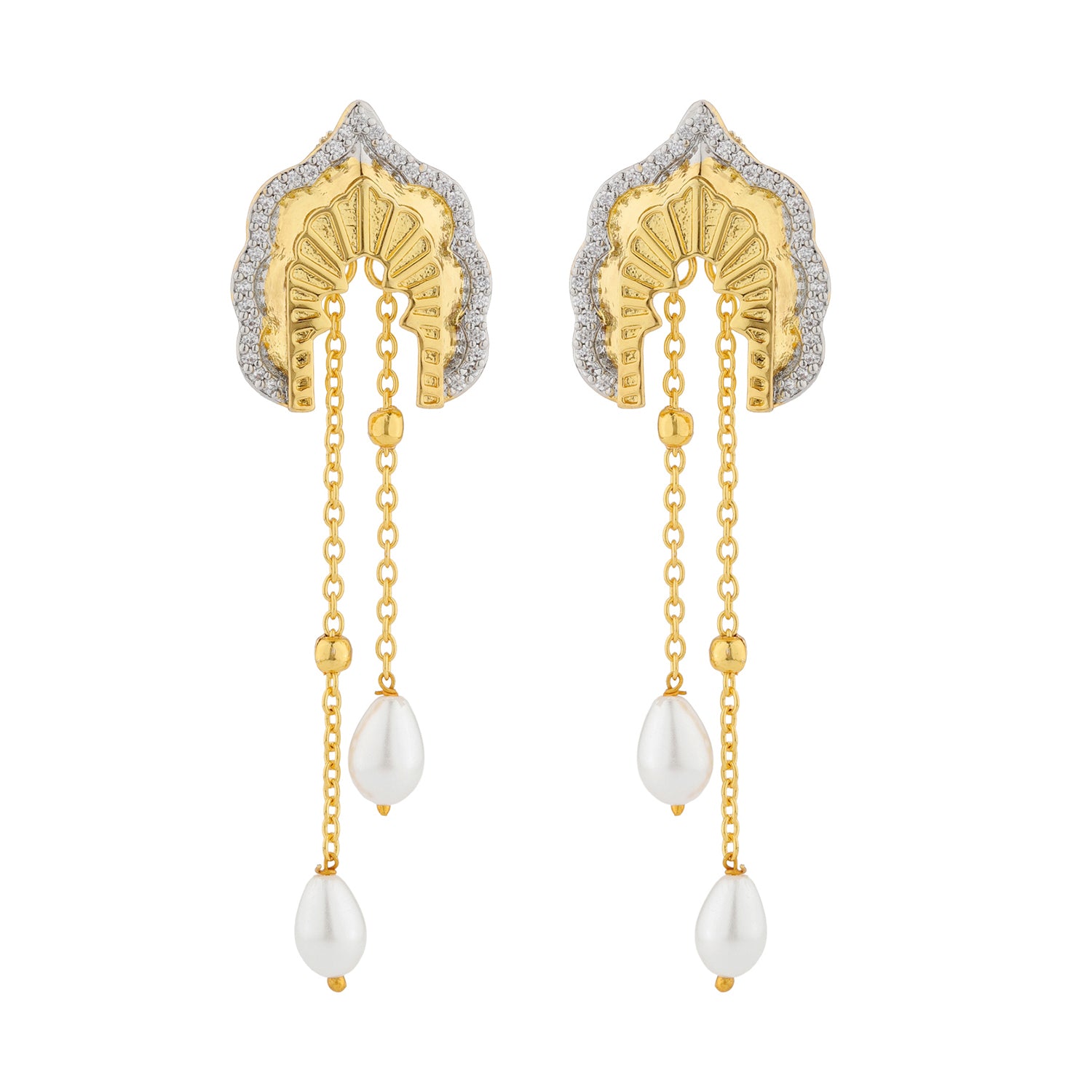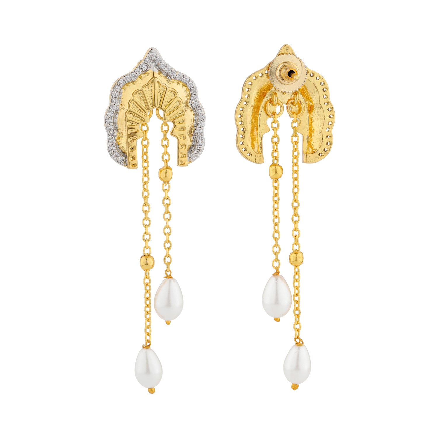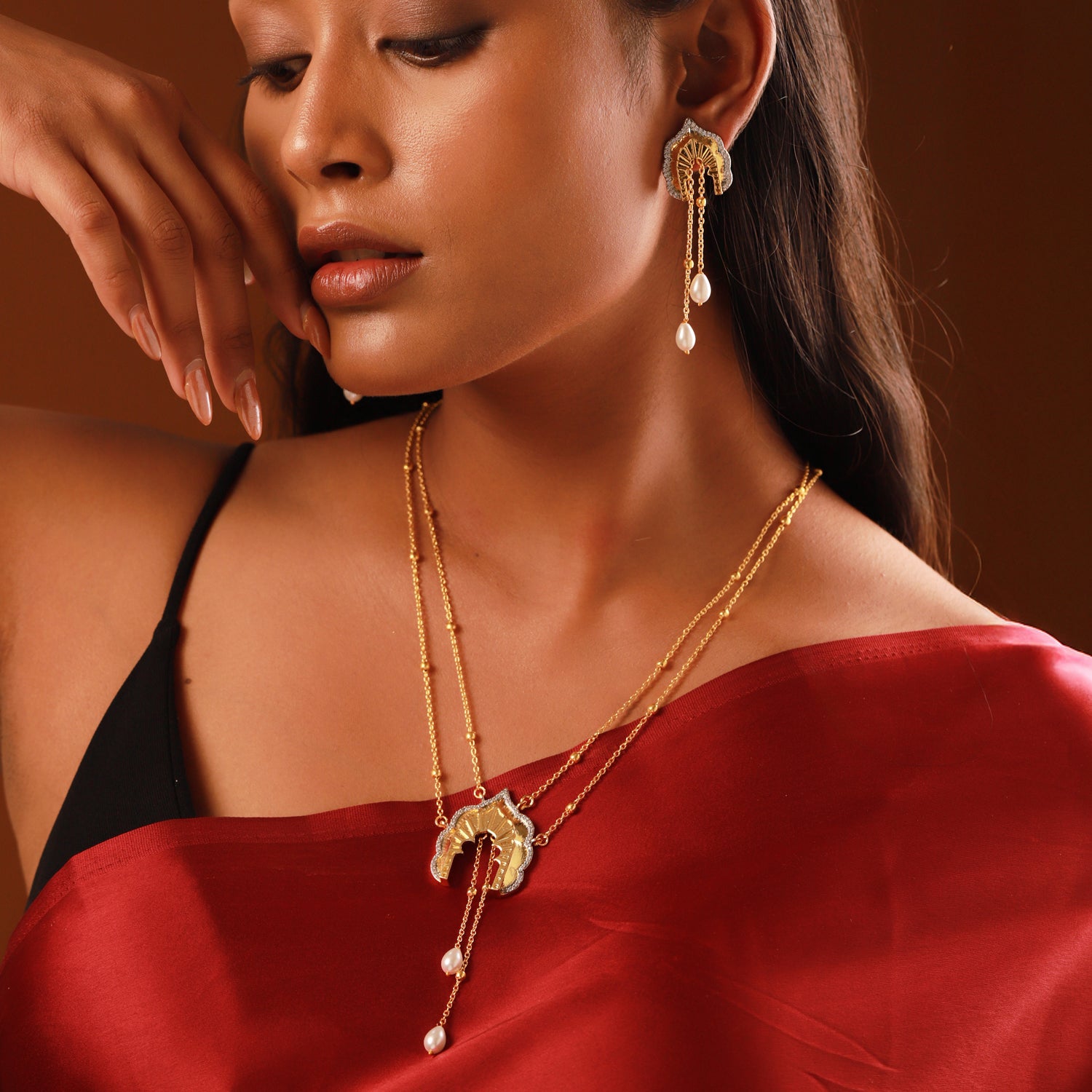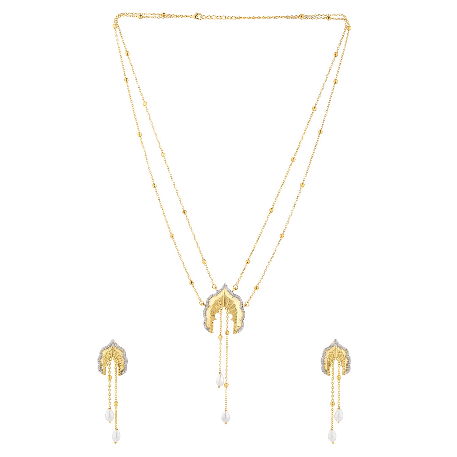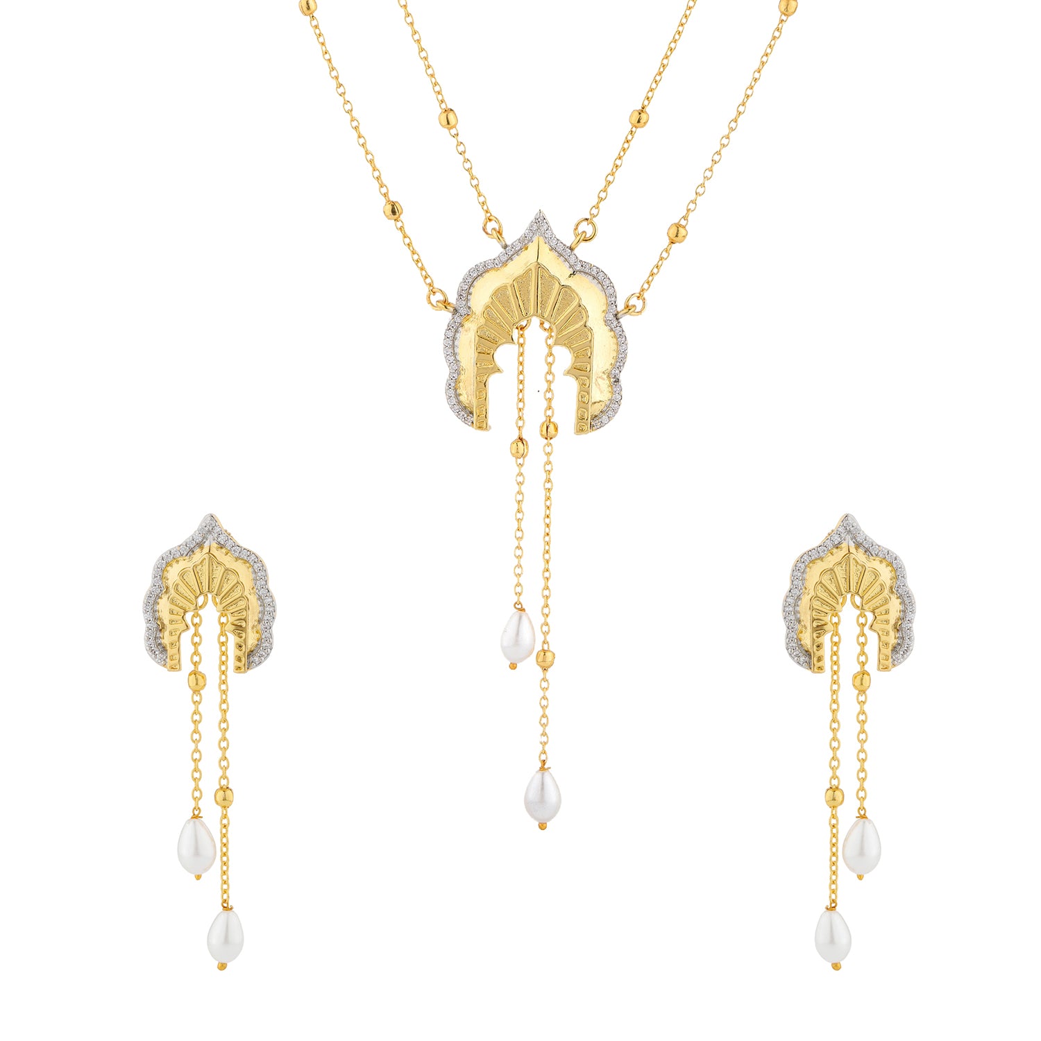 Step into the grandeur of royal courts with the Shahi Dwar Darbar-E-Khas Necklace Set, a masterpiece inspired by the majestic palace doorways and regal halls of Jaipur’s royal era. This set is a poetic expression of architectural artistry where the timeless arches of royal gateways meet the elegance of modern jewellery design. Expertly handcrafted in brass and finished with a radiant yellow gold plating, the design captures the intricate charm of Mughal-inspired arches. The statement pendant and matching earrings feature a scalloped arch motif outlined with shimmering CZ American diamonds, adorned with cascading gold chains that end in delicate pearl drops. These fluid chains mirror the graceful drapes and chandeliers that once adorned royal courts, adding movement and sophistication to the piece. This Necklace Set is an embodiment of refined craftsmanship and royal storytelling. Whether worn for a grand wedding, festive celebration, or elegant soirée, it exudes the aura of a modern queen, poised, graceful, and effortlessly regal.
