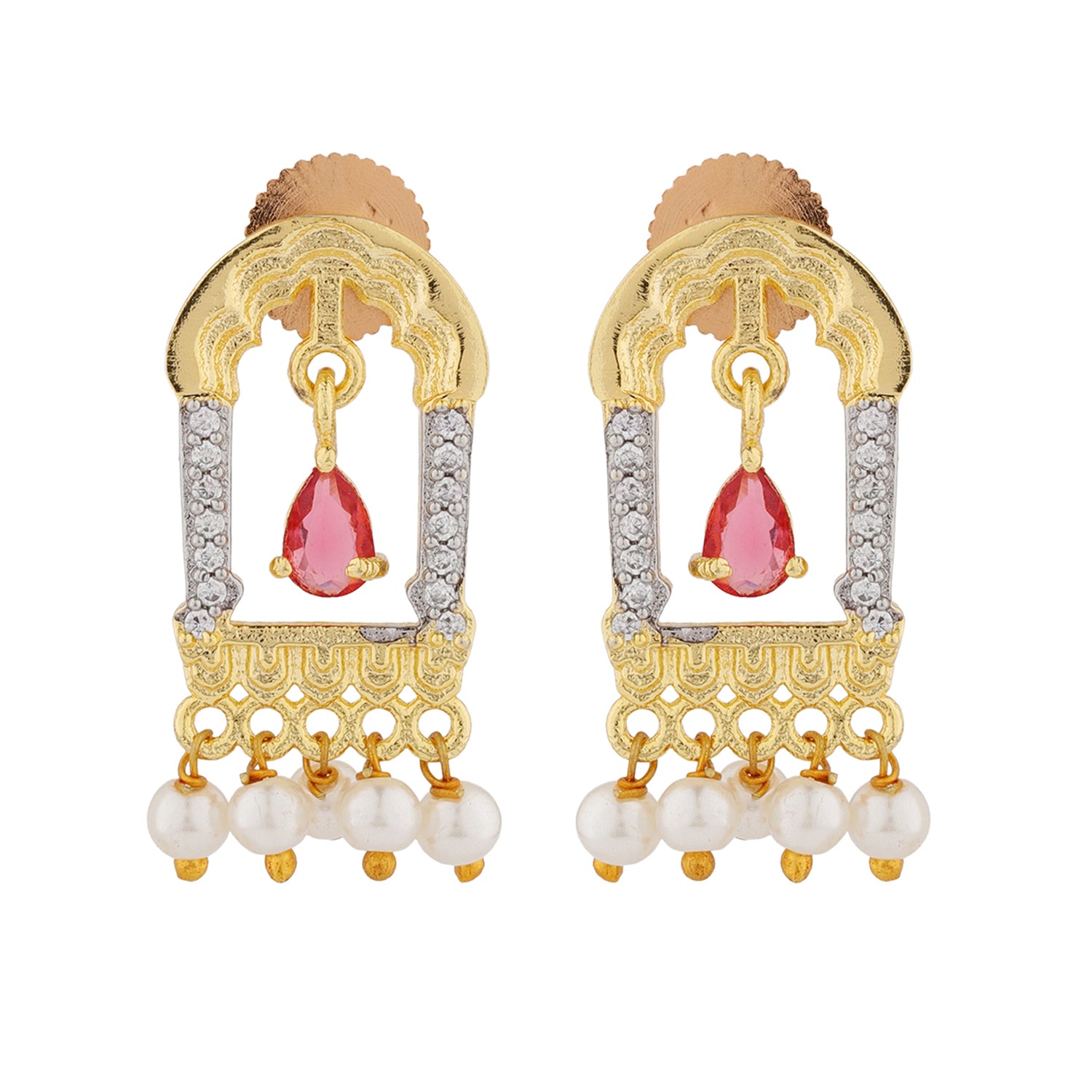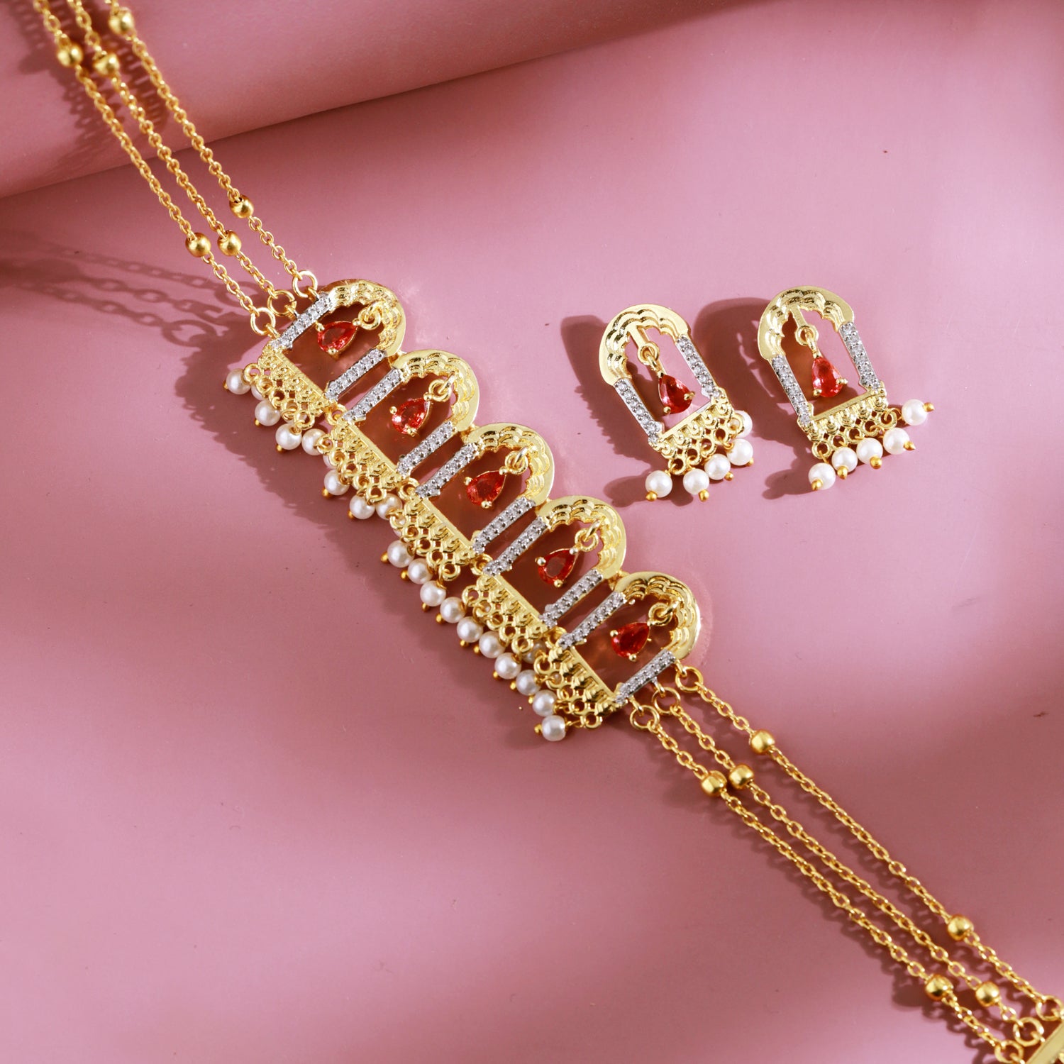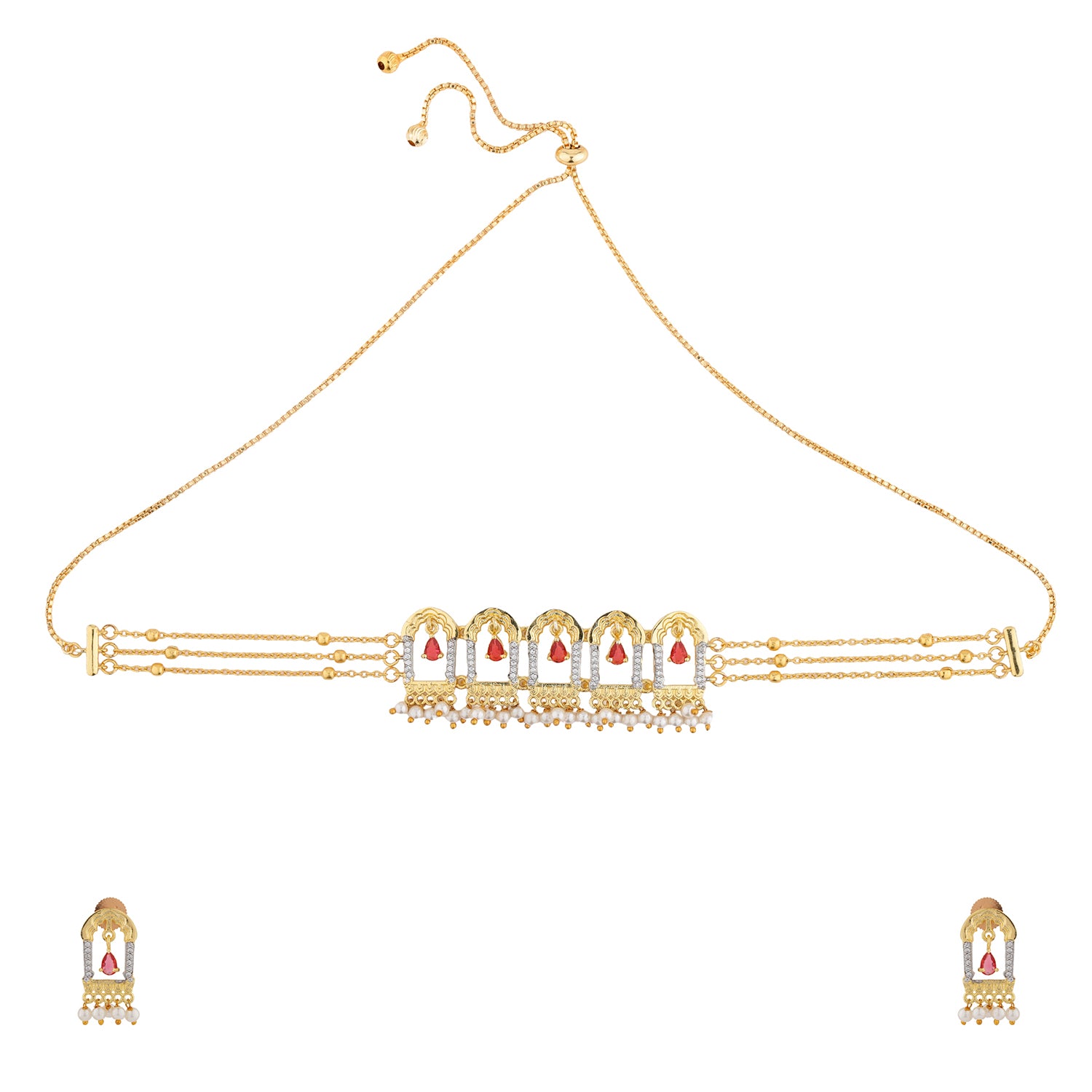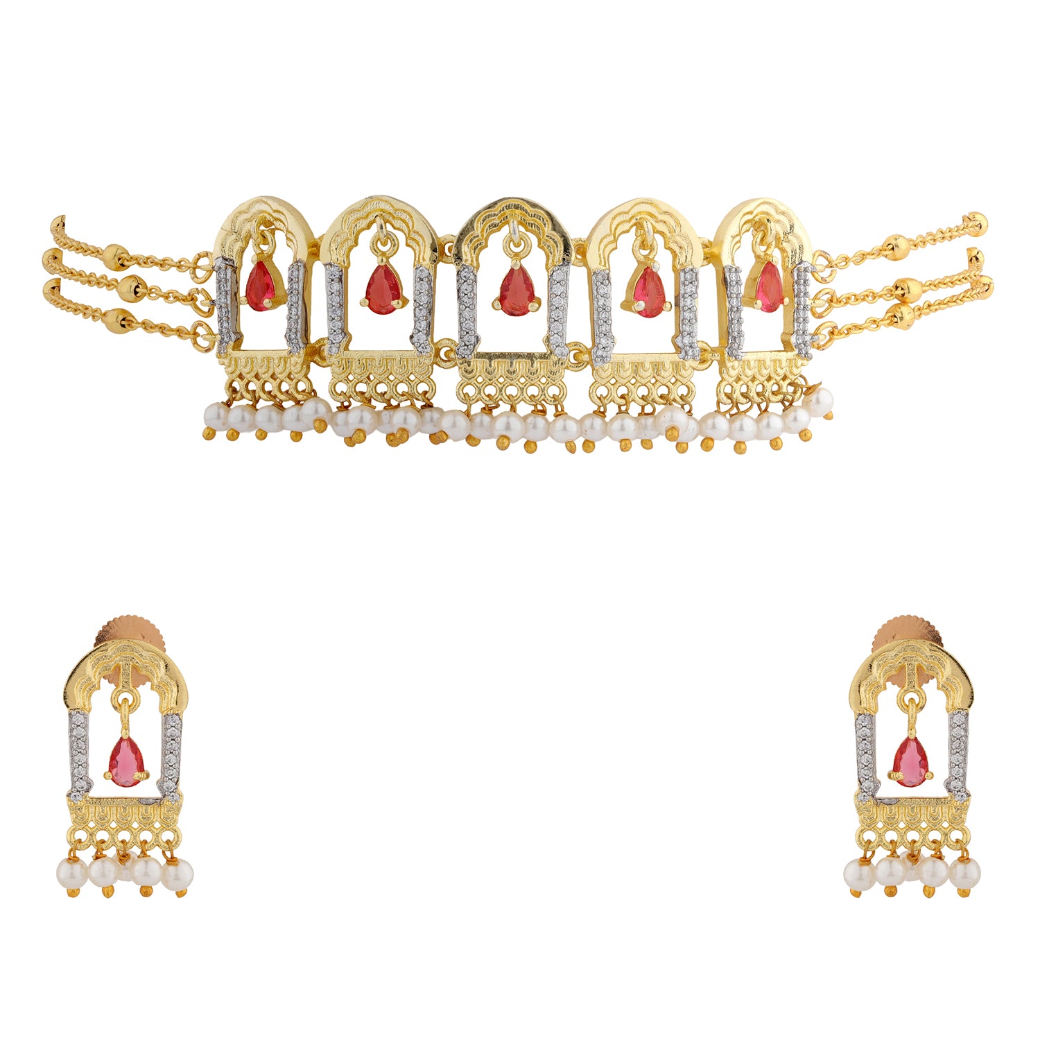 A masterpiece of royal artistry, the Shahi Dwar Hada Rani Choker Necklace Set pays homage to Jaipur’s timeless palatial grandeur and the fearless elegance of Rajput queens. Inspired by the regal arches and ornate gateways that framed royal courts, this choker captures the spirit of power, poise, and timeless femininity. Meticulously handcrafted in premium brass with a rich yellow gold plating, the choker showcases a row of intricate arch motifs, each adorned with shimmering CZ American diamonds, lustrous pearls, and striking ruby-red teardrop stones. The design evokes the royal charm of palace doorways, representing strength and grace with every curve. The layered chain detailing at the sides adds fluidity, while the coordinated earrings mirror the same stunning motif, completing the look with effortless symmetry. Perfect for the modern woman who celebrates her roots while embracing luxury, the Hada Rani Necklace Set is a statement of legacy, timeless, bold, and irresistibly elegant.