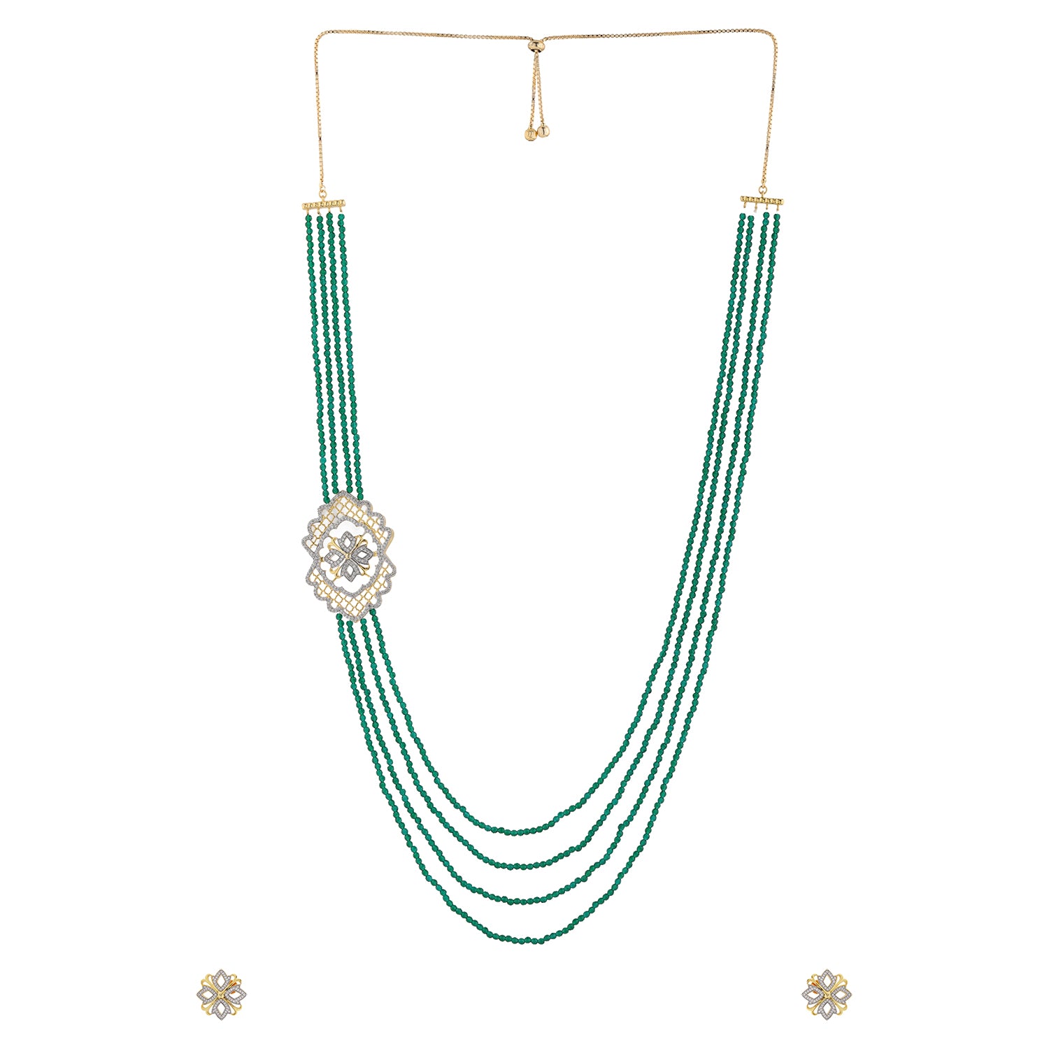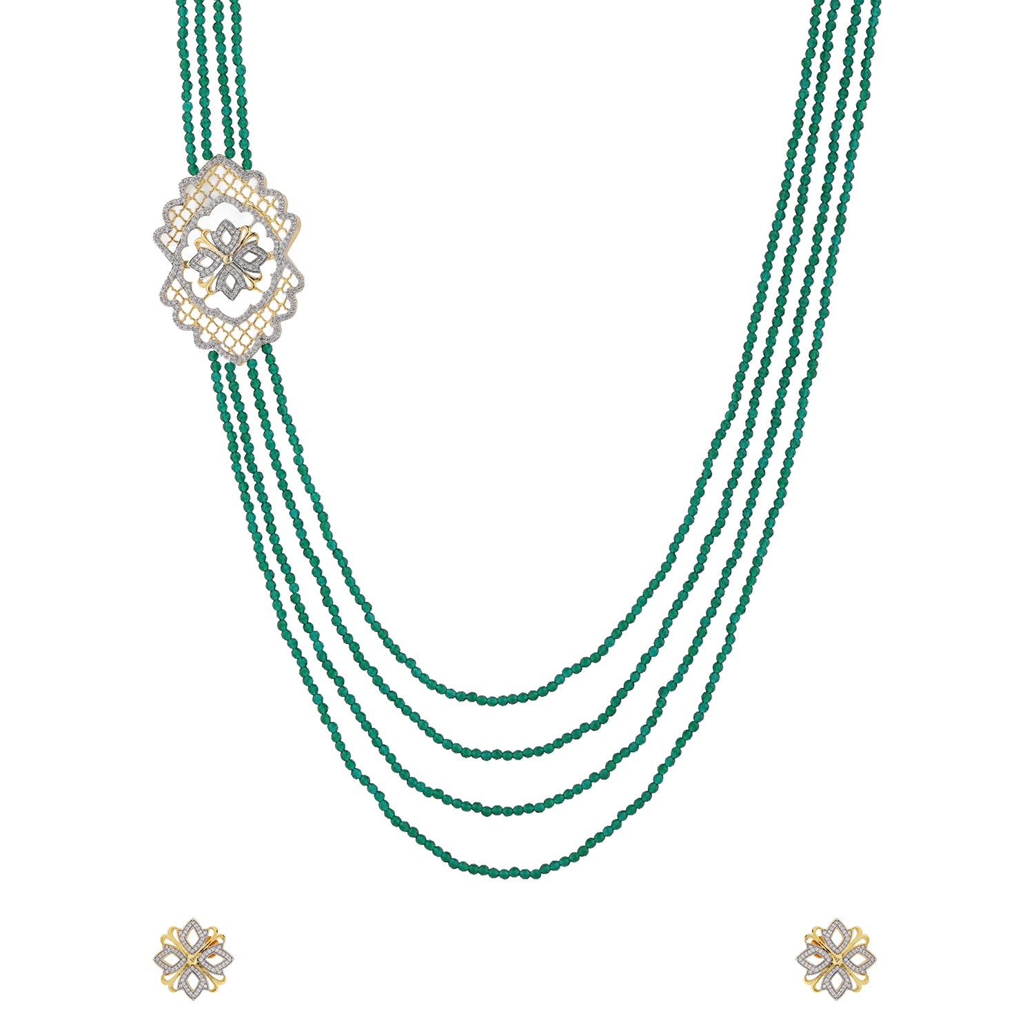 Step into a world of timeless grandeur with the Shahi Dwar Jhalar Raani Haar Necklace Set, a magnificent creation that captures the regal essence of Jaipur’s royal palaces and the grace of the women who once adorned them. Inspired by the majestic arches and ornate jharokhas that frame the Shahi gateways of Rajasthan, this necklace set is a poetic blend of architectural beauty and fine craftsmanship. Each detail of this masterpiece speaks of luxury from the intricate latticework at its center to the precision-set CZ American diamonds that glimmer like stars under palace chandeliers. The statement pendant takes center stage, surrounded by ornate gold filigree, a hallmark of Rajasthani artistry. Flowing from this centerpiece are multiple strands of emerald-green beads, cascading gracefully in layers that embody the essence of a true raani haar, elegant, majestic, and deeply feminine. The matching earrings mirror the floral lattice motif, creating a balanced composition of beauty and structure. Crafted from premium brass and finished with rich yellow gold plating, this designer necklace set for women radiates the warmth of tradition and the sophistication of modern craftsmanship. It’s more than jewellery, it’s a celebration of heritage, strength, and royal grace. Whether it’s a wedding, engagement celebration, or festive soiree, this necklace set elevates your look with its regal presence. It also makes a thoughtful gift for wife, gift for girlfriend, or gift for women who cherish traditional artistry with modern finesse.