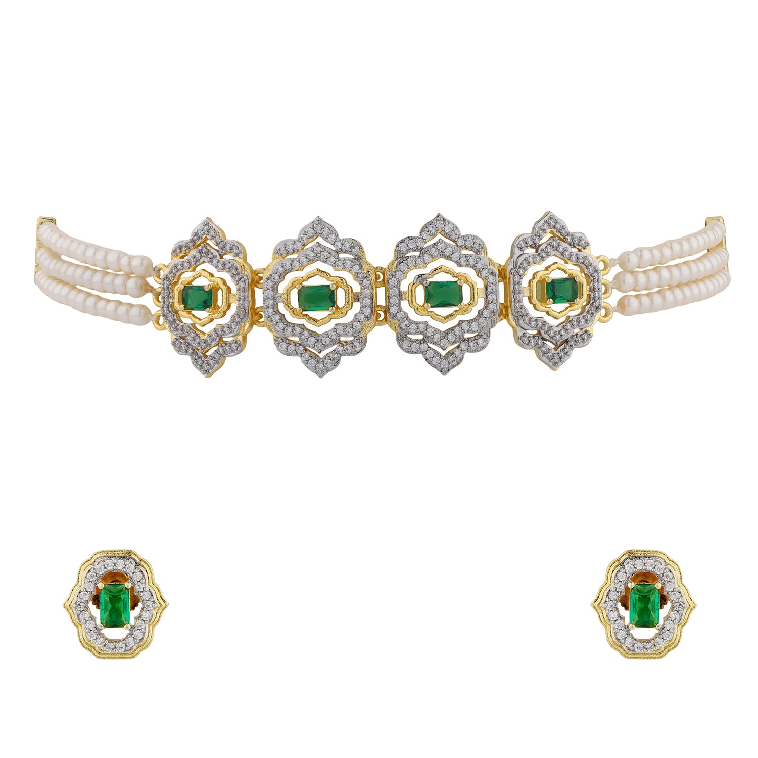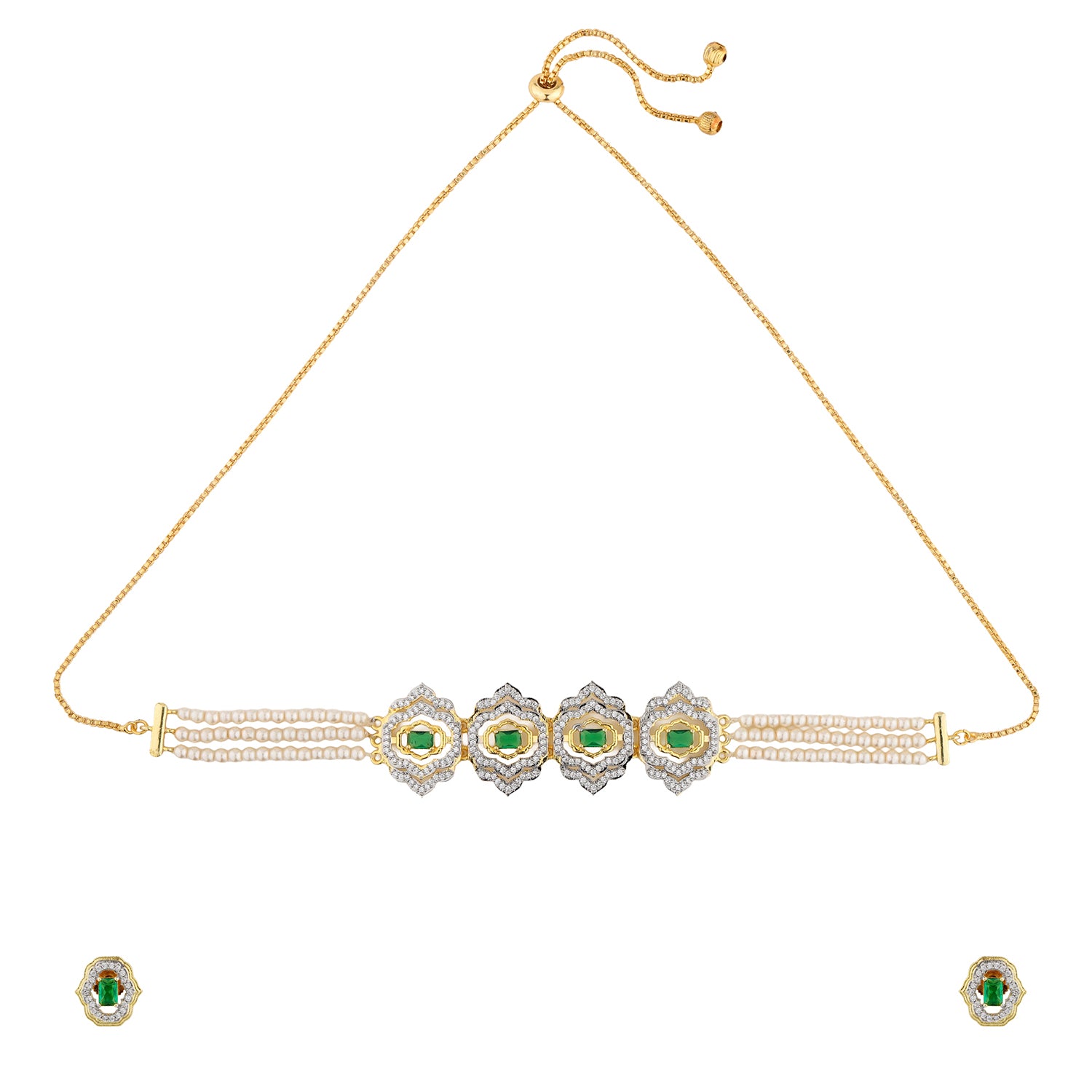 Grace your neckline with the timeless charm of the Shahi Dwar Mohini Choker Set, an exquisite fusion of regal heritage and modern artistry. Inspired by the majestic arches of Jaipur’s royal palaces, this choker embodies the elegance, strength, and poise of the women who once adorned those grand corridors. Expertly crafted from high-quality brass with luxurious yellow gold plating, the choker features intricately layered arch motifs adorned with CZ American diamonds that shimmer like starlight. At its heart lies a striking emerald-green gemstone, symbolizing prosperity and royal grace, while the three strands of pearls framing the design add a touch of traditional finesse. The matching earrings mirror the choker’s symmetrical geometry, completing a look that is both regal and refined. The Mohini Choker Set is more than just jewellery, it’s a statement of power and elegance, perfect for the woman who carries her heritage with modern sophistication.