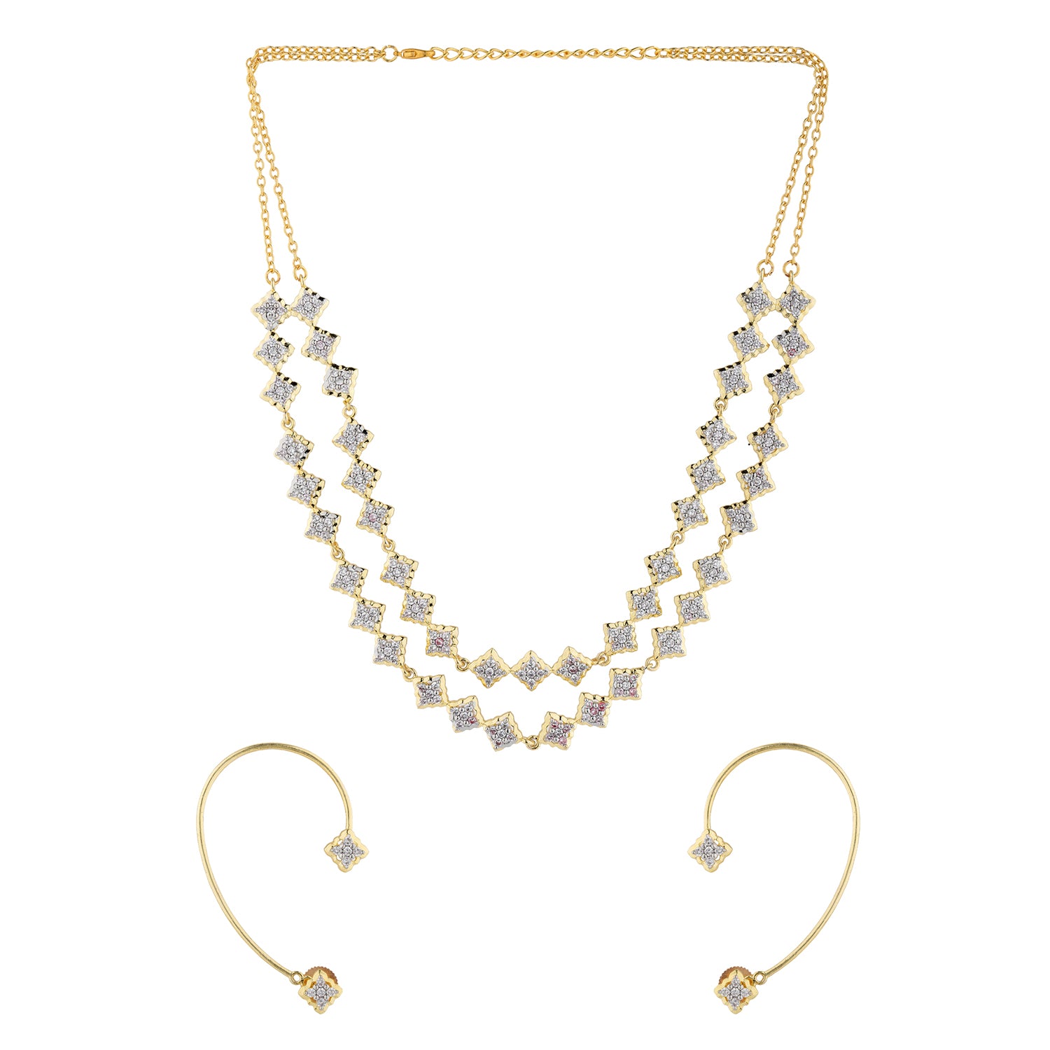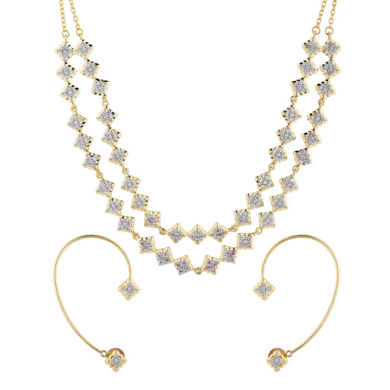 A celebration of timeless elegance and royal craftsmanship, the Shahi Dwar Rawal Dastoor Necklace Set is a masterpiece that bridges traditional opulence with modern versatility. Inspired by the grandeur of Jaipur’s royal gateways, this set reflects the intricate symmetry and balance found in regal architecture, a true tribute to the artistry of the Shahi Dwar Collection. Handcrafted from fine brass with luxurious yellow gold plating, the necklace features two graceful rows of diamond-shaped motifs, each encrusted with brilliant CZ American diamonds that sparkle like a thousand stars. Its design embodies effortless sophistication — symmetrical, sleek, and stunningly radiant. The highlight of this set is its interchangeable earrings that can be worn in two unique styles. as elegant cuffs for a bold statement, or as delicate studs for a minimal yet classic look. Versatile and luxurious, the Rawal Dastoor Necklace Set seamlessly transitions from festive gatherings to evening galas making it the ultimate choice for women who admire both functionality and fine design.