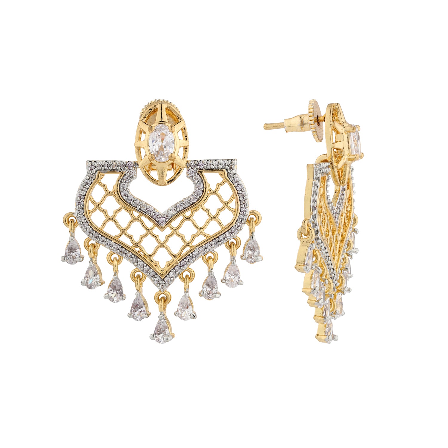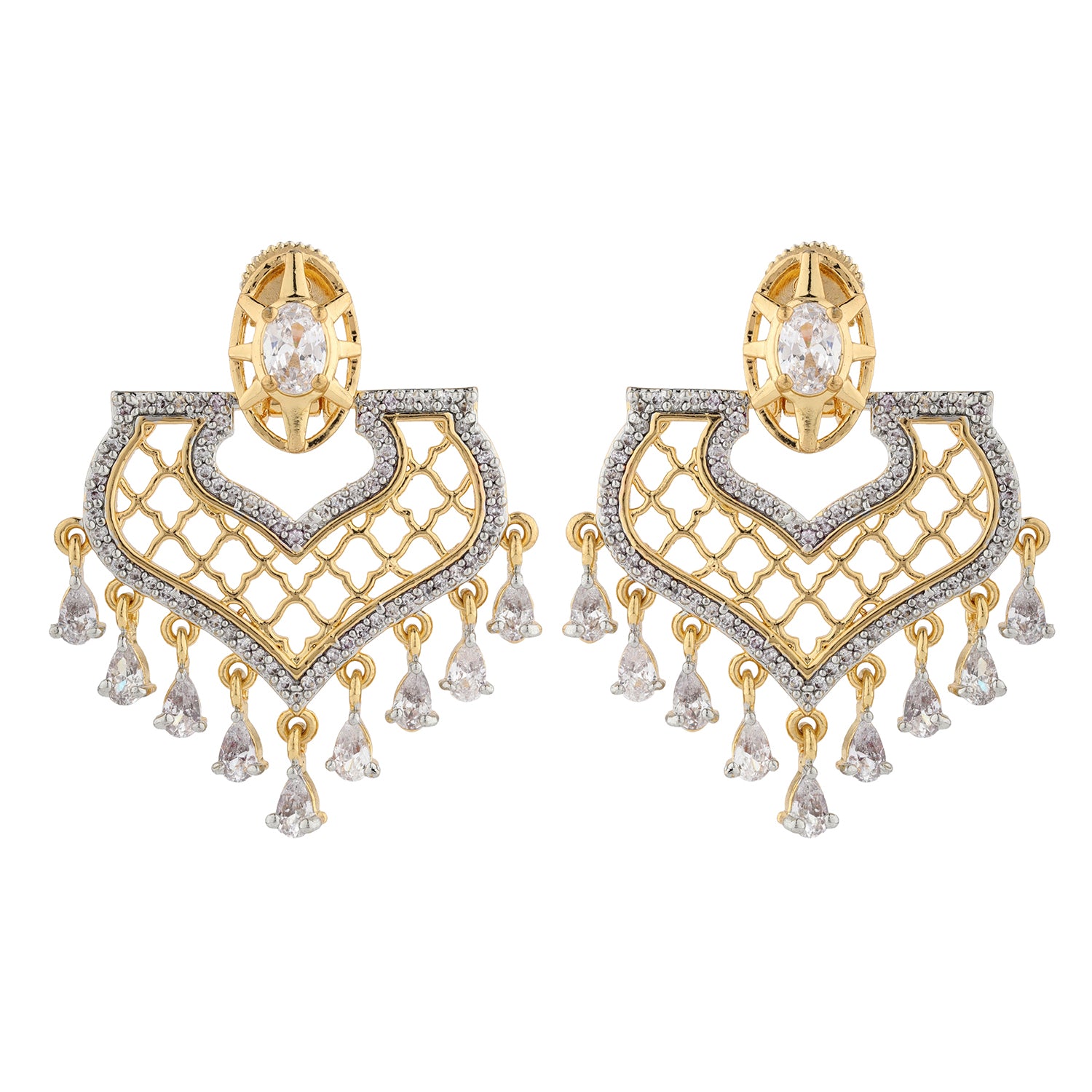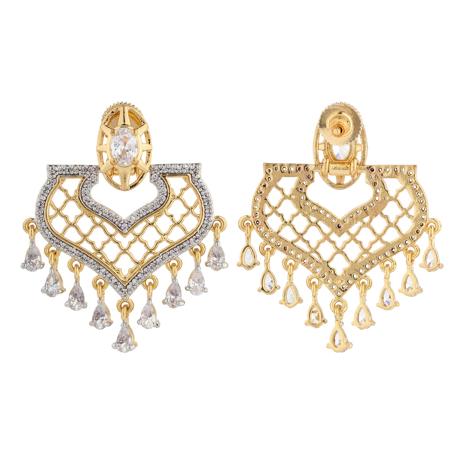 The Shahi Dwar Sundari Dangler Earrings are a stunning tribute to the grandeur of Jaipur’s royal architecture where beauty meets heritage, and elegance meets craftsmanship. Inspired by the intricate lattice windows and graceful arches that adorn the palaces of Rajasthan, these designer earrings translate timeless artistry into modern luxury. Crafted from high-quality brass with a rich yellow gold plating, the design features a majestic heart-shaped arch structure filled with detailed filigree latticework. The borders are accentuated with glimmering CZ American diamonds, adding a radiant sparkle, while dainty teardrop CZ hangings gently sway below, catching the light with every move. A central oval-cut CZ stone crowns the piece, exuding regal sophistication. The Sundari Danglers beautifully balance traditional charm with contemporary grace, lightweight, elegant, and full of royal appeal. Whether paired with festive ensembles or evening gowns, these stylish earrings make a statement that feels both royal and refined.