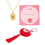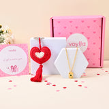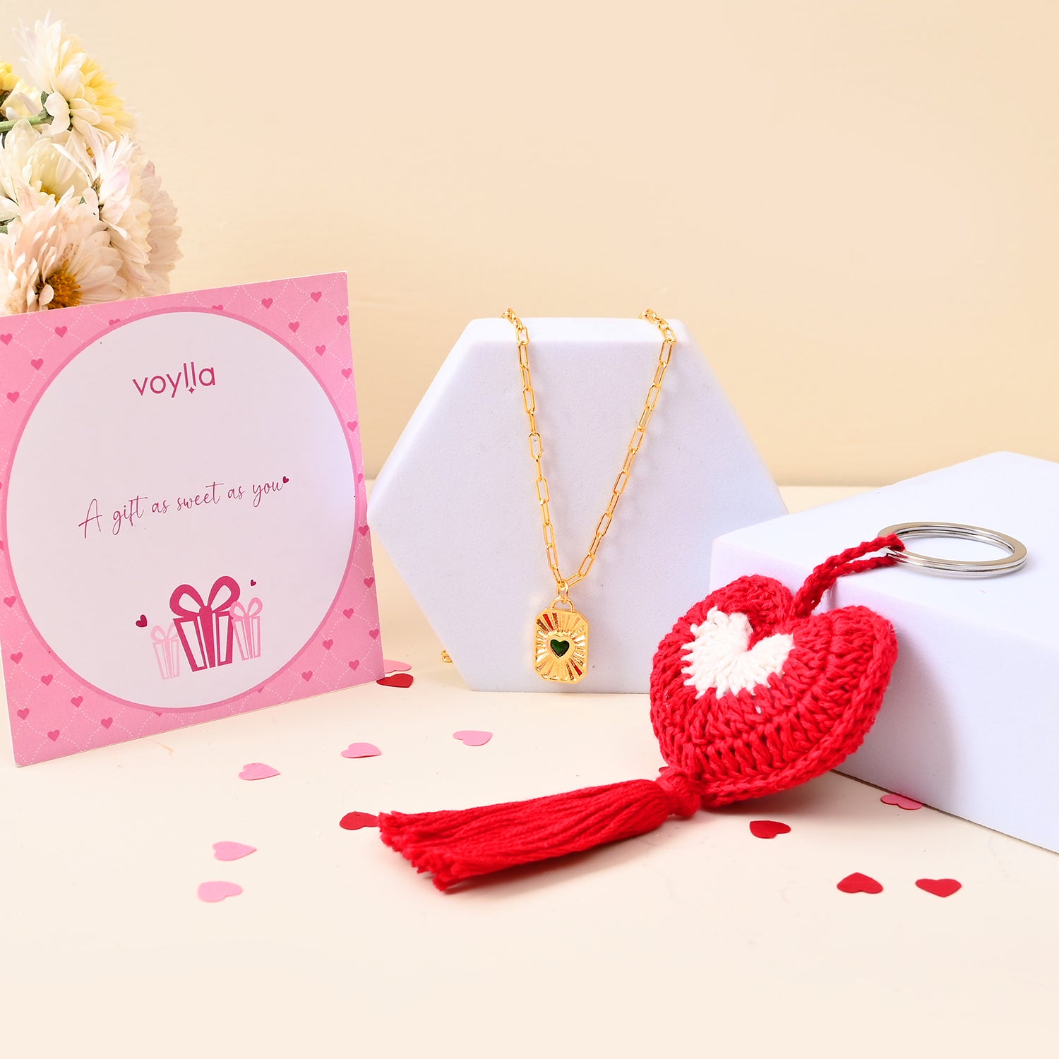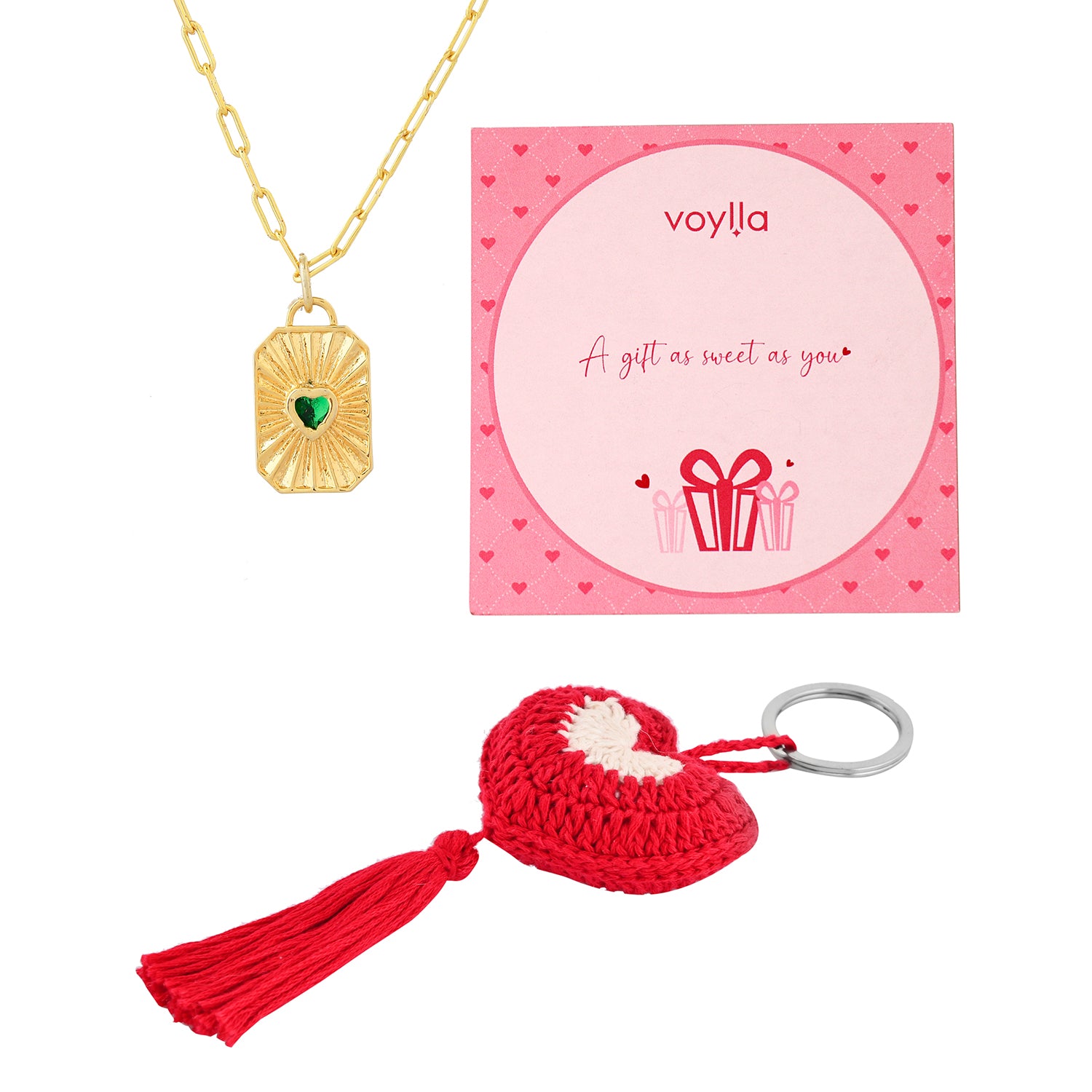 The Love Bundle Valentine Hamper is the ultimate women's Valentine's gift, meticulously curated to express your deepest emotions. This elegant set includes the Ray Of Love Pendant, which boasts a radiant gold finish paired with a stunning green stone at its center, perfect for party wear or any festive occasion. Complementing the pendant is an intricately crocheted red heart keychain with a charming white heart detail, exuding handmade charm and thoughtfulness. The set is completed with a heartfelt card that reads, "A gift as sweet as you," adding a personal touch to the ensemble. The combination of high-quality materials and meticulous craftsmanship ensures each piece's durability and style, making this hamper the ideal Valentine's gift for your girlfriend or wife. This collection not only speaks of elegance but also serves as a lasting token of your love and appreciation. Ideal for those looking for unique Valentine's Day gift ideas or gifting options, this hamper is sure to delight and impress your loved one.