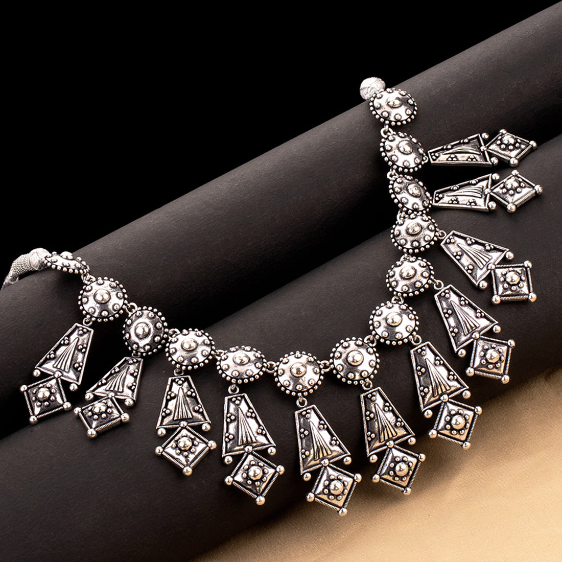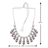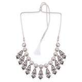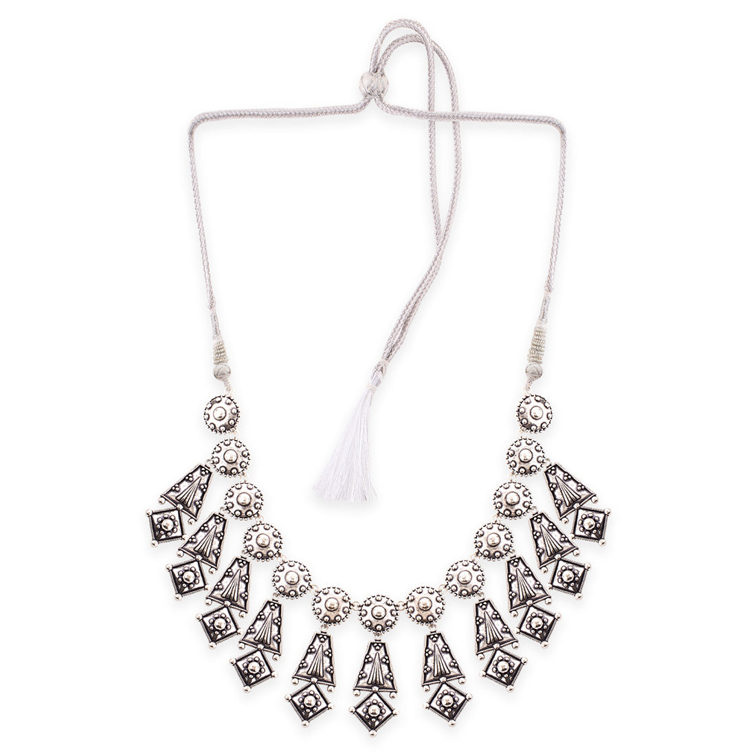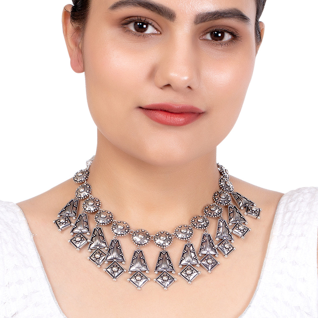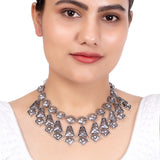 Adorn your neck beautifully with this choker necklace. This necklace has been crafted with brass and has given an excellent finishing of oxidized silver. You can be worn with medium necklines and shirts.Weight (Gms): 35Size (LxW)(Inch): 15.5*10Material: BrassPlating: Oxidized Silver...
