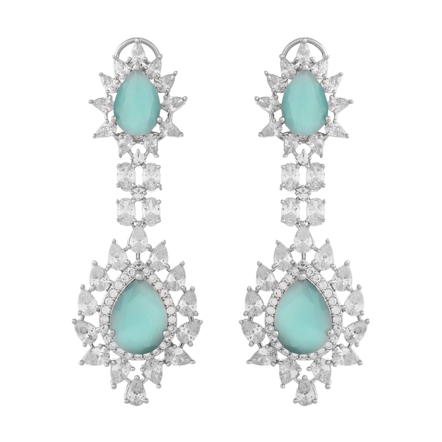 Enhance your festive look with the Voylla American Diamond Maangtikka Set, a stunning set for women. This exquisite set features a rhodium-plated brass base adorned with sparkling cubic zirconia stones. The design showcases a beautiful combination of teardrop-shaped turquoise stones surrounded by shimmering white stones, creating a captivating and elegant look. Perfect for Navratri, Puja, Diwali, Durga Puja, Rakhi, and other festive occasions, this maangtikka set makes an ideal gift for your wife, sister, girlfriend, mother, or friend. Celebrate the festivities in style with this dazzling American Diamond Maangtikka set from Voylla.