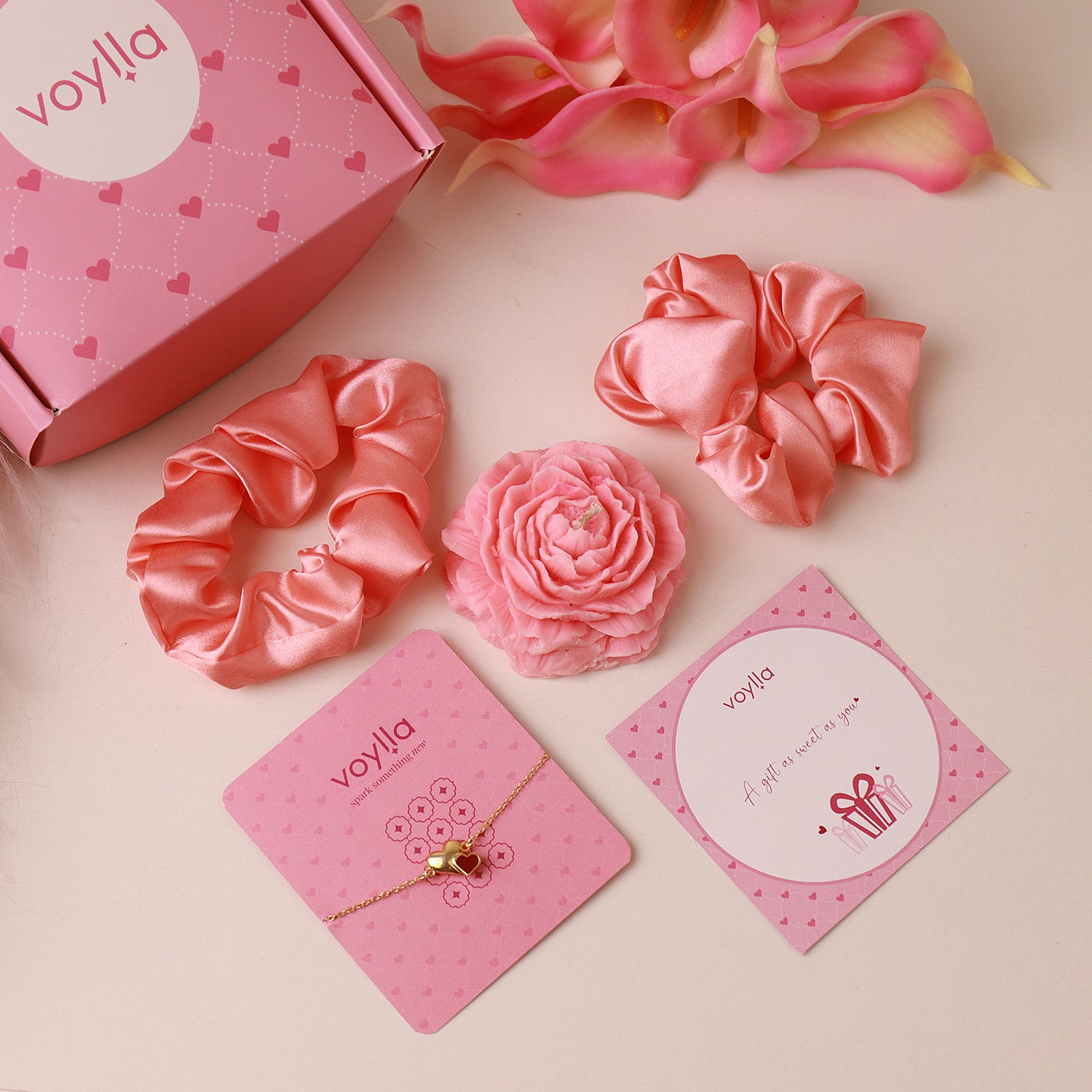 The Valentines Galentine Floral Goodies Hamper is an exquisite women's Valentine's gift, perfect for celebrating love and friendship. This charming collection includes a Heart Bracelet from Voylla, featuring a delicate gold chain with a beautifully crafted heart pendant that effortlessly adds a romantic flair to any outfit. The set also includes two Satin Scrunchies in a delightful pink hue, made from luxurious satin fabric that ensures both comfort and style, whether for casual outings or festive events. To top it all off, the Peony Flower Candle exudes elegance with its intricate design resembling a blooming peony, creating a warm and inviting ambiance. This thoughtfully curated hamper is an ideal gift for women, whether it's for a girlfriend, wife, or lover, and is sure to make Valentine's Day unforgettable. Combining high-quality materials, elegant designs, and versatile styling options, this hamper stands out as the perfect gifting solution for the season of love.