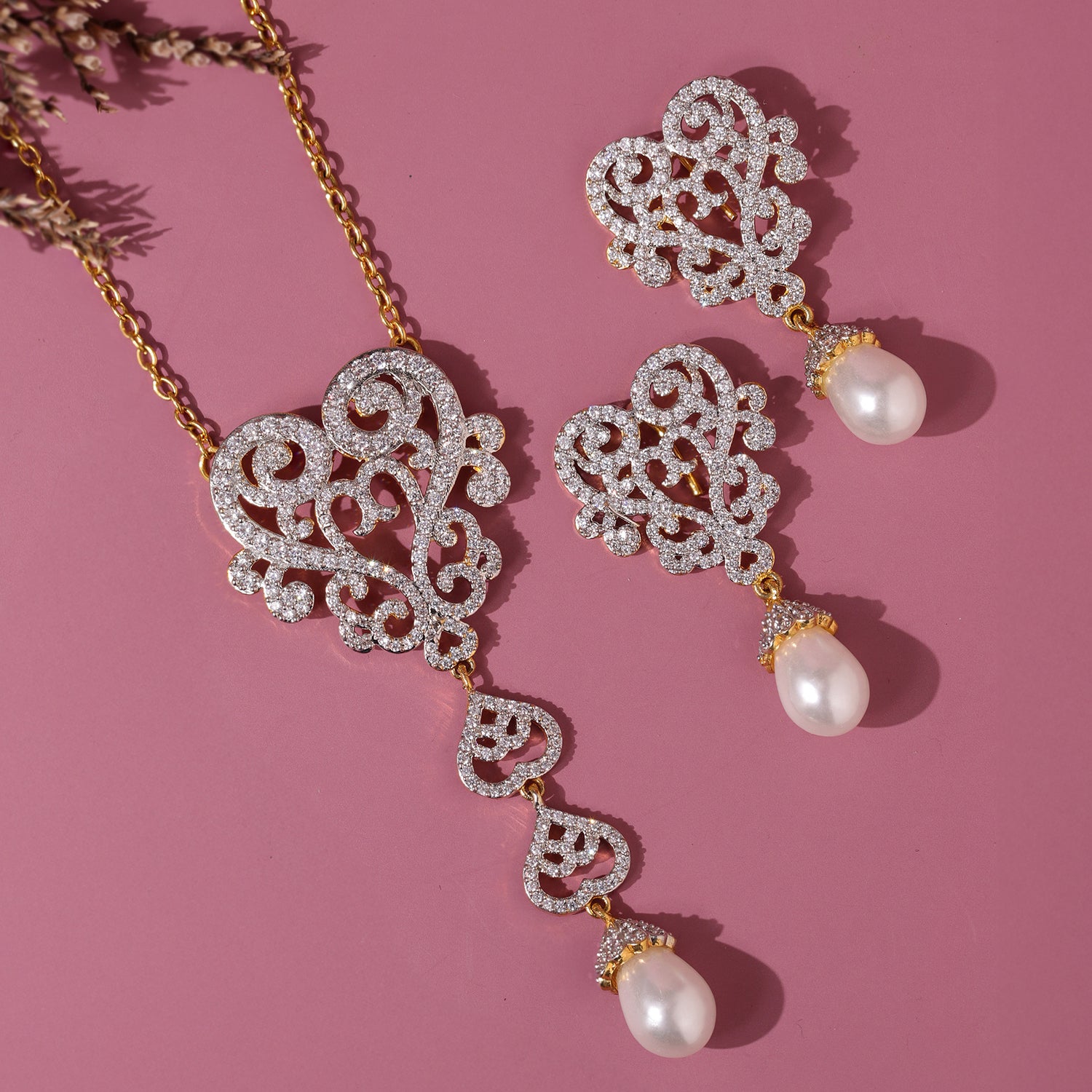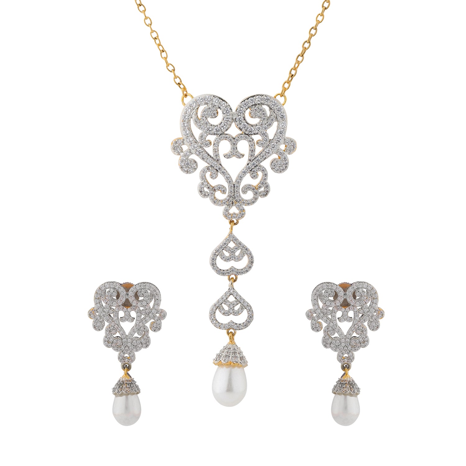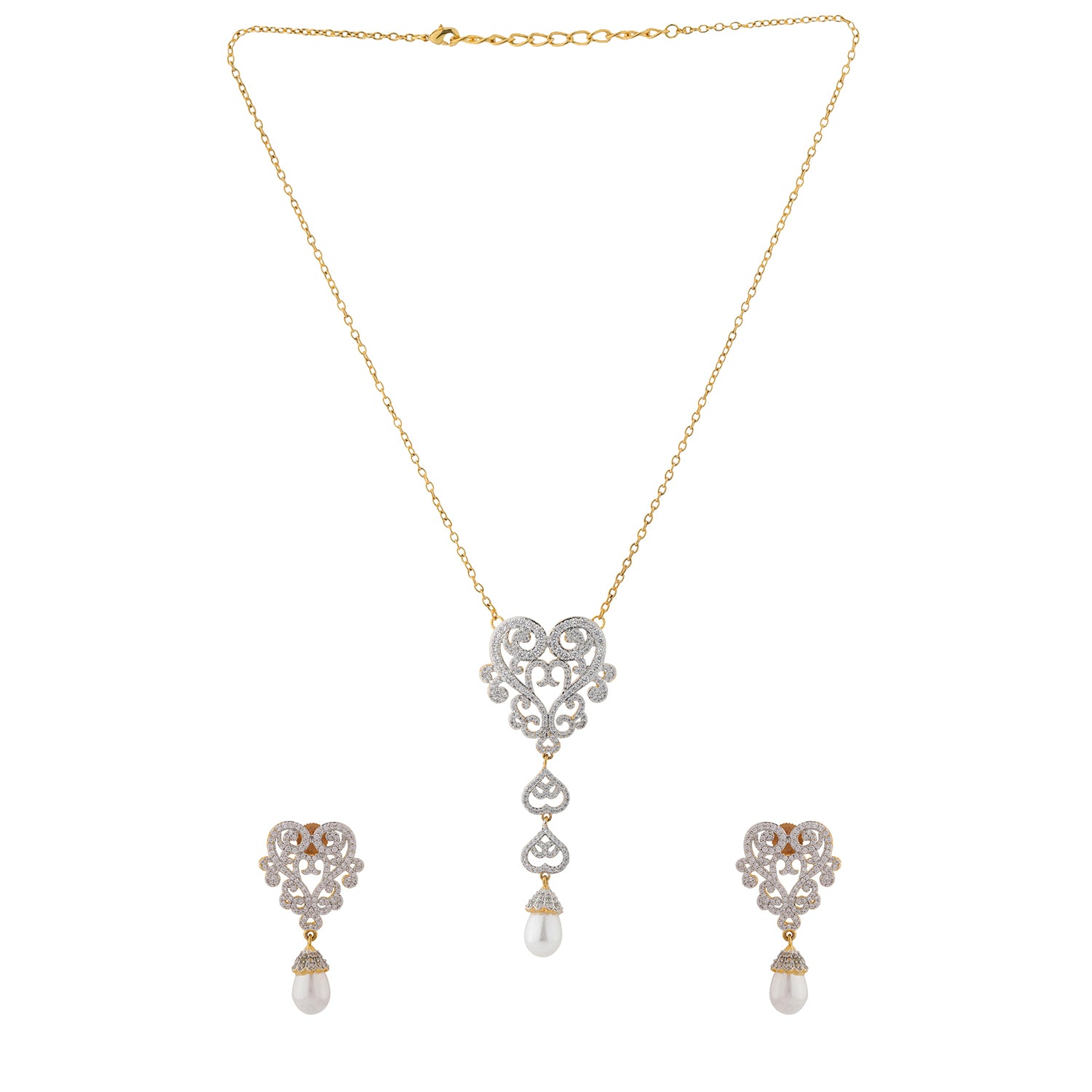 The Royal Romance Mary Gold Necklace Set is a graceful expression of elegance and timeless beauty, crafted for women who love refined jewellery with a romantic touch. Belonging to the exquisite Royal Romance collection, this necklace set for women features an intricate heart inspired motif adorned with sparkling CZ stones and finished with delicate pearl drops. The design beautifully balances classic charm and modern sophistication, making it a standout women necklace set for special occasions. Made from high quality brass and coated with luxurious yellow gold plating, this american diamond necklace set offers durability, comfort, and a radiant shine that lasts. The soft white sparkle of CZ stones paired with the warm gold tone and elegant pearls creates a rich and graceful look that enhances both ethnic and contemporary outfits. This jewellery set for women is thoughtfully designed to frame the neckline elegantly while adding movement and charm through its drop detailing. Perfect for celebrating love, friendships, and self appreciation, this cz necklace set is ideal for valentines day, galentine day, romantic dinners, weddings, and festive events. Whether you are gifting it to someone special or choosing a gift for self as an act of self love, this necklace set speaks of romance, elegance, and timeless style.