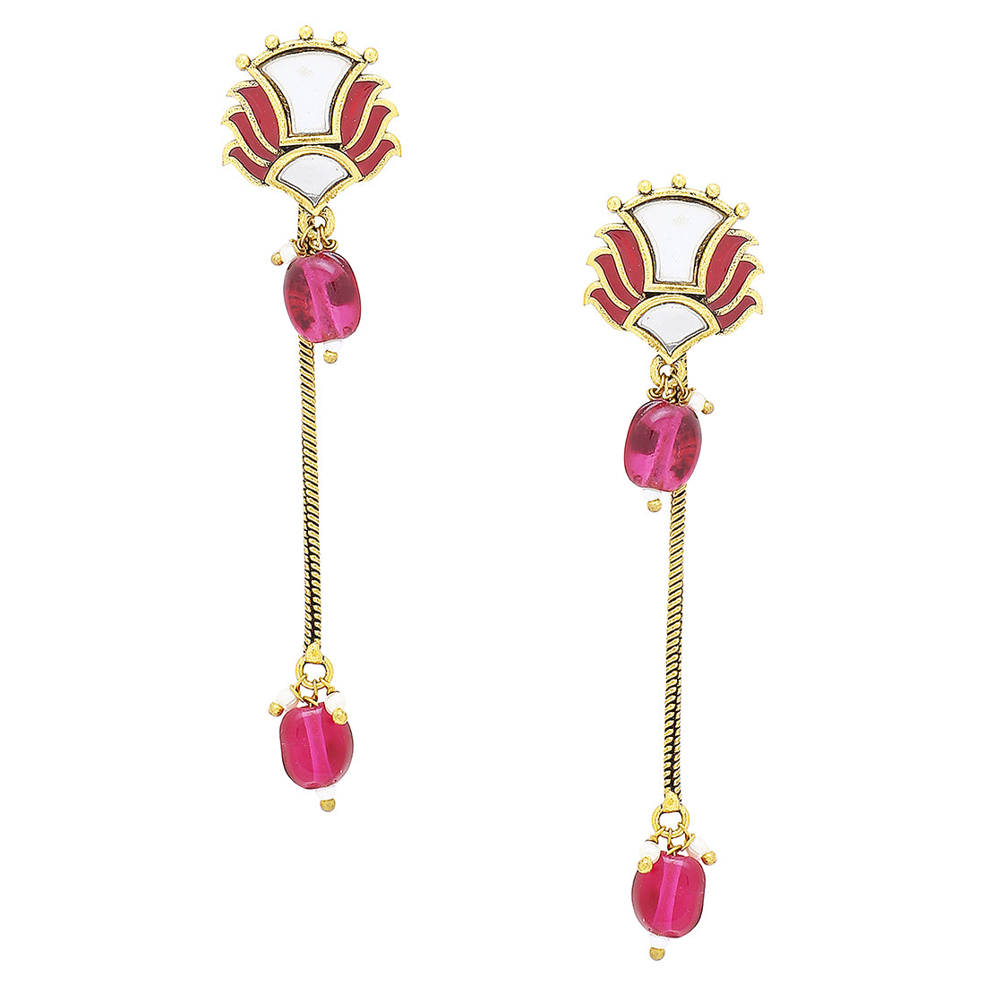 Long drop casual style earrings fashioned out of brass and designed as a tribute to Rajasthan's traditional art form, Thikri. Fashioned out of brass and lightly embellished, the pair features mirror work and oxidised yellow gold plating. Wear with an ethnic summer dress.