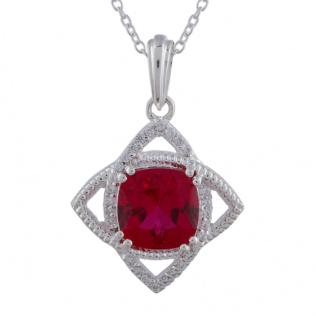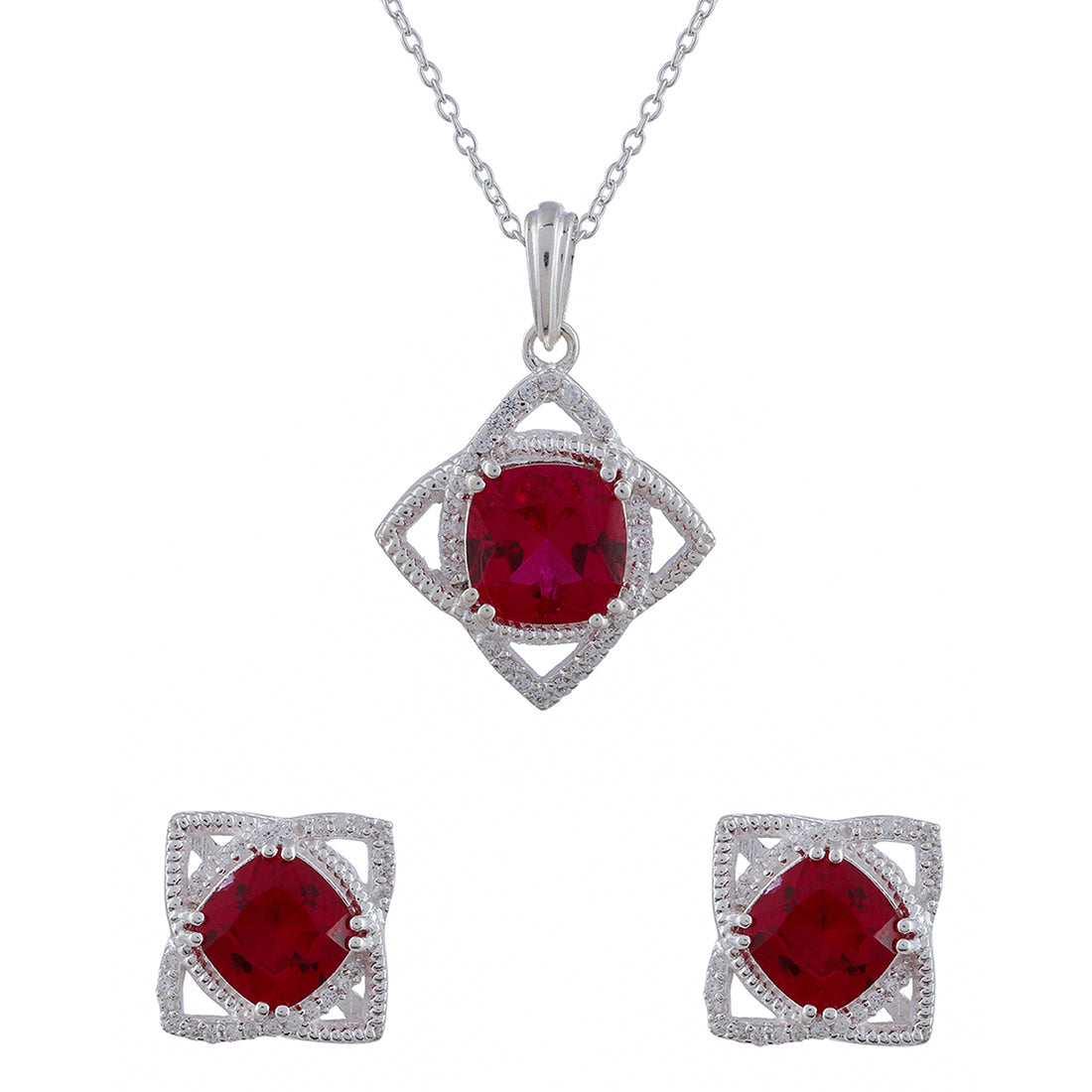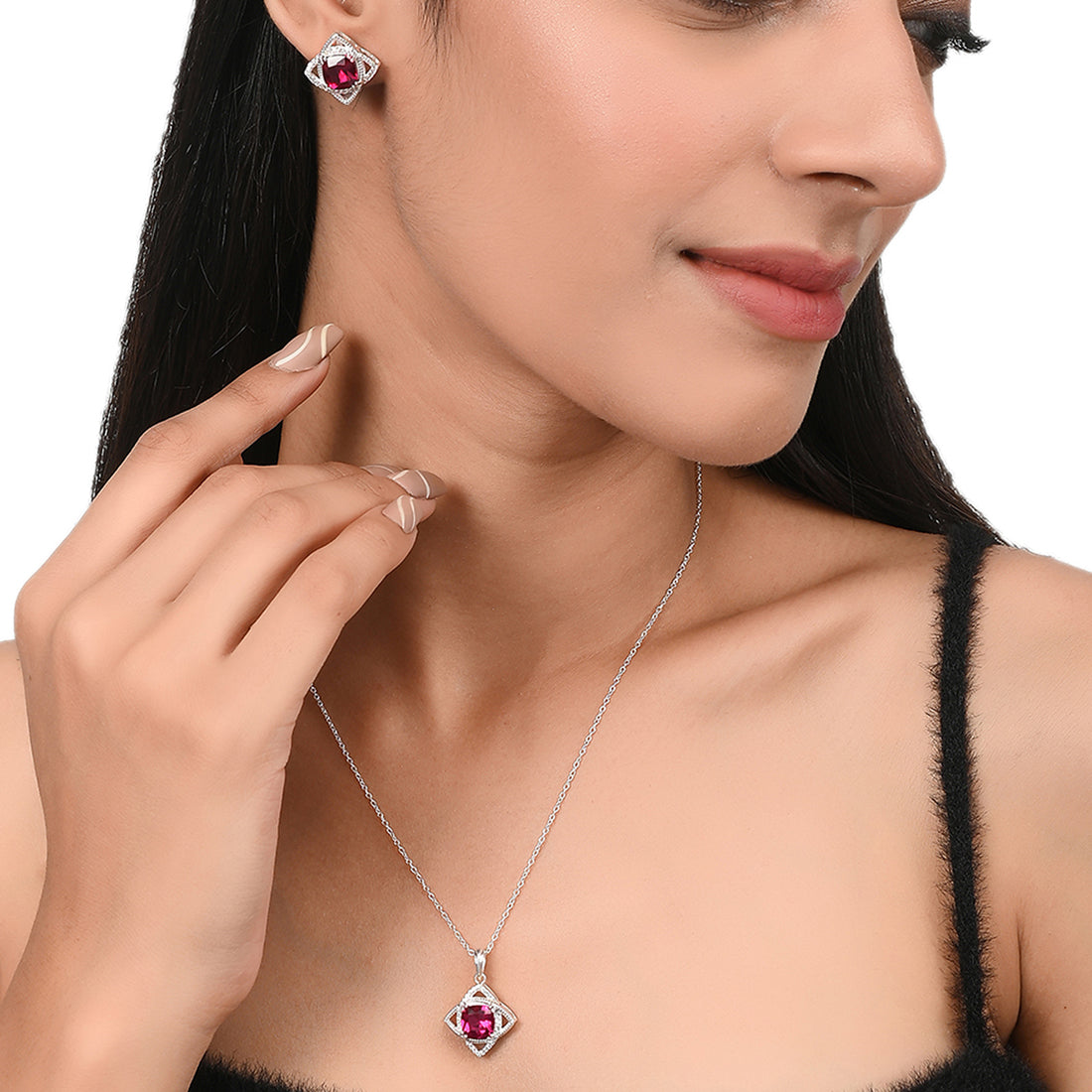 CZ Embellished And Red Stone Studded Sterling Silver Pendant Set