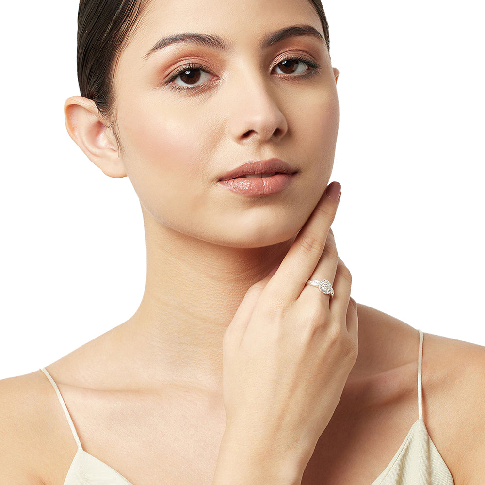 Created in sterling silver, the ring features a encircled woven setting of american diamonds in a seemless fashion. This beautiful statement ring is the perfect accessory for everyday wear. Style Tip: The ring can be worn individually or paired with the single lined necklace to create a dazzling look.