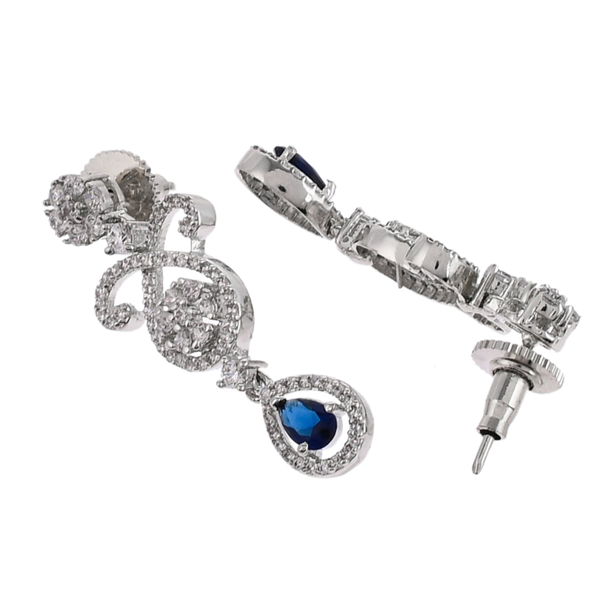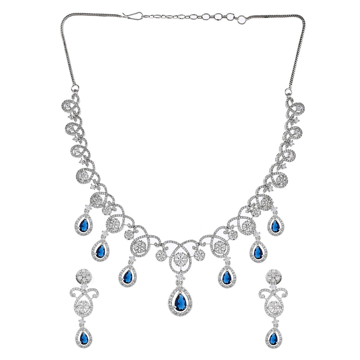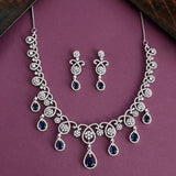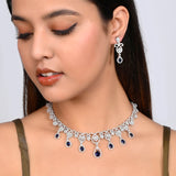 Brass jewellery set with royal blue teardrop cut zirconia gemstones. Pair the silver plated set with a designer saree or cocktail gown.