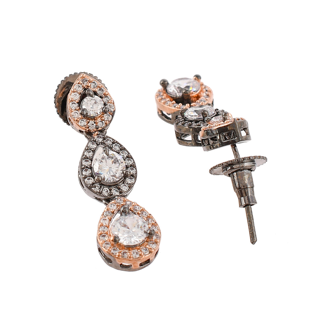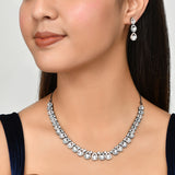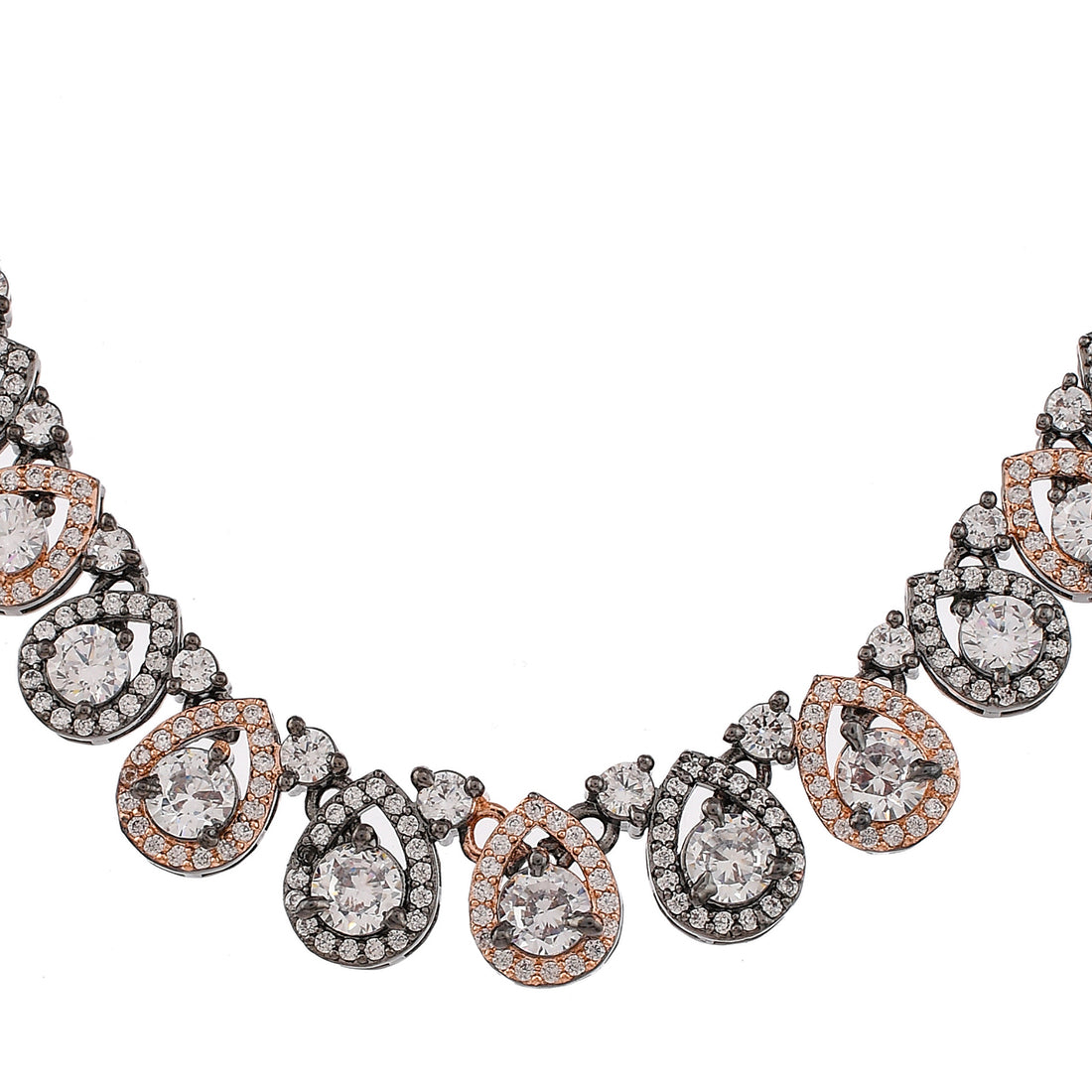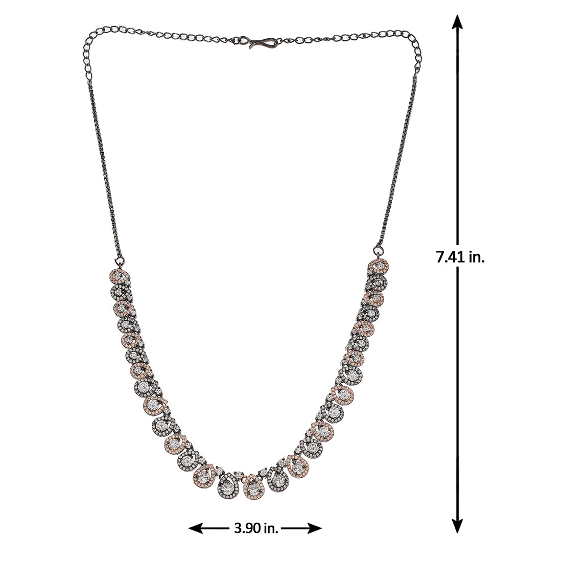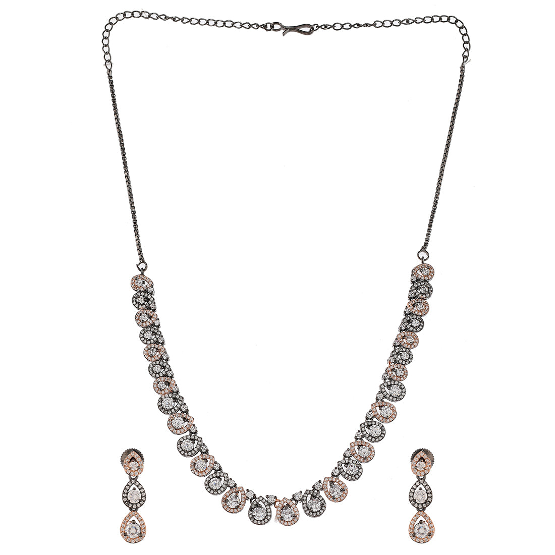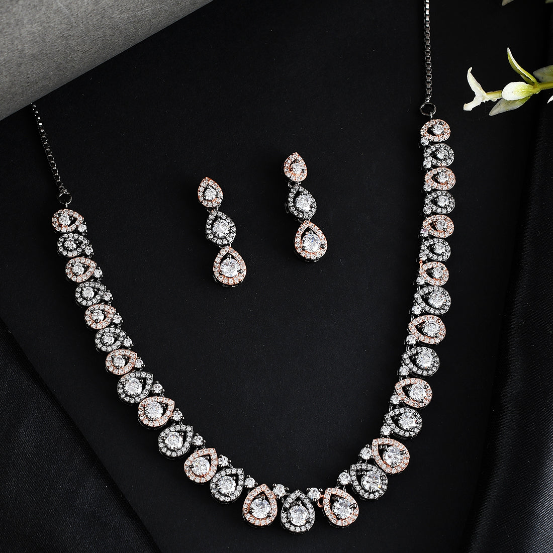 Make a statement with the CZ Elegance Necklace and Earring Set in dual tone. The combination of silver and gold creates a stunning contrast that is sure to turn heads. The intricate design, complete with sparkling CZ stones, adds a touch of glamour and sophistication to any outfit. Perfect for adding a touch of luxury to your everyday look or dressing up for a special occasion.