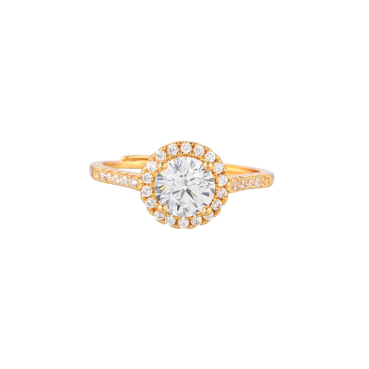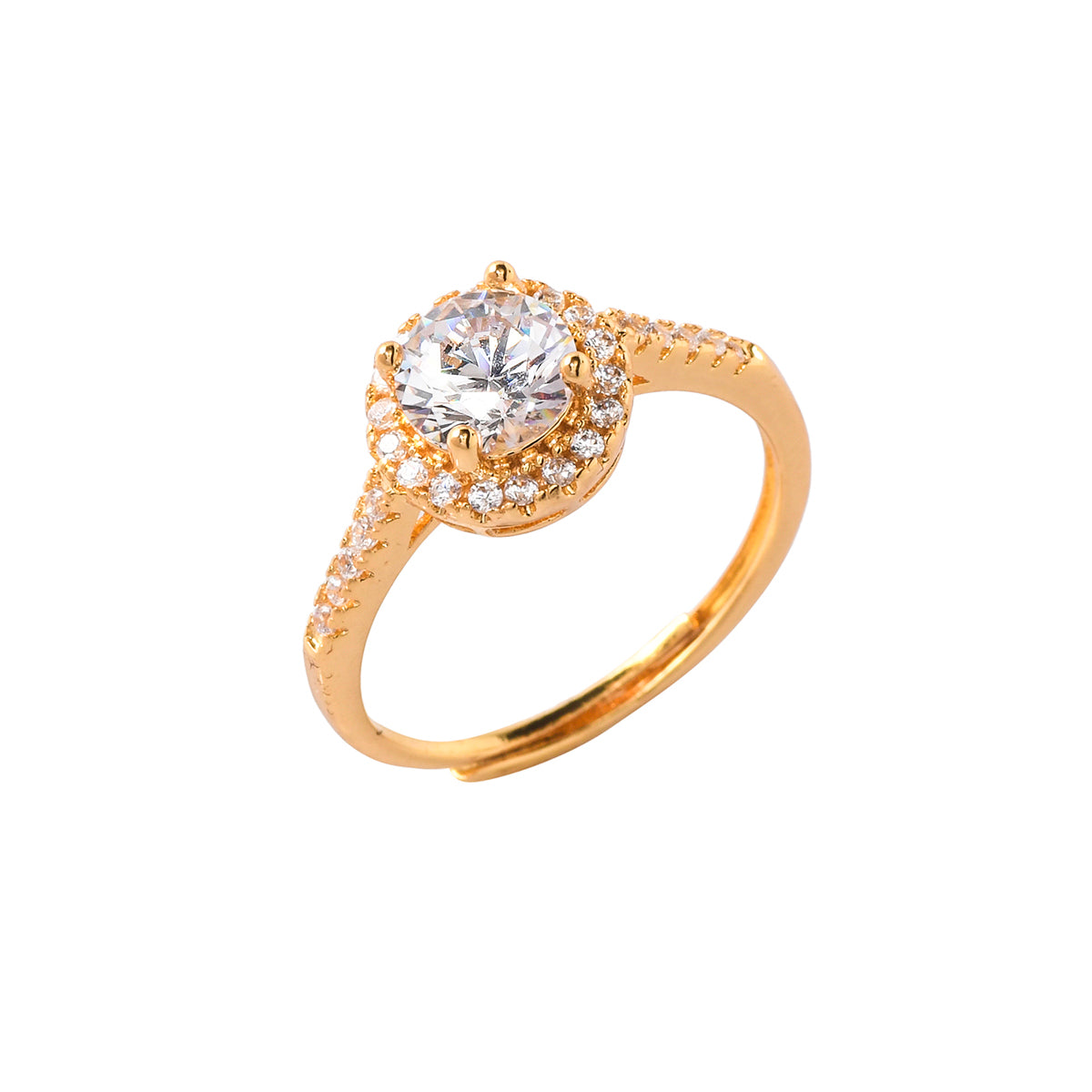 Adorned with a single deep set round cut zircon gemstone and tinier gemstones in a cluster setting, this ring has been fashioned out of quality brass. Gold plating adds to the opulence of this versatile and comfortable ring.
