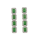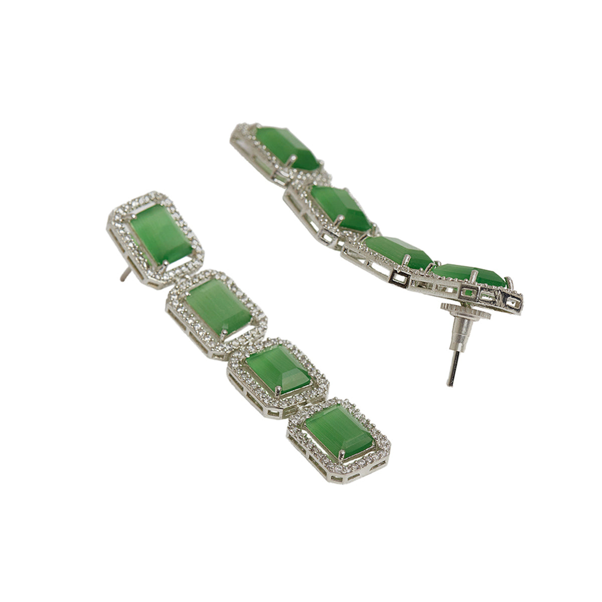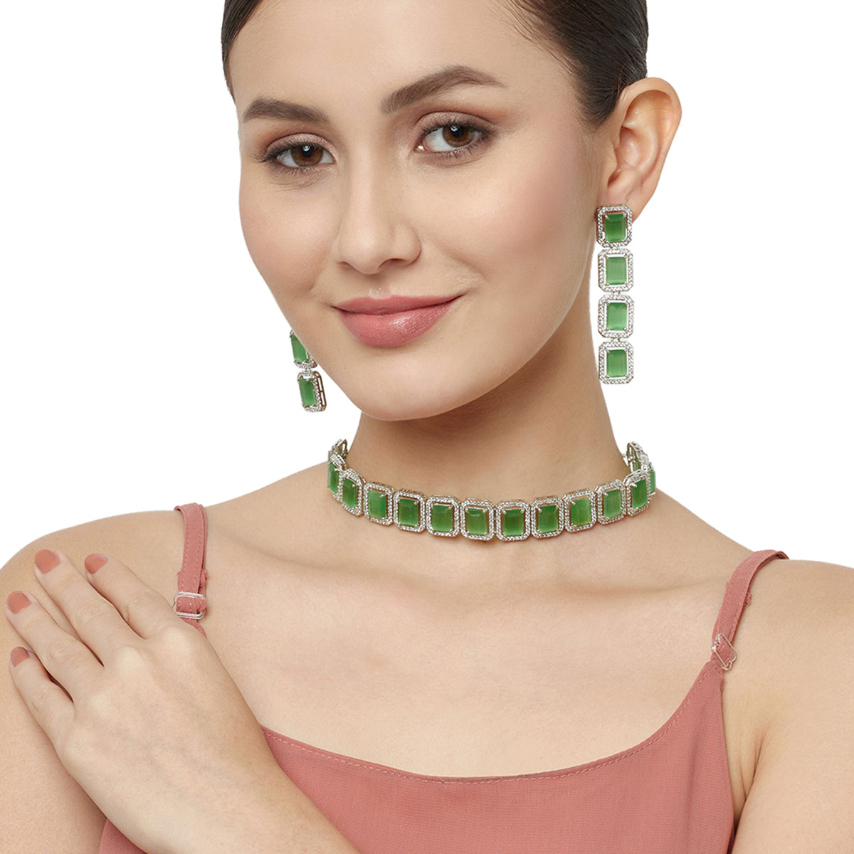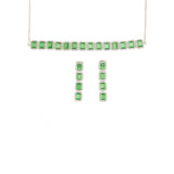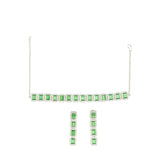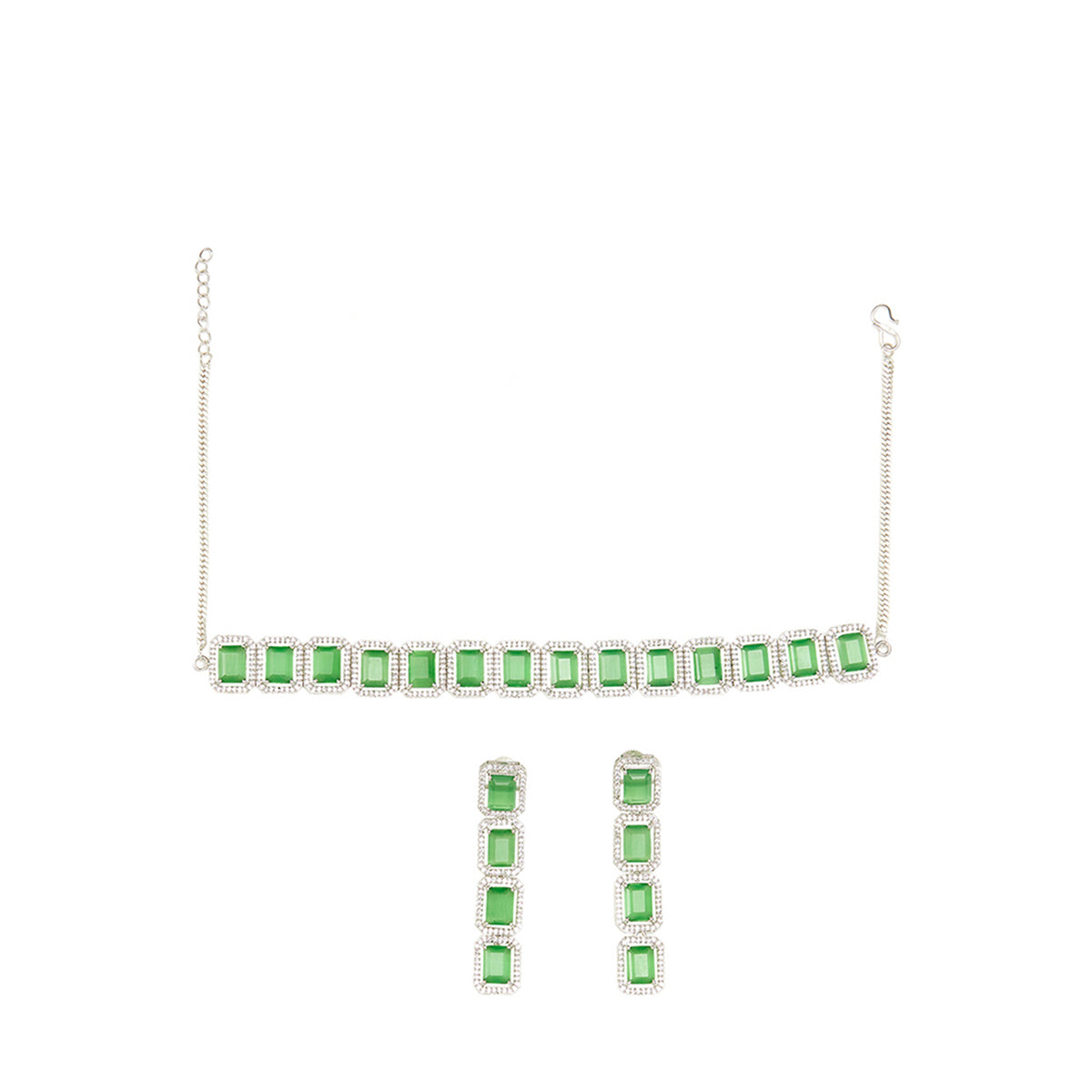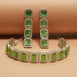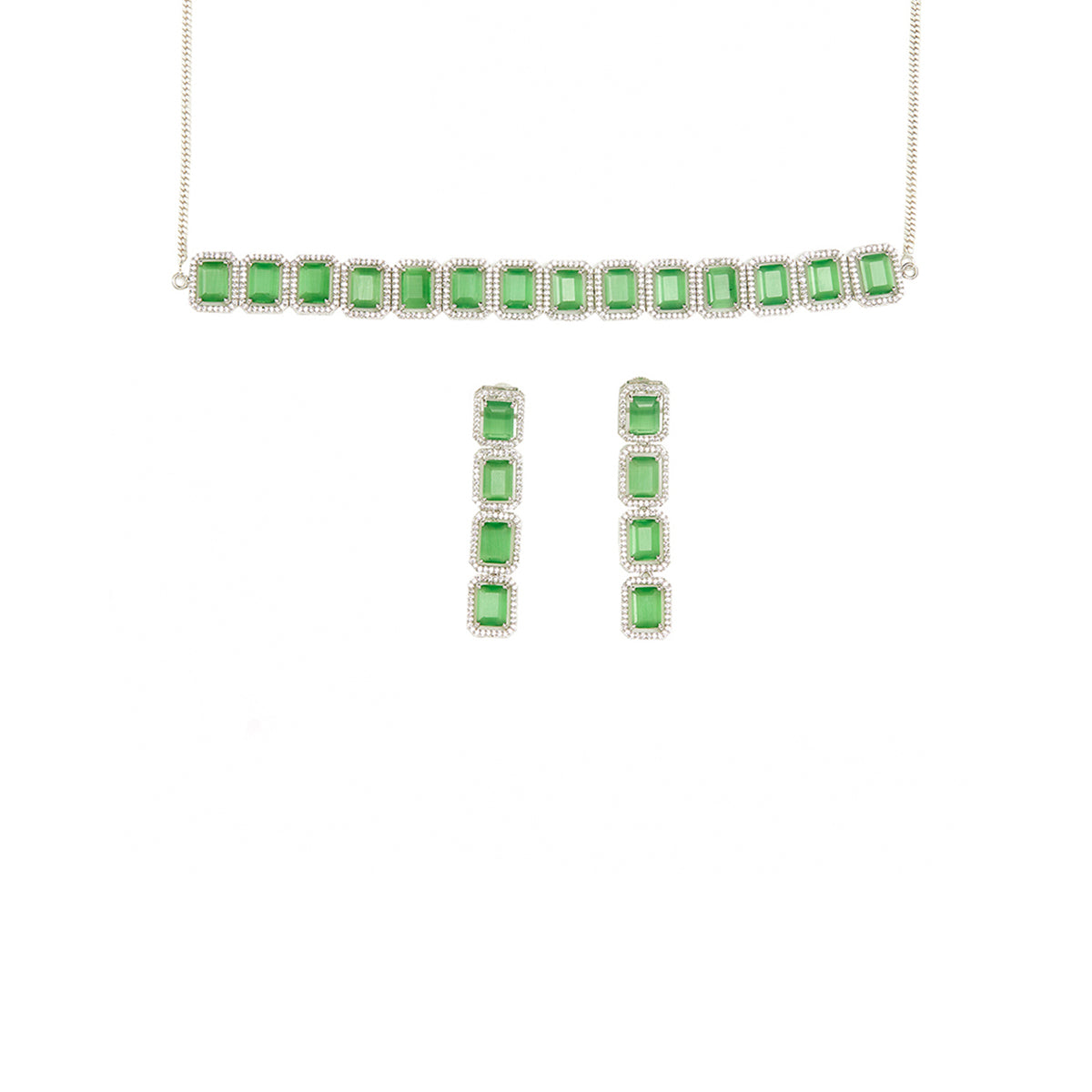 An alluring necklace set, inspired by royal Victorian pieces, crafted from brass and white rhodium plated. The necklace and drop earrings have been embellished with light green CZ gems in a baguette cut. The set can be paired with an evening gown or even with a chiffon or satin saree.