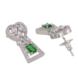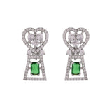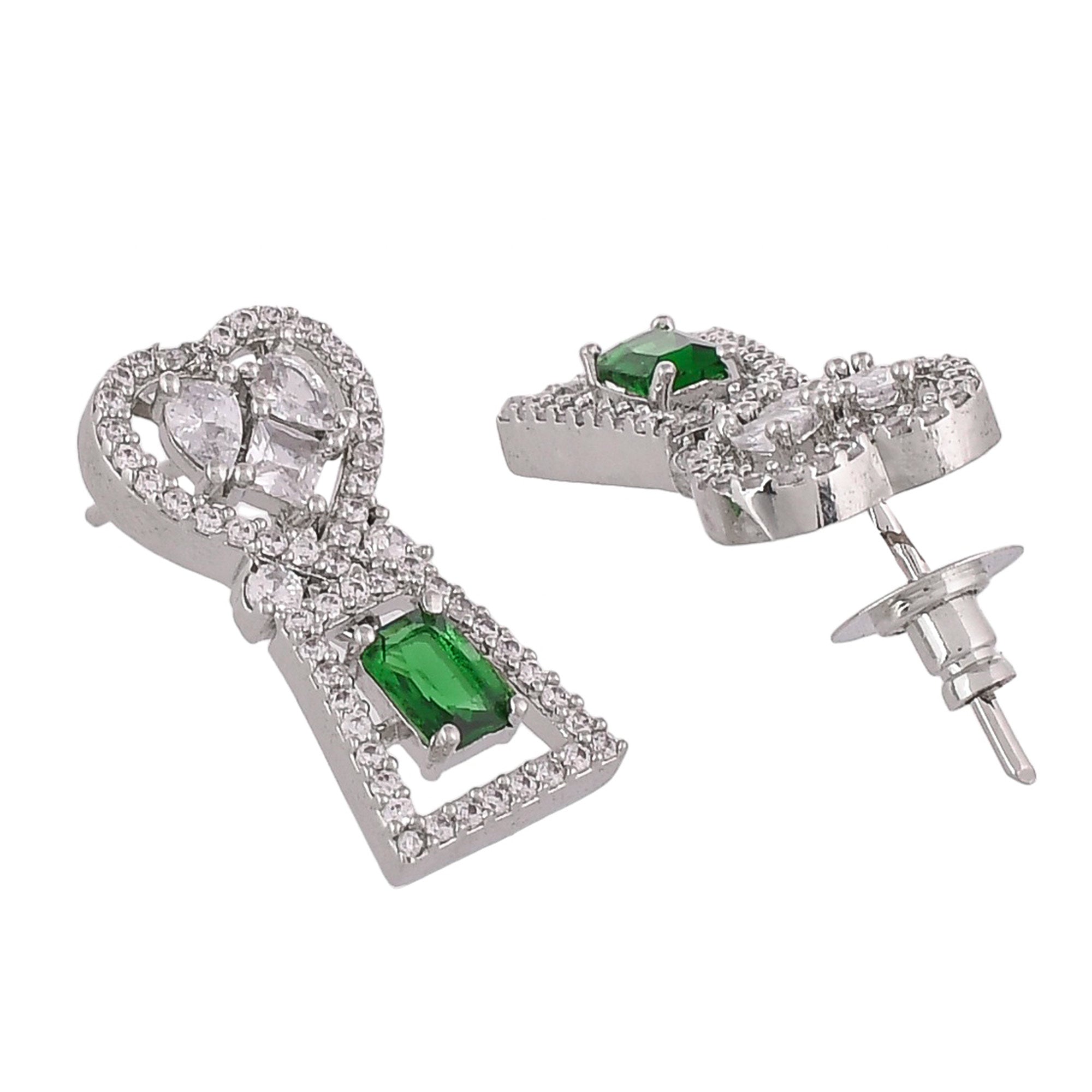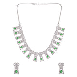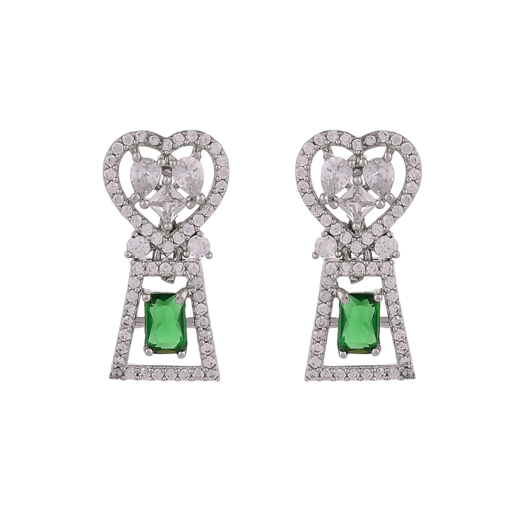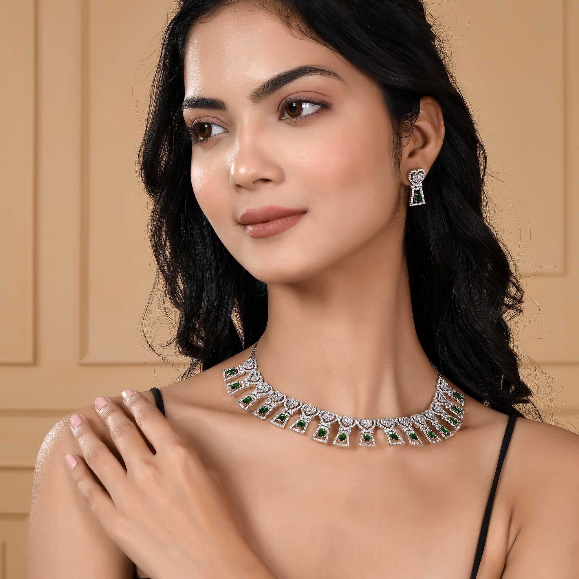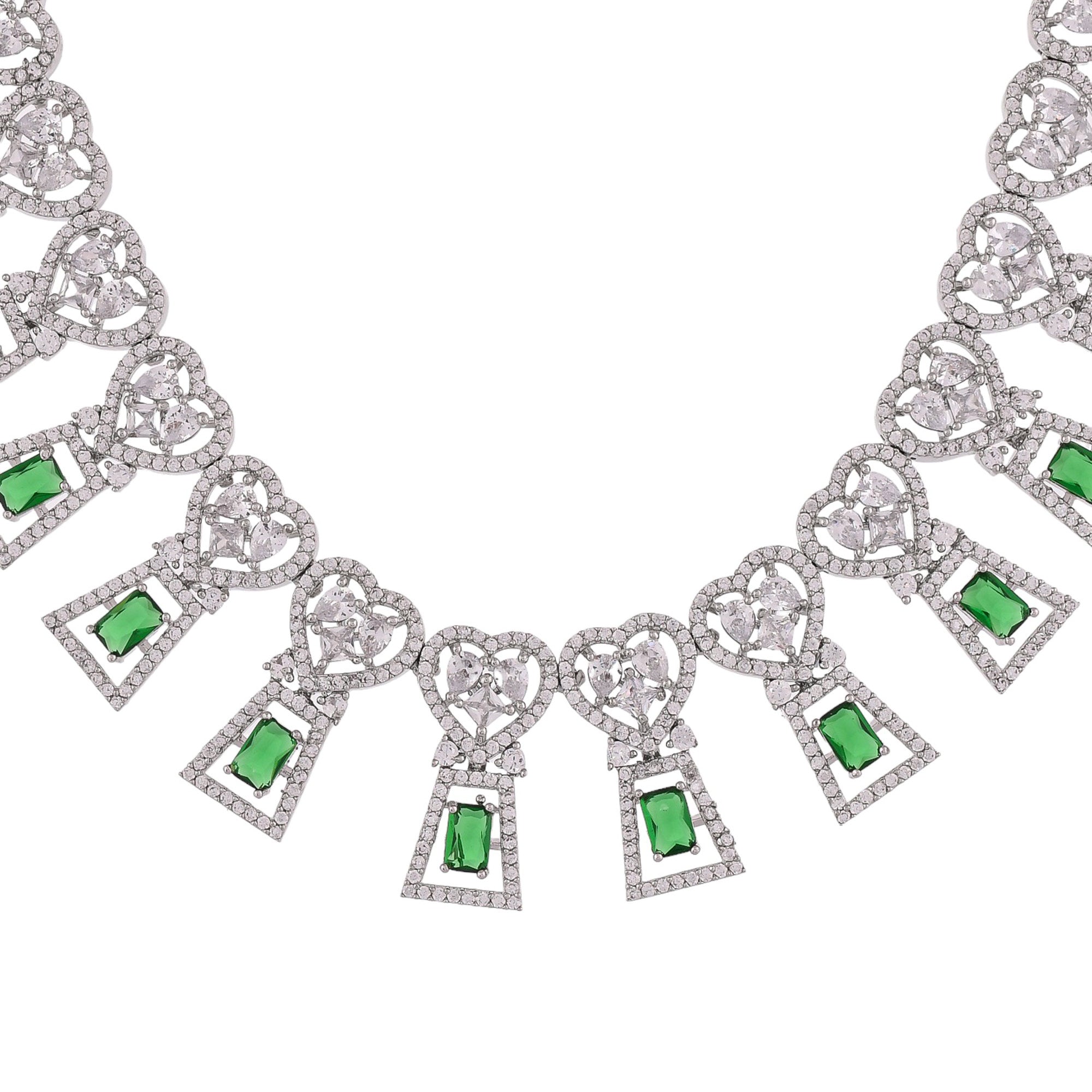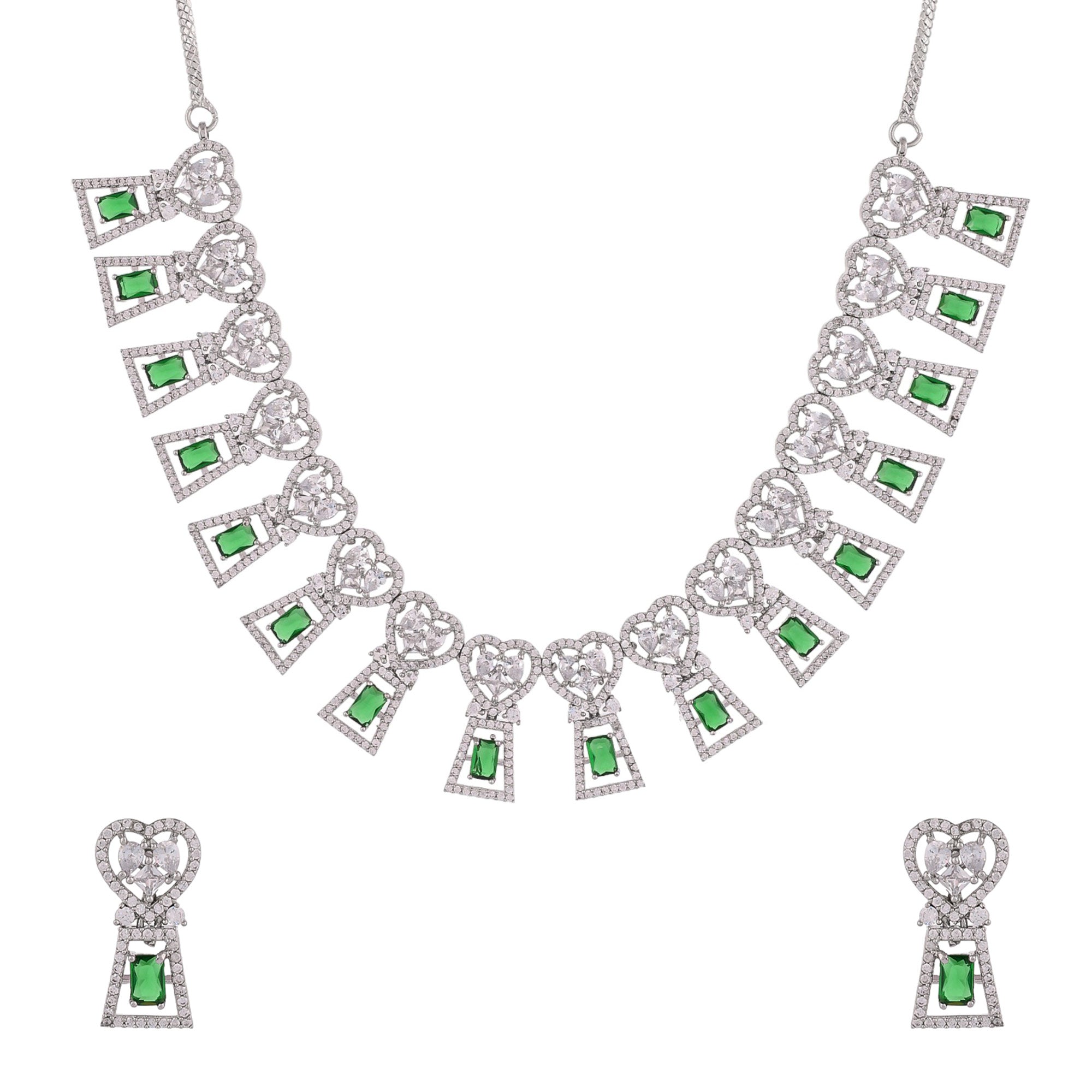 Fashioned from quality brass into heart motifs, this jewellery set has been given a silver plating for added glam. The necklace and drop earrings have been embellished with emerald and round cut CZ gemstones in a cushion setting. Pair the set with a formal saree or evening gown.
