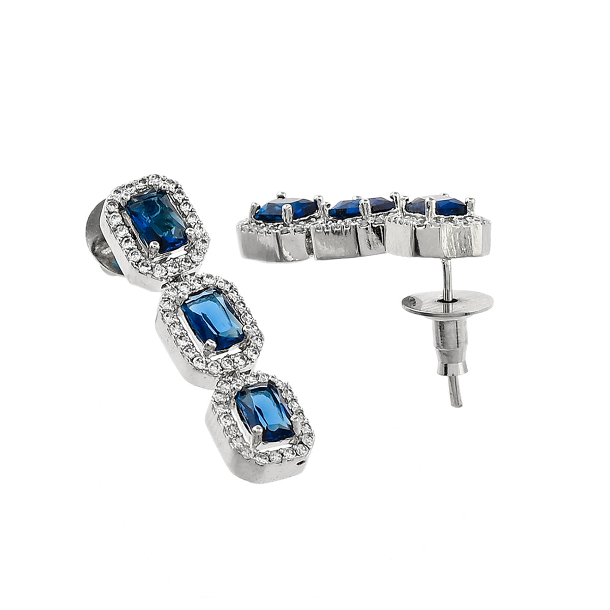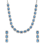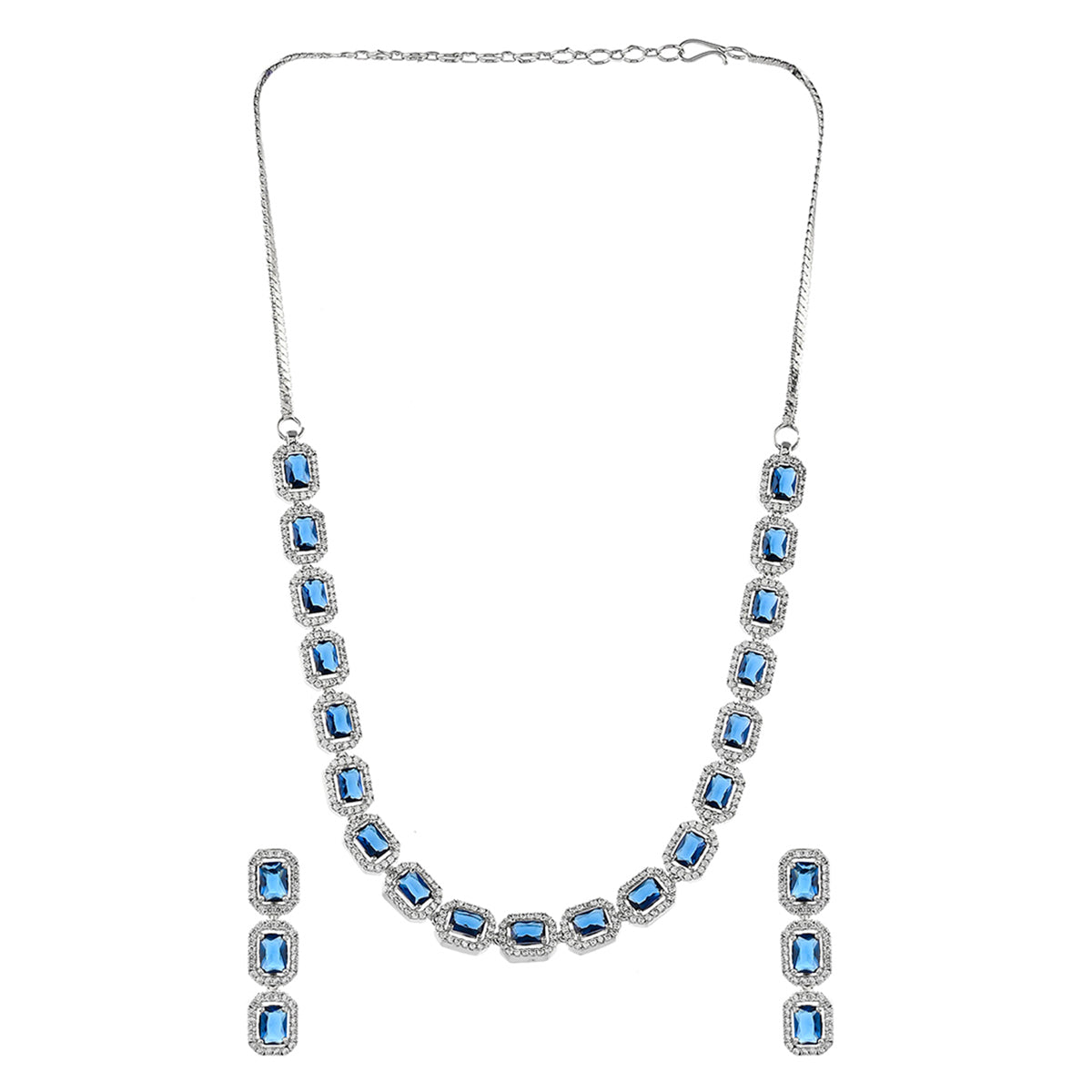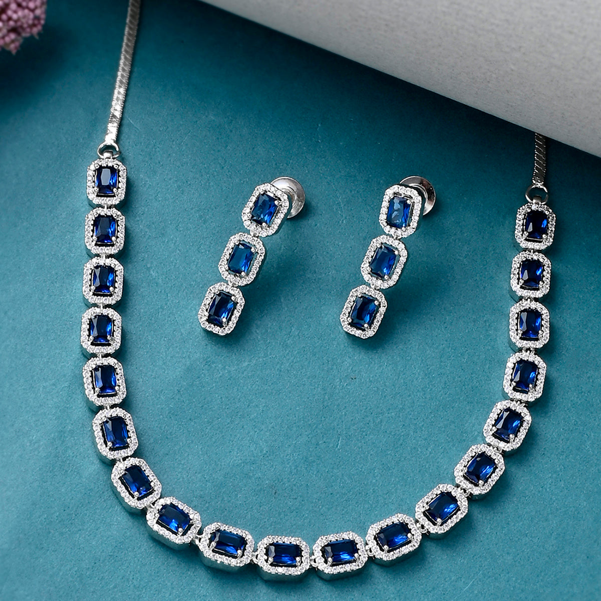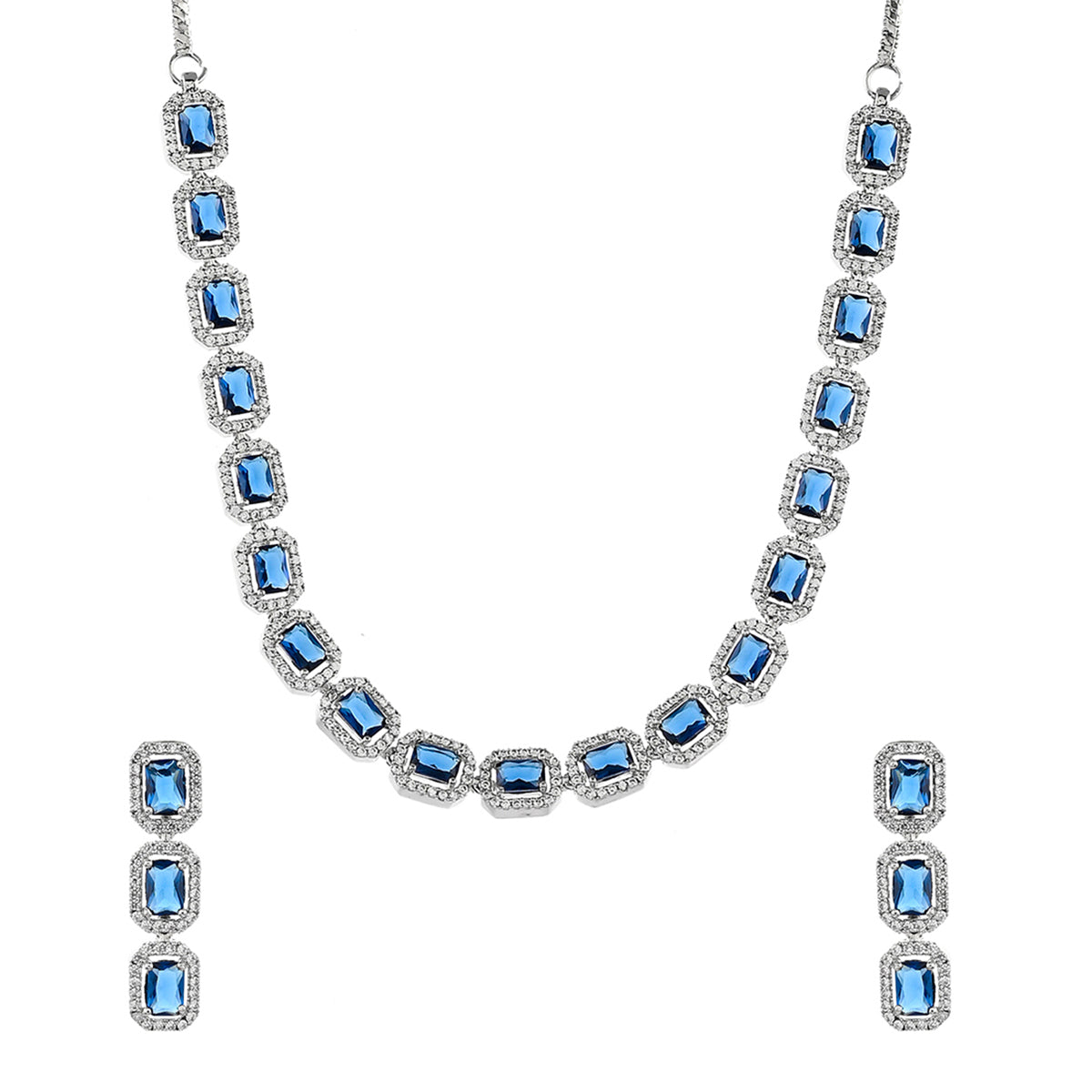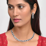 Link pattern zircons adorned jewellery set in a classic design. Made from brass and silver plated, the set will look splendid with designer sarees.