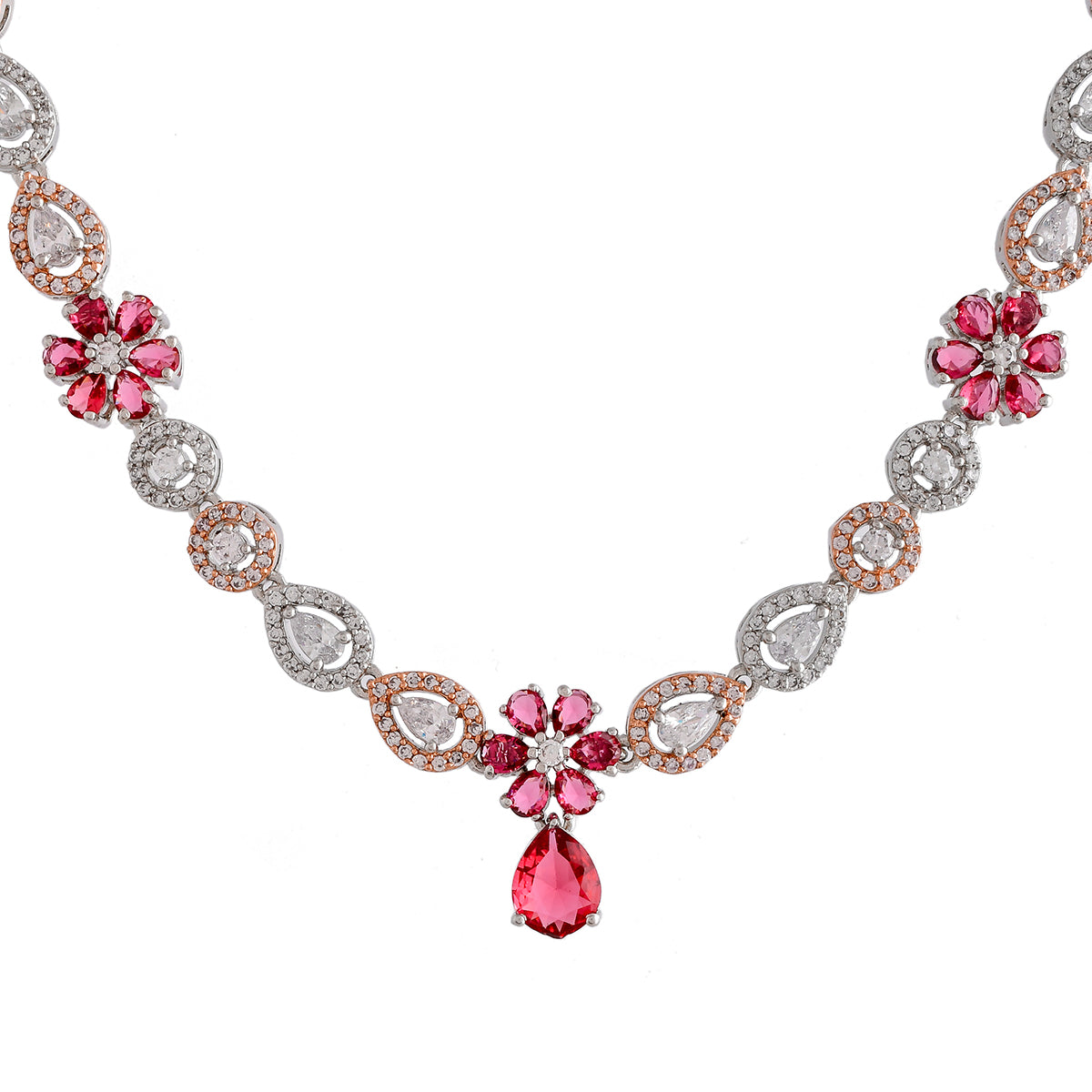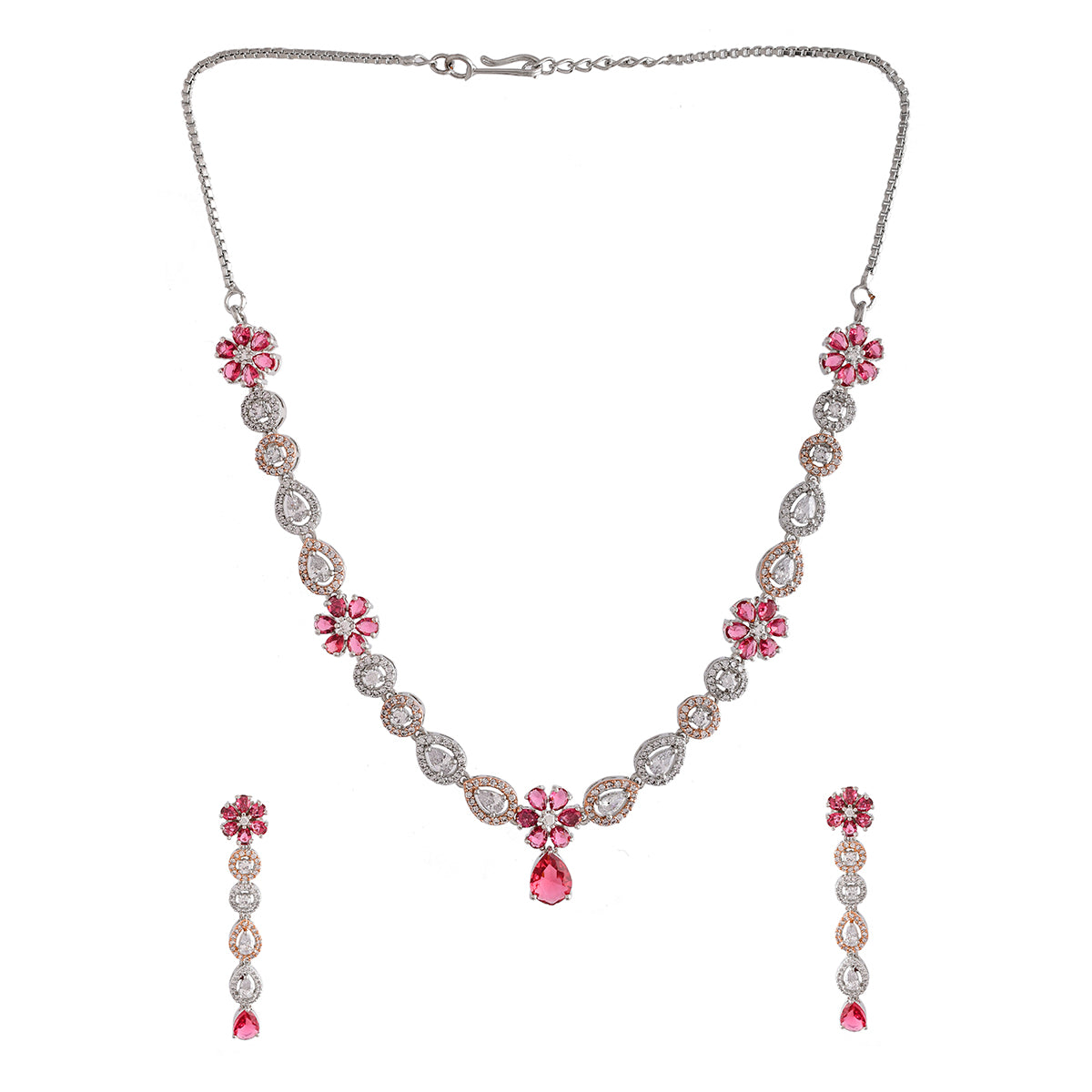 Red and white zirconia gems adorned floral jewellery set, made from brass. Two tone plating adds to the charm of this versatile set.