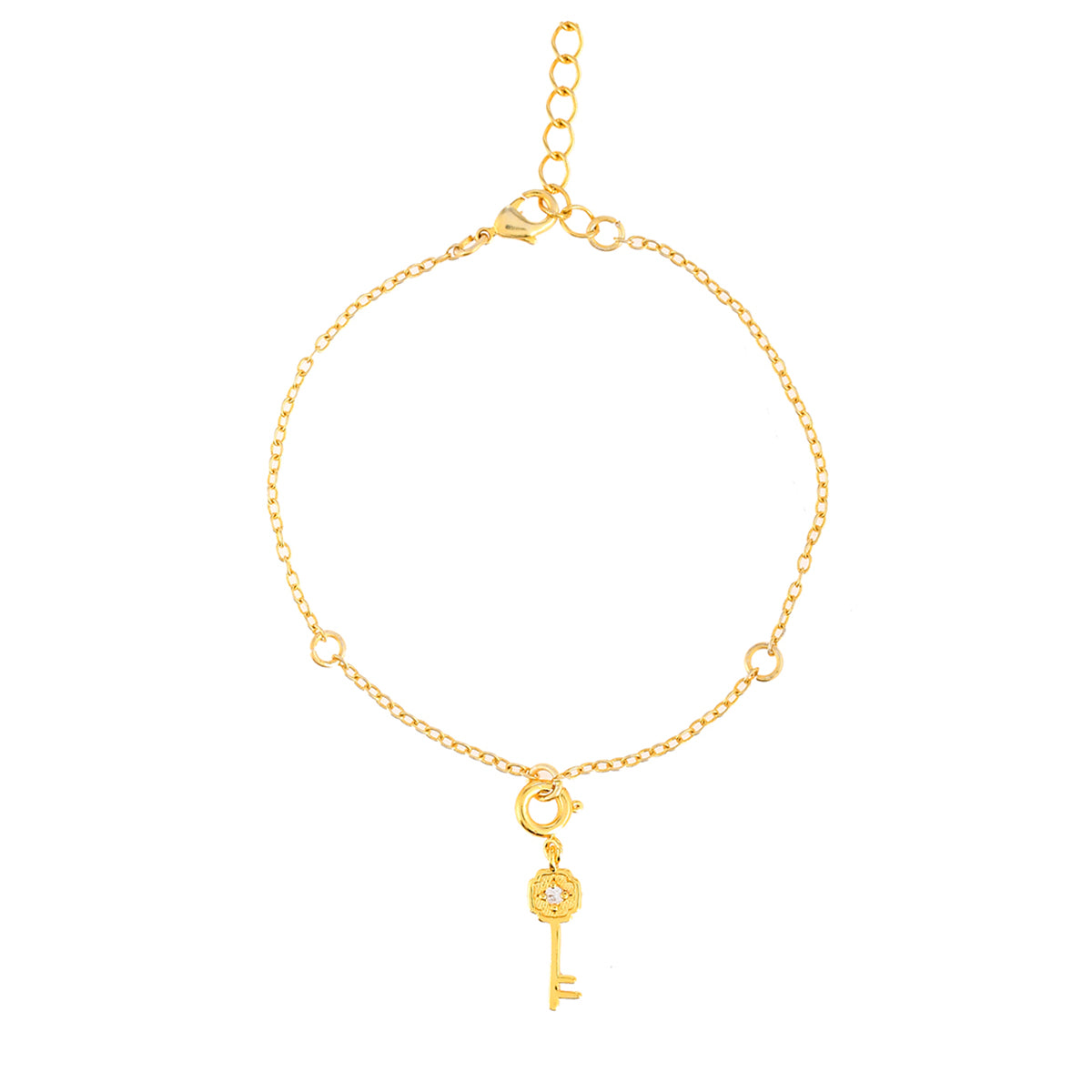 CZ gem studded key shaped charm for watches and bracelet. Made from brass and a good V Day gifting option. Weight (Gms): 0.69 Size (LxW)(Inch): 9.75*1.17 Material: Brass Plating: Yellow Gold Color: Gold Sales Package: 1 Charm,1 Watch Chain,...