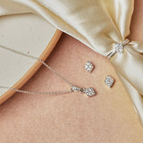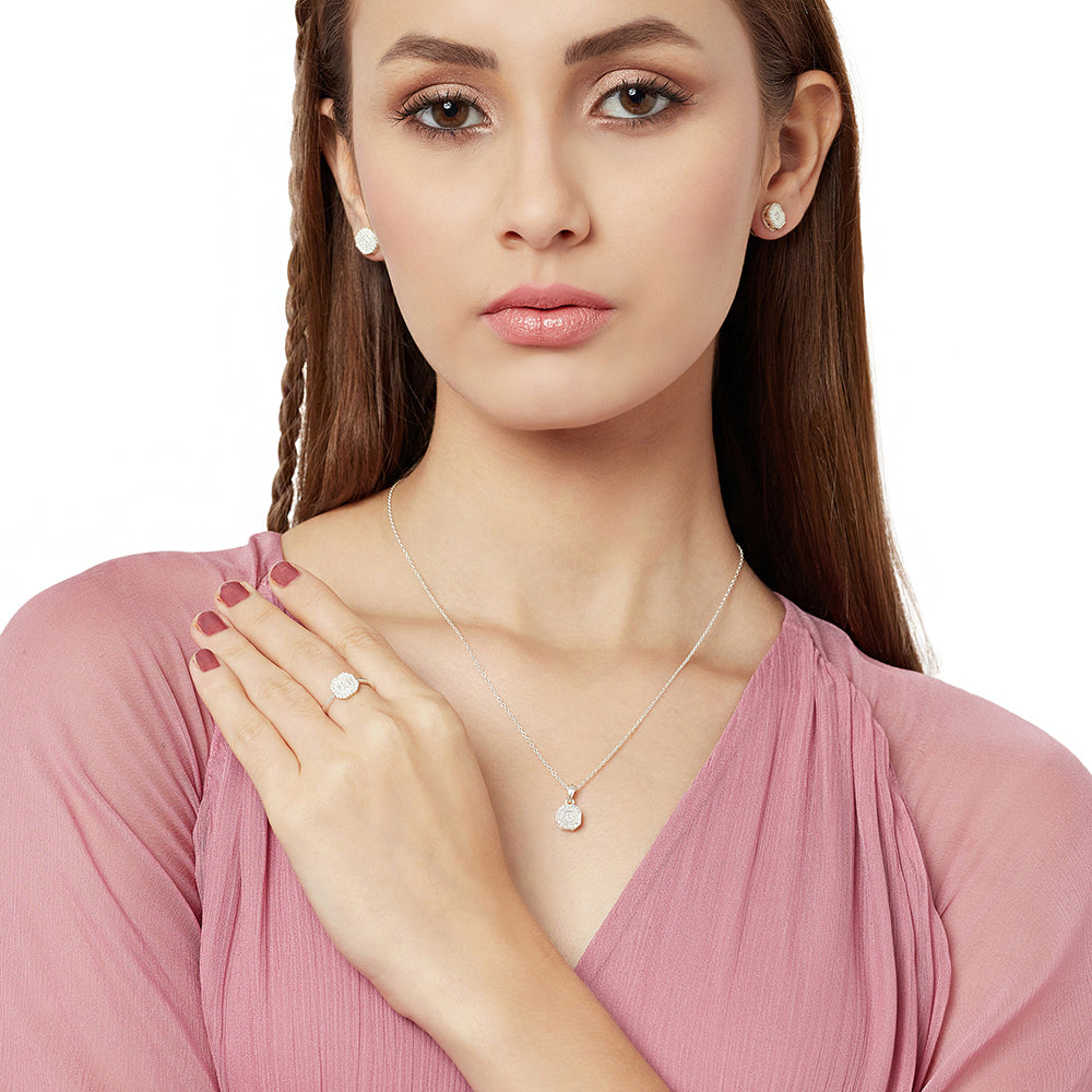 An artistic box set from our Silver CZ Collection featuring a pendant, earring and a ring. You will love the sparkling stones on the perfect silver finish. A versatile accessory.